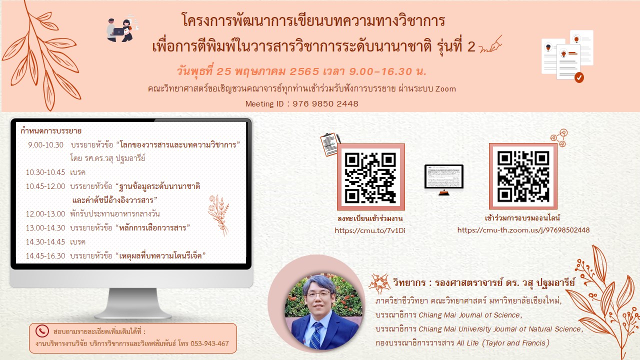 ขอเชิญคณาจารย์ และนักศึกษาระดับบัณฑิตศึกษารับฟังการบรรยาย เรื่อง : โครงการพัฒนาการเขียนบทความทางวิชาการ เพื่อการตีพิมพ์ในวารสารวิชาการระดับนานาชาติ รุ่นที่ 2