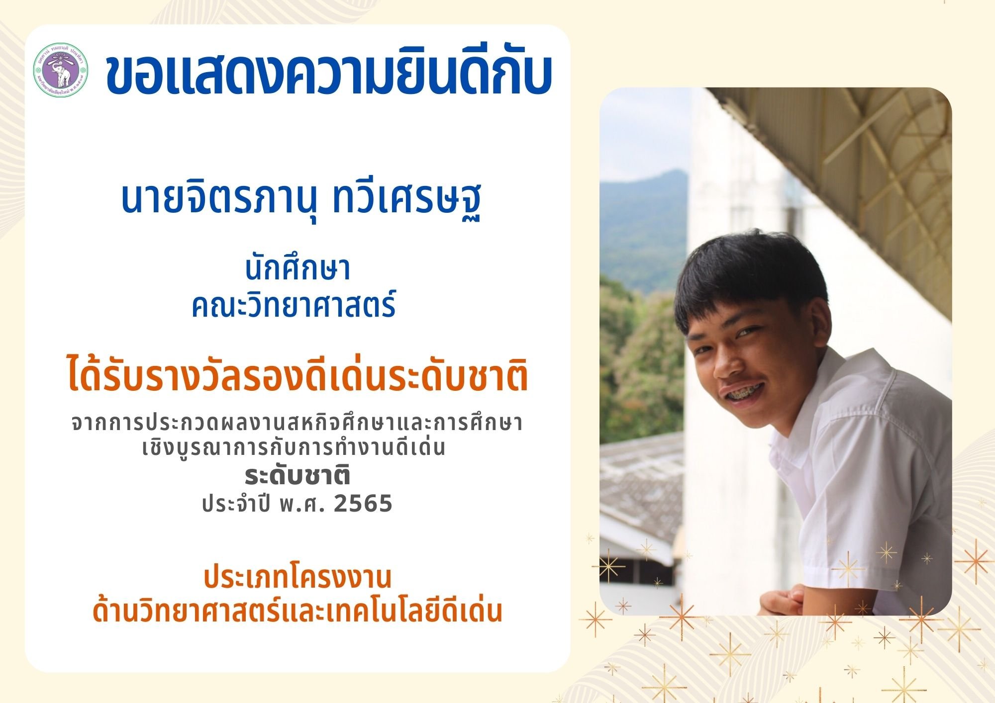 นักศึกษาคณะวิทย์ มช. ได้รับรางวัล รองดีเด่นระดับชาติ การประกวดผลงานสหกิจศึกษาและการศึกษาเชิงบูรณาการ กับการทำงานดีเด่นระดับชาติ ประจำปี 2565