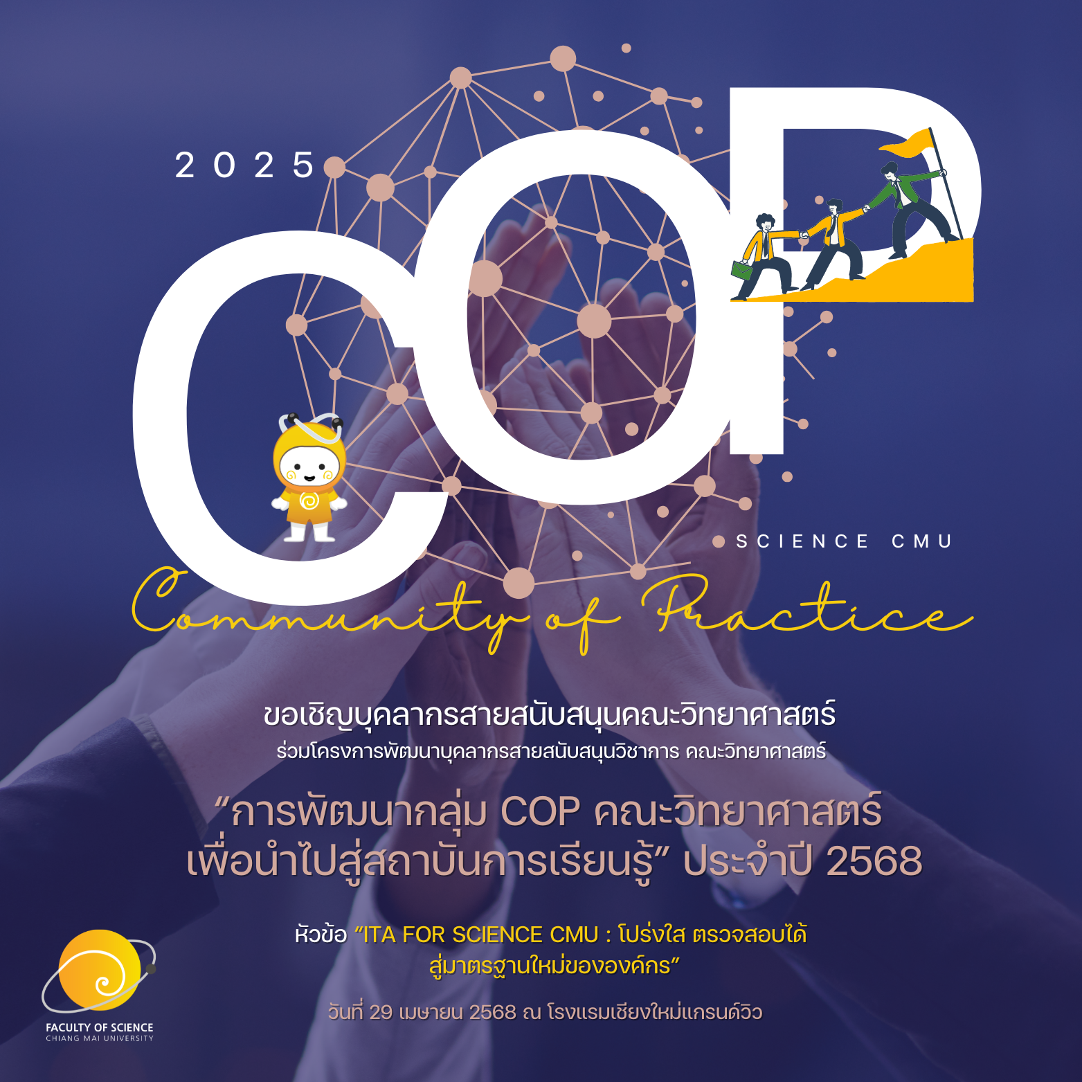 คณะวิทยาศาสตร์ขอเชิญบุคลากรสายสนับสนุนคณะวิทยาศาสตร์ ร่วมโครงการพัฒนาบุคลากรสายสนับสนุนวิชาการ คณะวิทยาศาสตร์ “การพัฒนากลุ่ม CoP คณะวิทยาศาสตร์ เพื่อนำไปสู่สถาบันการเรียนรู้” ประจำปี 2568 หัวข้อ “ITA for Science CMU : โปร่งใส ตรวจสอบได้ สู่มาตรฐานใหม่ขององค์กร” ในวันที่ 29 เมษายน 2568 ณ โรงแรมเชียงใหม่แกรนด์วิว