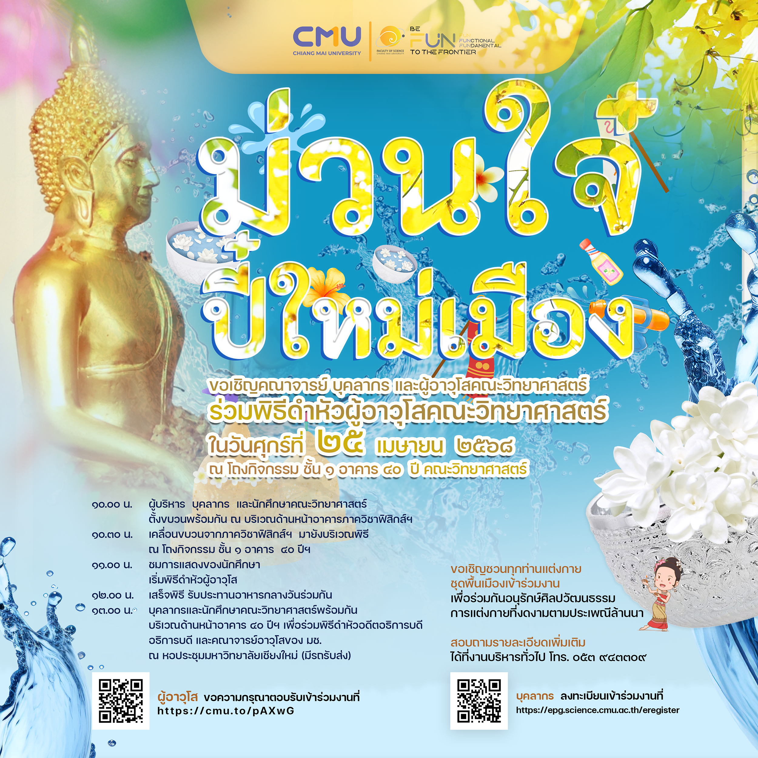 หมู่เฮาจาววิทยา มช. ฮ่วมสืบสานป๋าเวณีปี๋ใหม่เมือง 25 เม.ย.นี้ ขอเชิญคณาจารย์ บุคลากร และผู้อาวุโสคณะวิทยาศาสตร์ ร่วมพิธีดำหัวผู้อาวุโสคณะวิทยาศาสตร์