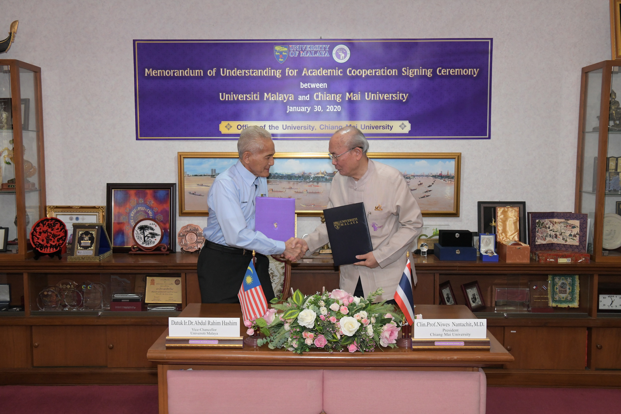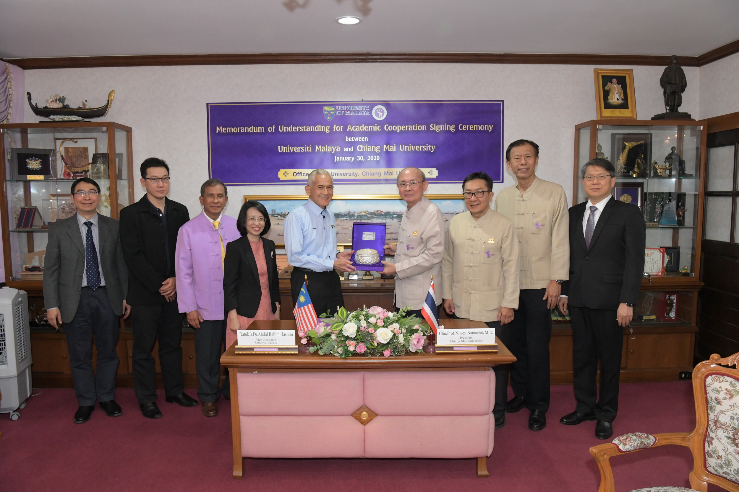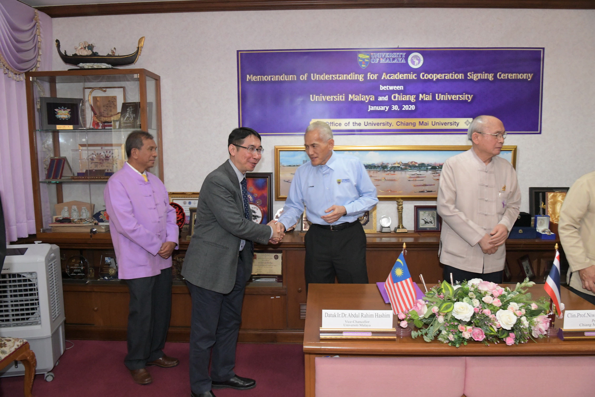 ศาสตราจารย์คลินิก นพ.นิเวศน์ นันทจิต อธิการบดีมหาวิทยาลัยเชียงใหม่ พร้อมด้วยศาสตราจารย์ ดร.ธรณินทร์ ไชยเรืองศรี คณบดีคณะวิทยาศาสตร์ และคณะผู้บริหาร อาจารย์มหาวิทยาลัยเชียงใหม่ ให้การต้อนรับ Datuk IR. Dr. Abdul Rahim Hashim, Vice Chancellor, Universiti Malaya, Malaysia ในโอกาสที่มาเยี่ยมเยือนมหาวิทยาลัยเชียงใหม่ และร่วมลงนามในบันทึกข้อตกลงความร่วมมือทางวิชาการ ระหว่าง มหาวิทยาลัยเชียงใหม่ และ Universiti Malaya, Malaysia ภายใต้ความร่วมมือทางวิชาการของคณะวิทยาศาสตร์ ณ ห้องรับรอง สำนักงานมหาวิทยาลัย มหาวิทยาลัยเชียงใหม่ เมื่อวันพฤหัสบดีที่ 30 มกราคม พ.ศ. 2563