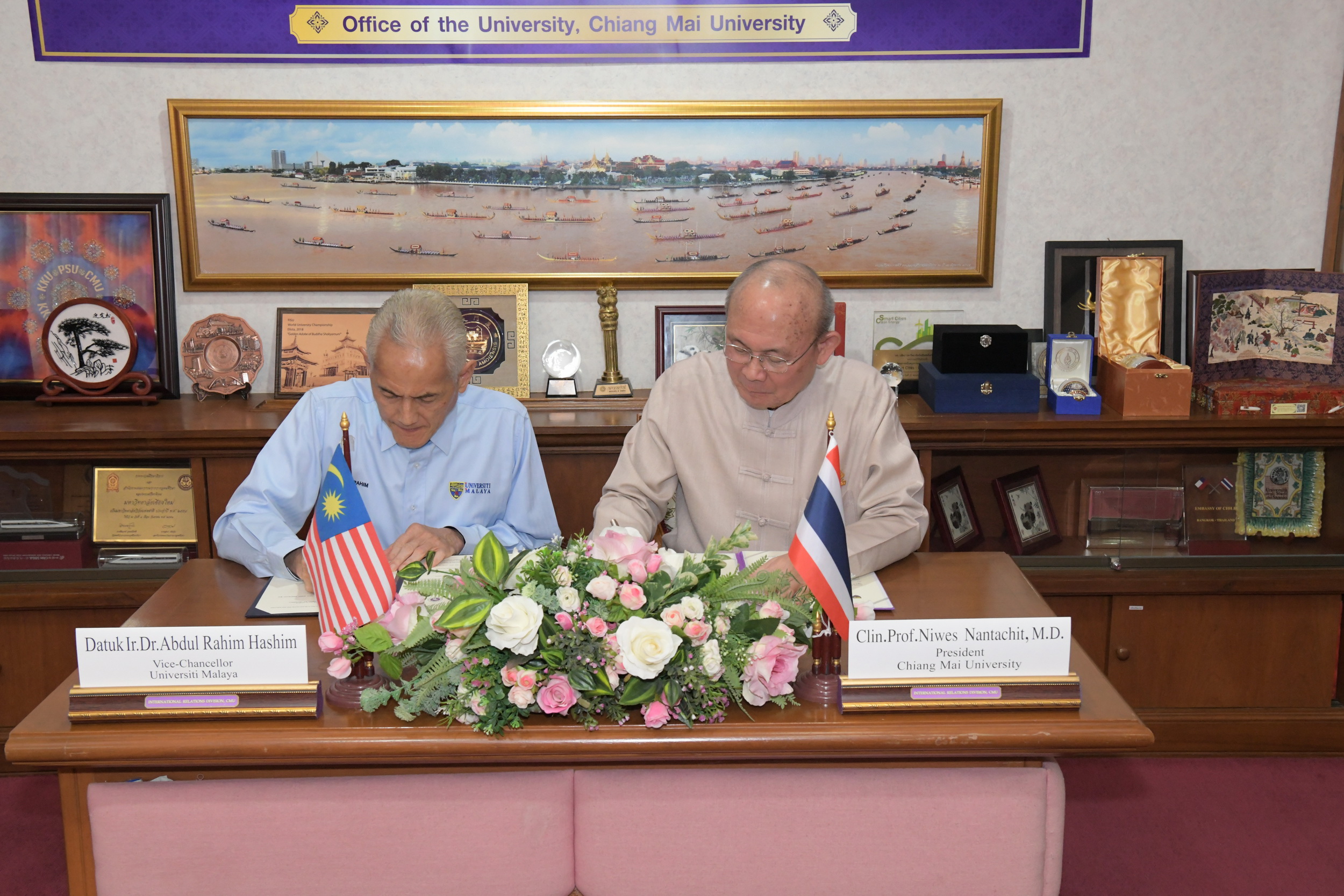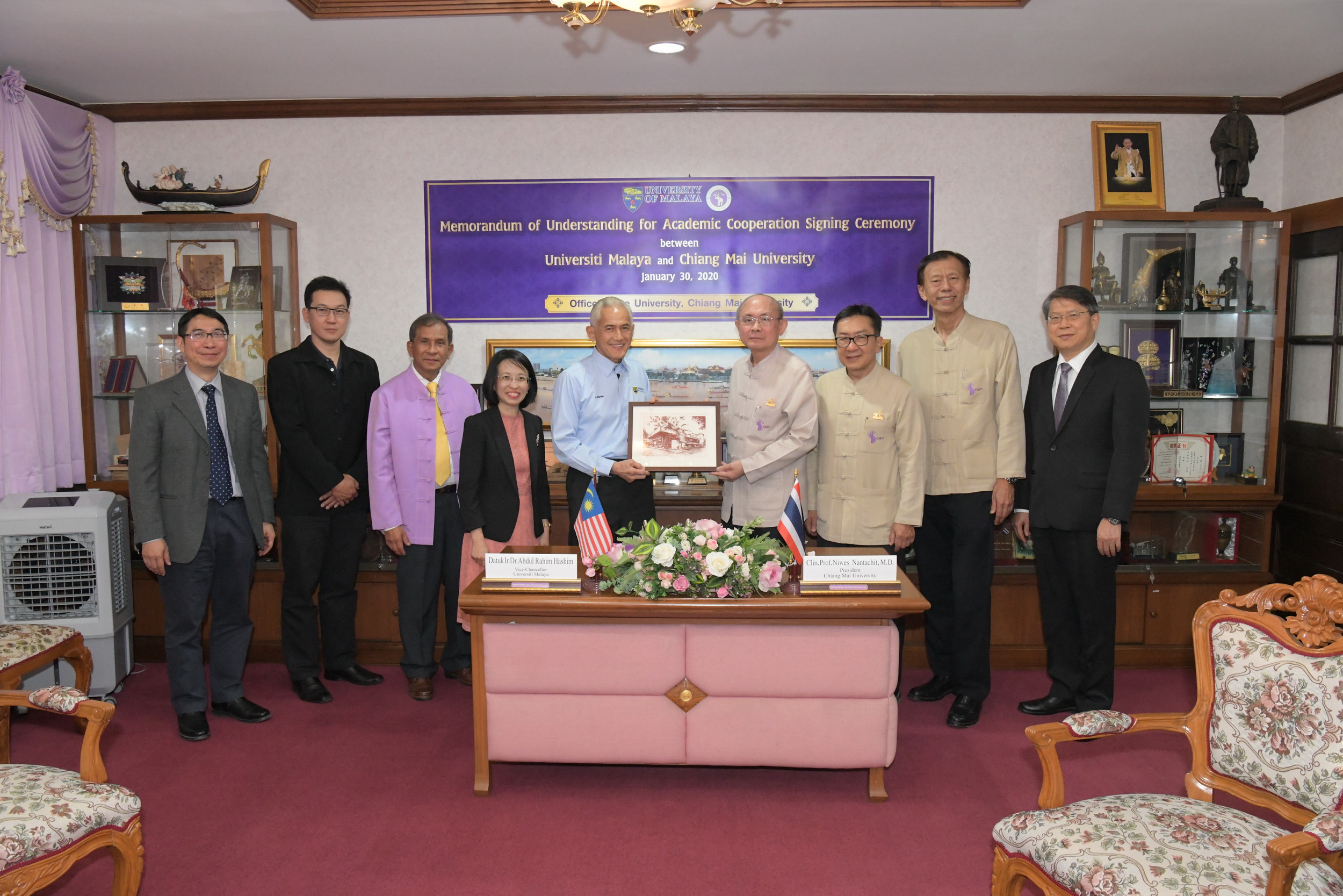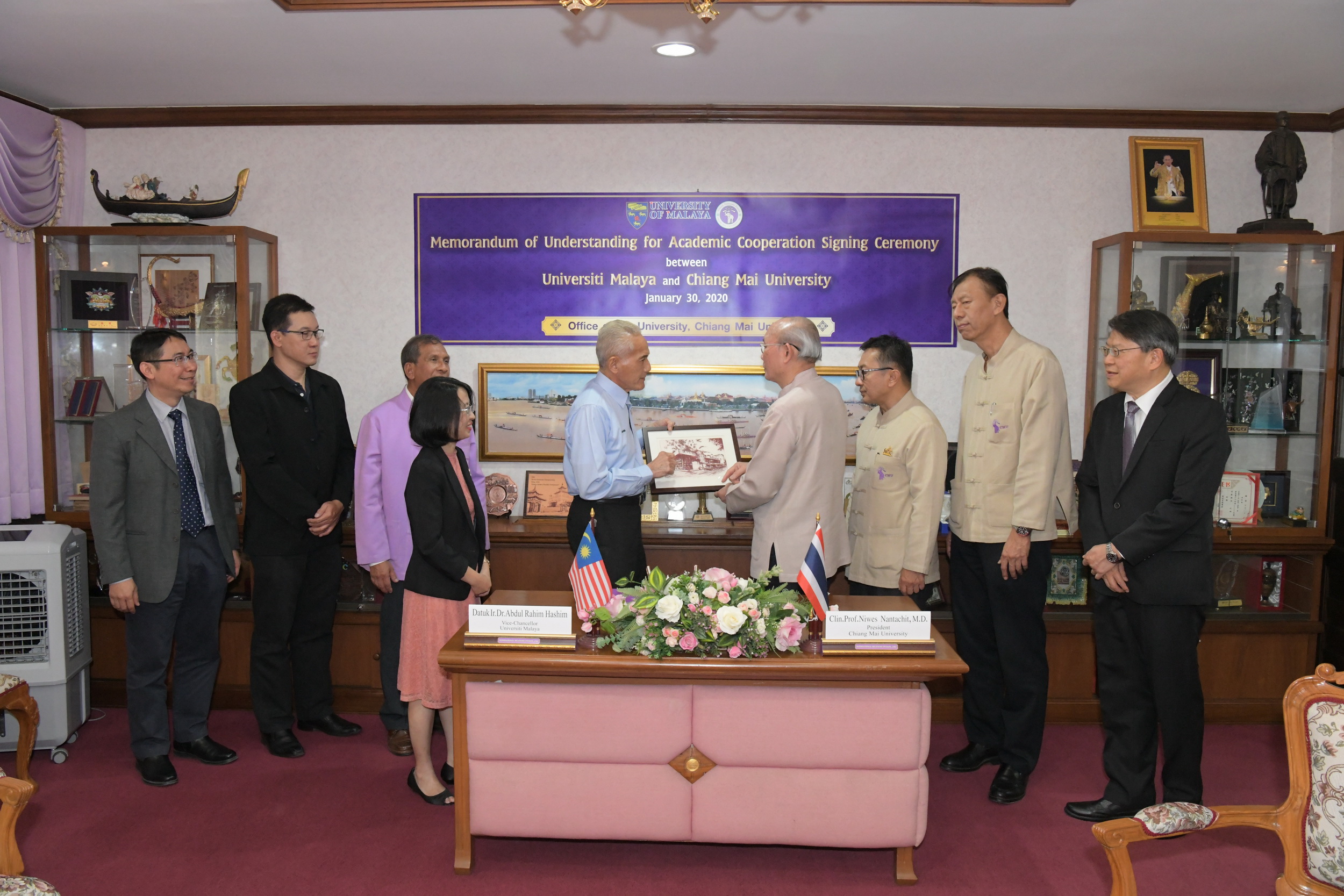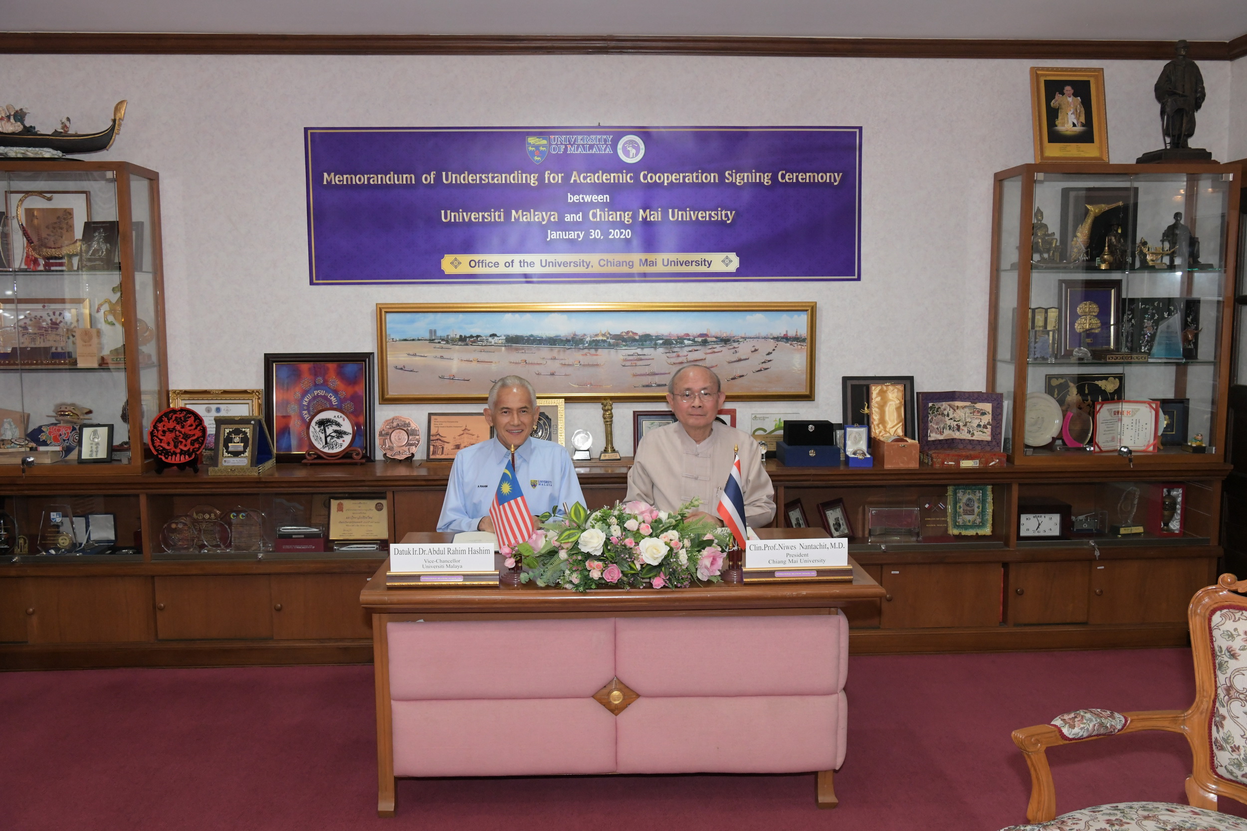 ศาสตราจารย์คลินิก นพ.นิเวศน์ นันทจิต อธิการบดีมหาวิทยาลัยเชียงใหม่ พร้อมด้วยศาสตราจารย์ ดร.ธรณินทร์ ไชยเรืองศรี คณบดีคณะวิทยาศาสตร์ และคณะผู้บริหาร อาจารย์มหาวิทยาลัยเชียงใหม่ ให้การต้อนรับ Datuk IR. Dr. Abdul Rahim Hashim, Vice Chancellor, Universiti Malaya, Malaysia ในโอกาสที่มาเยี่ยมเยือนมหาวิทยาลัยเชียงใหม่ และร่วมลงนามในบันทึกข้อตกลงความร่วมมือทางวิชาการ ระหว่าง มหาวิทยาลัยเชียงใหม่ และ Universiti Malaya, Malaysia ภายใต้ความร่วมมือทางวิชาการของคณะวิทยาศาสตร์ ณ ห้องรับรอง สำนักงานมหาวิทยาลัย มหาวิทยาลัยเชียงใหม่ เมื่อวันพฤหัสบดีที่ 30 มกราคม พ.ศ. 2563