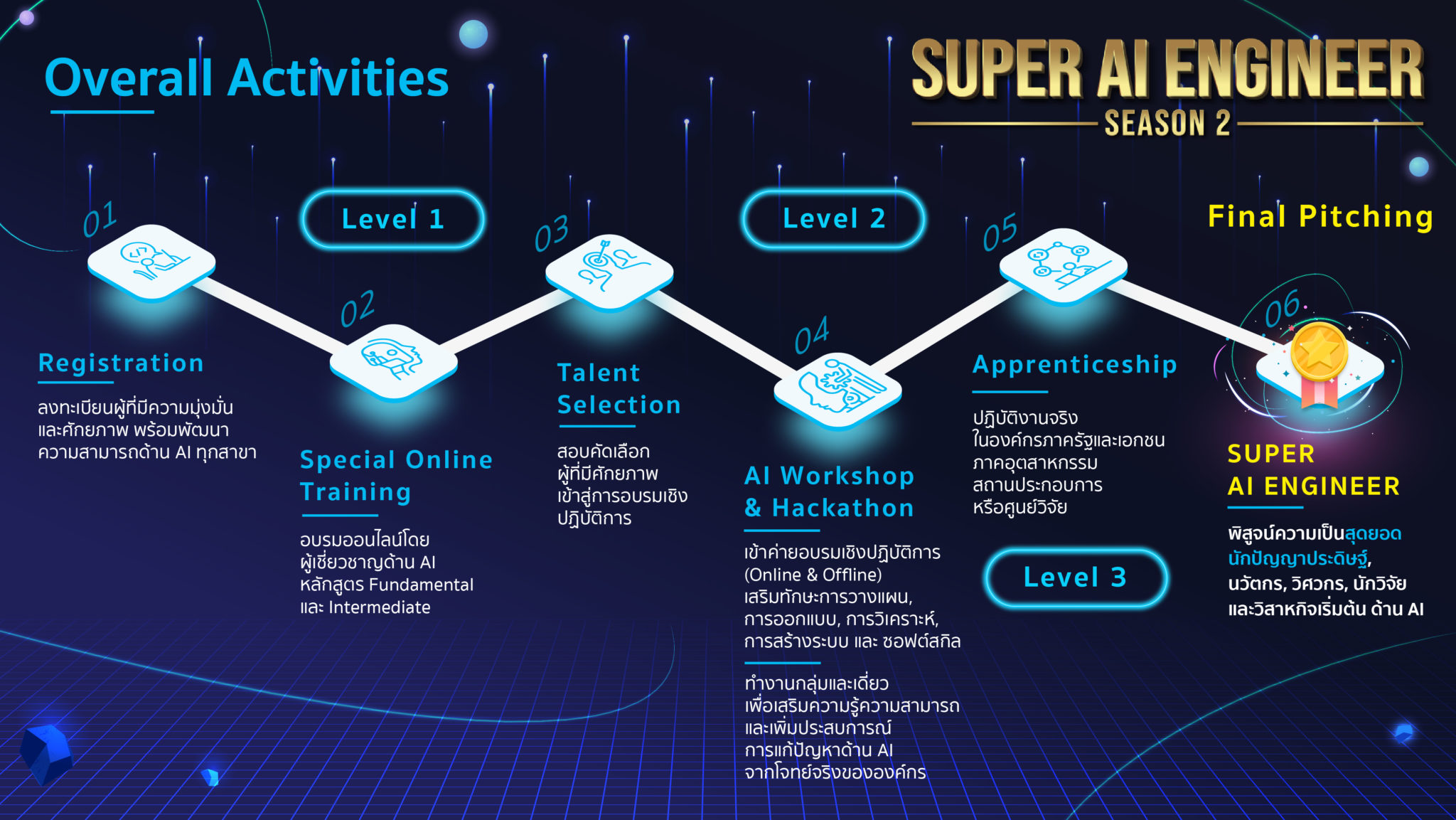 ภาพรวมโครงการจะมีกิจกรรมการฝึกอบรมในรูปแบบ Online และ Onsite โดยเน้นการฝึกปฏิบัติจริง ผู้อบรมจะได้ความรู้ด้านปัญญาประดิษฐ์ตั้งแต่ระดับพื้นฐานถึงระดับสูง สามารถนำความรู้ที่ได้จากการฝึกอบรมไปต่อยอด แก้ปัญหา ออกแบบ วิจัย ทั้งเชิงวิชาการและเชิงธุรกิจ ทางโครงการได้จัดกิจกรรม โดยแบ่งกิจกรรมออกเป็น 3 ช่วง ดังนี้