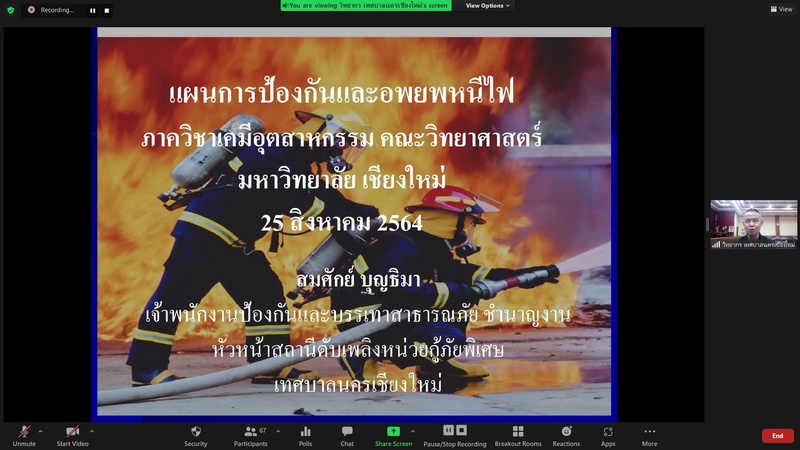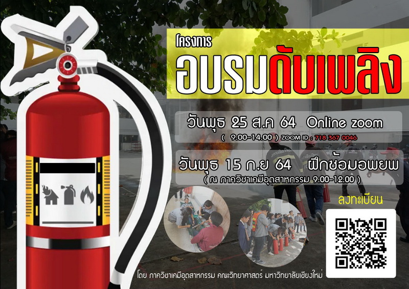 ภาควิชาเคมีอุตสาหกรรม นำโดย ผศ.ดร.วรพงษ์ เทียมสอน หัวหน้าภาควิชาเคมีอุตสาหกรรม จัดอบรมเตรียมความพร้อมการดับเพลิงเบื้องต้นและซ้อมอพยพจากภัยพิบัติ เมื่อวันพุธที่ 25 สิงหาคม 2564 และวันพุธที่ 15 กันยายน 2564 เพื่อให้นักศึกษาและบุคลากร มีความรู้และความเข้าใจเกี่ยวกับการป้องกันและระงับอุบัติภัยในเบื้องต้น และเป็นการฝึกทักษะการใช้อุปกรณ์และเครื่องมือดับเพลิง และการปฐมพยาบาลเบื้องต้น โดยการอบรมมีทั้งภาคทฤษฎีและภาคปฏิบัติ ทั้งรูปแบบ Onsite และ Online โดยวิทยากรผู้เชี่ยวชาญจากเทศบาลนครเชียงใหม่
