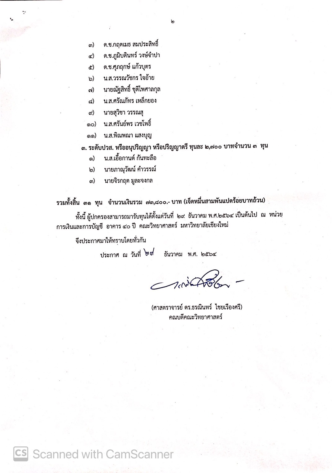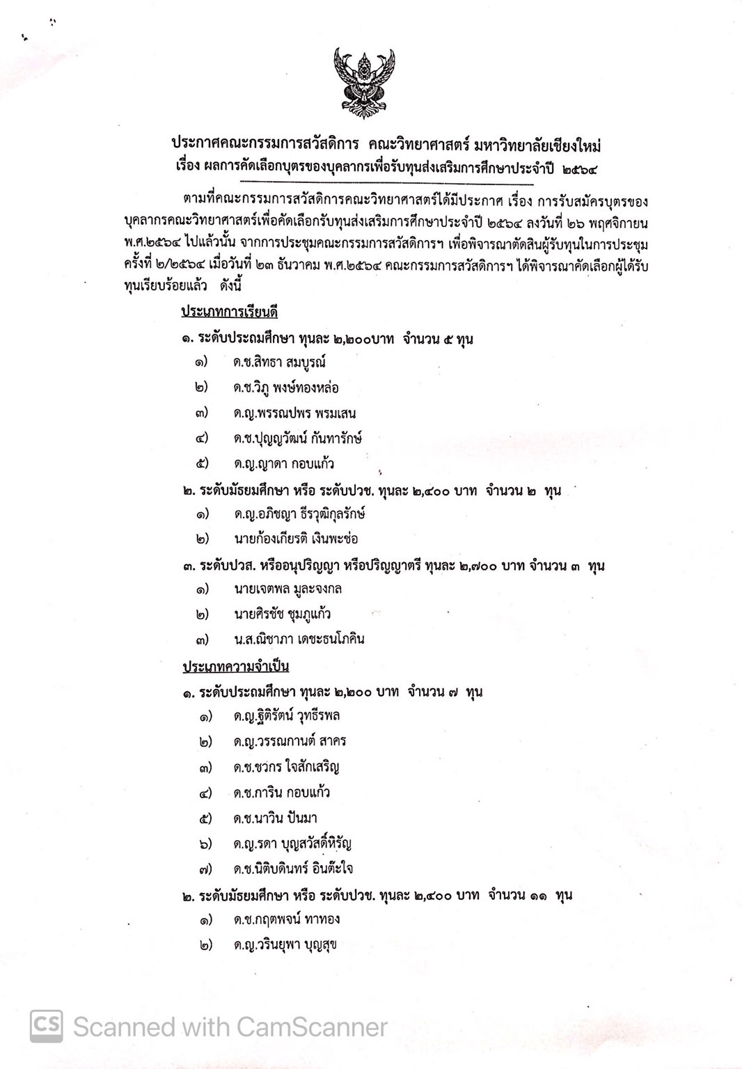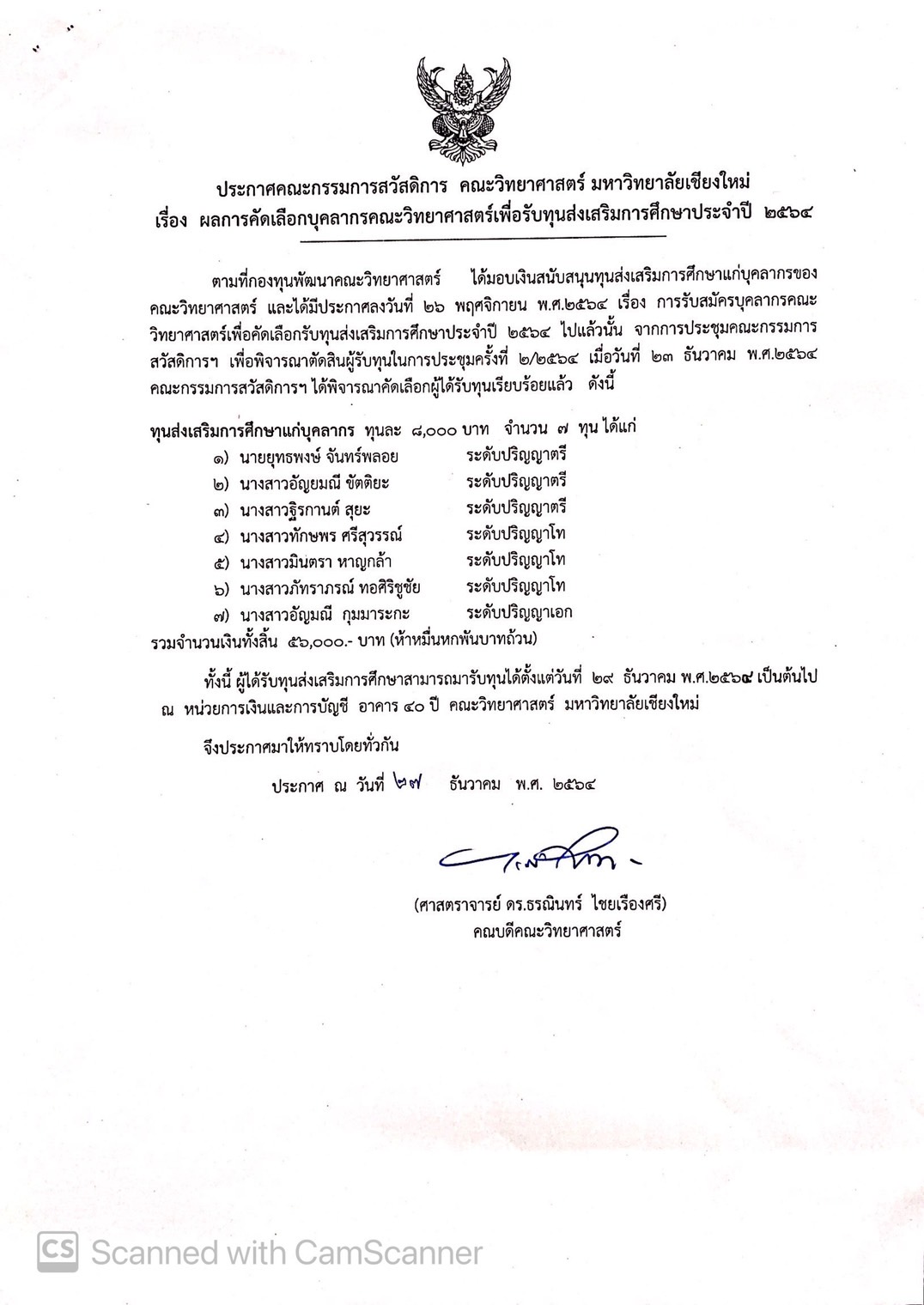 ประกาศผลการคัดเลือกผู้สมควรได้รับทุนส่งเสริมการศึกษาแก่บุคลากร และบุตรบุคลากร คณะวิทยาศาสตร์ ประจำปี 2564