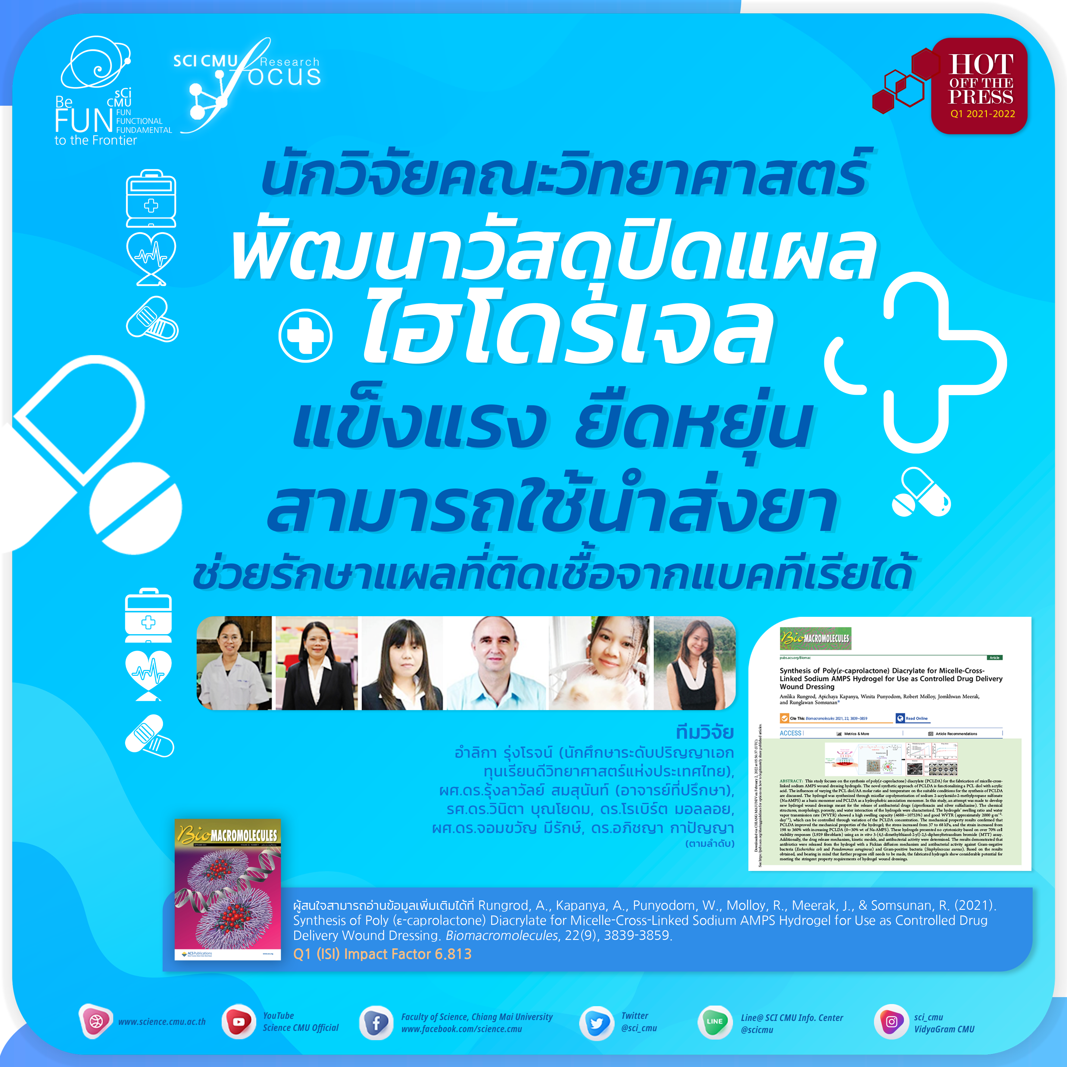 กลุ่มวิจัยคณะวิทยาศาสตร์ นำทีมโดย ผศ.ดร. รุ้งลาวัลย์ สมสุนันท์ ได้พัฒนาการสังเคราะห์ตัวเชื่อมขวางสายโซ่ นั่นคือ พอลิ (เอปซิลอน-คาโปรแลกโทน) ไดอะคริเลท (PCLDA) เพื่อปรับปรุงคุณสมบัติเชิงกลของพอลิ(โซเดียม 2-อะคริลามิโด-2-เมทิล พรอเพนซัลโซเนต) (P(Na-AMPS)) ไฮโดรเจล ให้มีความแข็งแรงและความยืดหยุ่นมากขึ้น อีกทั้งวัสดุปิดแผลไฮโดรเจลที่สังเคราะห์นี้ สามารถใช้นำส่งยาเพื่อช่วยในการรักษาแผลที่ติดเชื้อจากแบคทีเรียได้อีกด้วย และงานวิจัยถูกตีพิมพ์ในวารสารชั้นนำ Biomacromolecules ในปี 2021 (Q1 (ISI) Impact Factor 6.813 )
