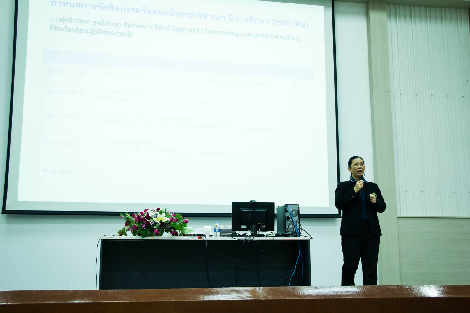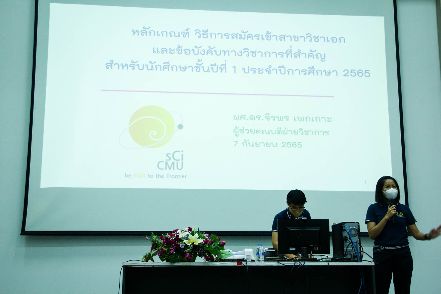 คณะวิทยาศาสตร์จัดกิจกรรมวันแนะนำสาขาวิชาเอก ปีการศึกษา 2565 เพื่อให้นักศึกษาได้รับทราบข้อมูล หลักเกณฑ์ และขั้นตอนการจัดนักศึกษาเข้าสาขาวิชาเอก รวมทั้งข้อมูลอื่นๆ ที่เกี่ยวข้อง เพื่อเป็นแนวทางในการเลือกสาขาวิชาเอก และการประกอบอาชีพในอนาคต โดยได้รับเกียรติจาก รองคณบดีฝ่ายวิชาการ ผู้ช่วยศาสตราจารย์ ดร.ภควรรณ พวงสมบัติ เป็นประธานเปิดกิจกรรม เมื่อวันที่ 7 กันยายน 2565 ณ ห้องบรรยาย SCB2100 อาคาร 40 ปี คณะวิทยาศาสตร์