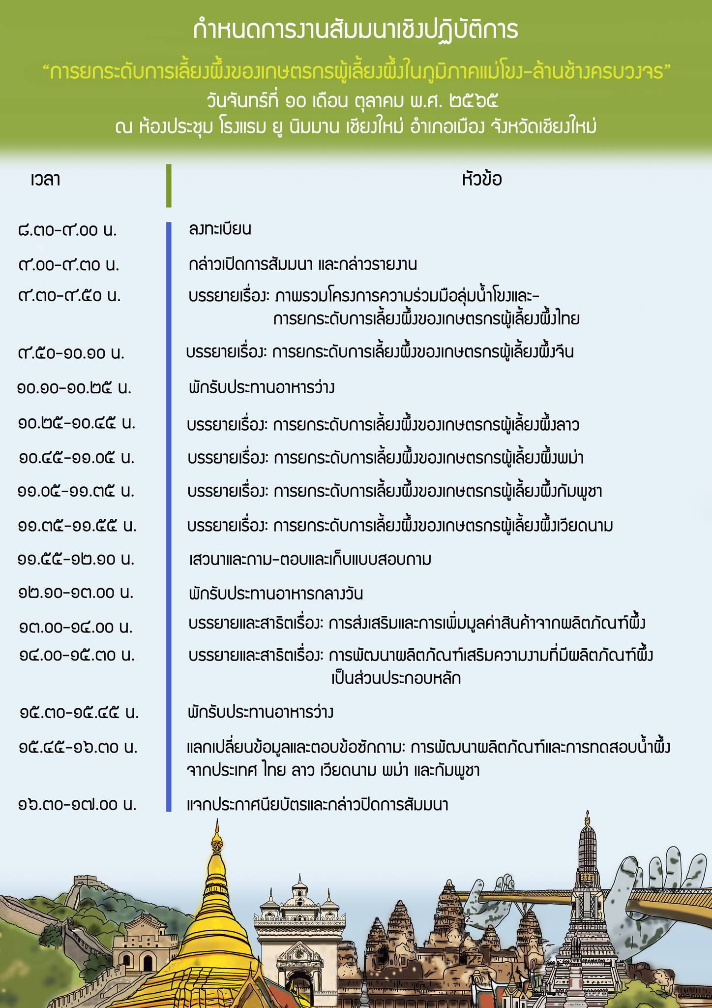 ขอเชิญชวนเกษตรกรผู้เลี้ยงผึ้งทุกท่านเข้าร่วมงานสัมมนาเชิงปฏิบัติการ เรื่อง “การยกระดับการเลี้ยงผึ้งของเกษตรกรผู้เลี้ยงผึ้งในภูมิภาคแม่โขง-ล้านช้างครบวงจร” เพื่อกำหนดแนวทางปฏิบัติการค้าข้ามพรมแดนระหว่างภูมิภาคแม่โขง-ล้านช้างและข้อมูลทางเศรษฐศาสตร์ สำหรับการจัดการเลี้ยงผึ้งรวมถึงการพัฒนาผลิตภัณฑ์จากผึ้งในระดับภูมิภาค จัดขึ้นในวันจันทร์ที่ 10 เดือน ตุลาคม พ.ศ. 2565 ณ ห้องประชุม โรงแรม ยู นิมมาน เชียงใหม่ อำเภอเมือง จังหวัดเชียงใหม่