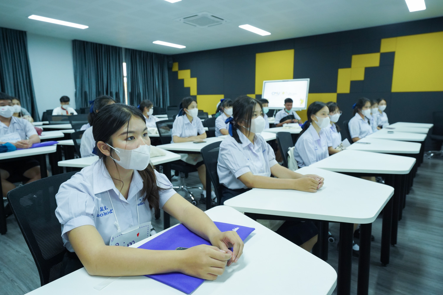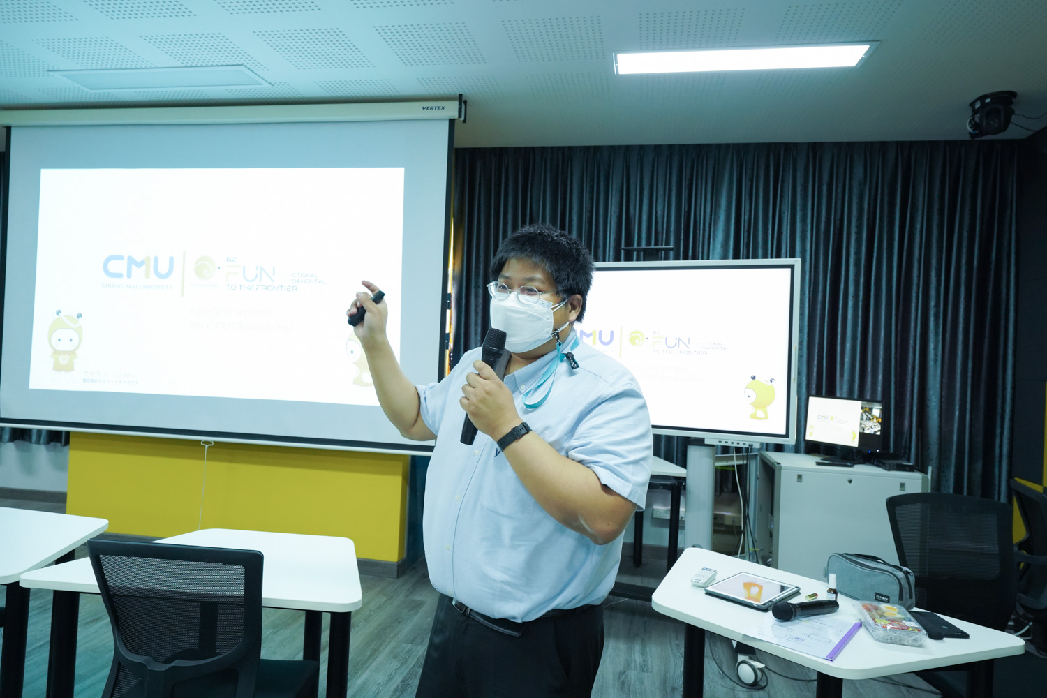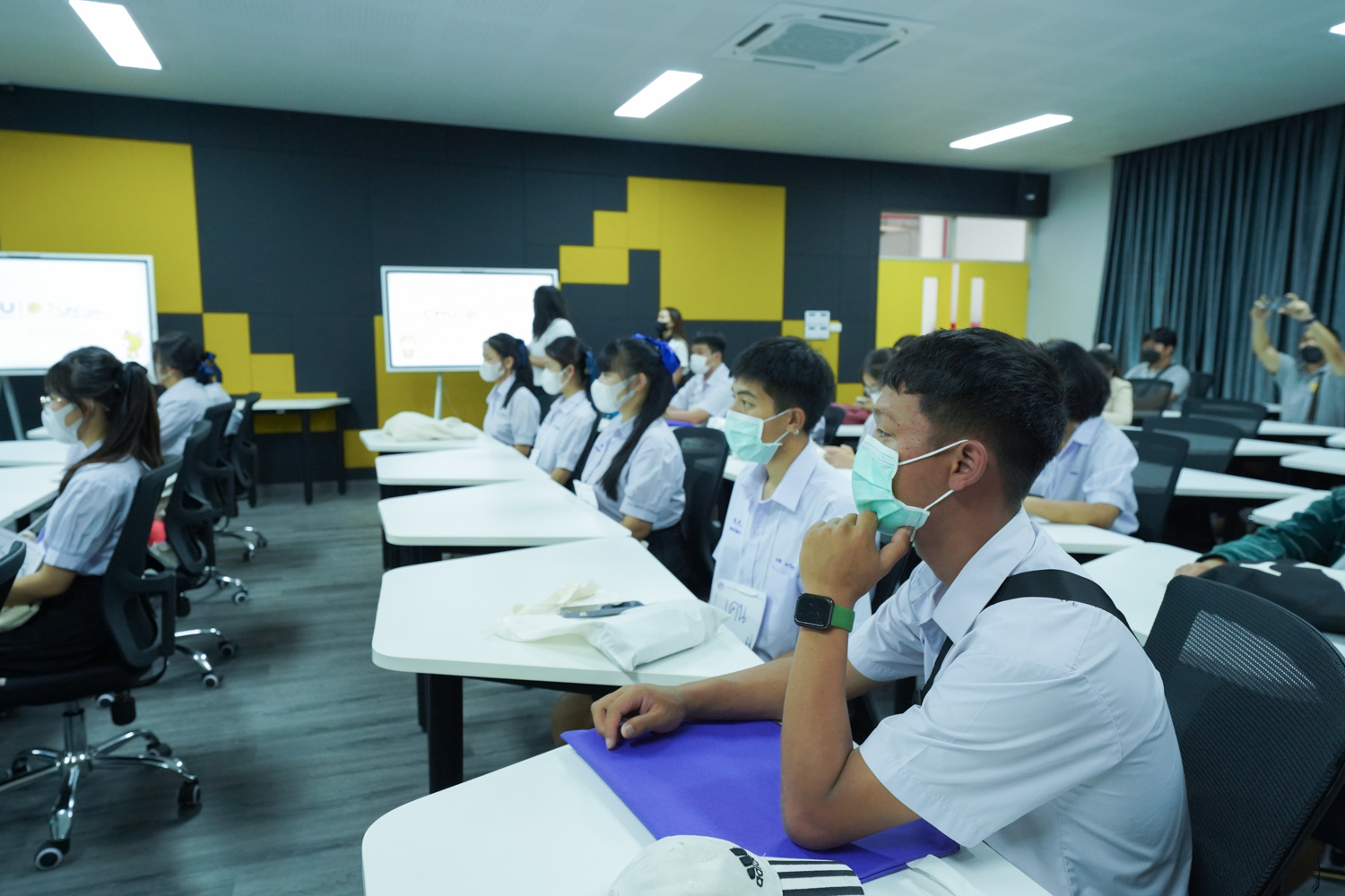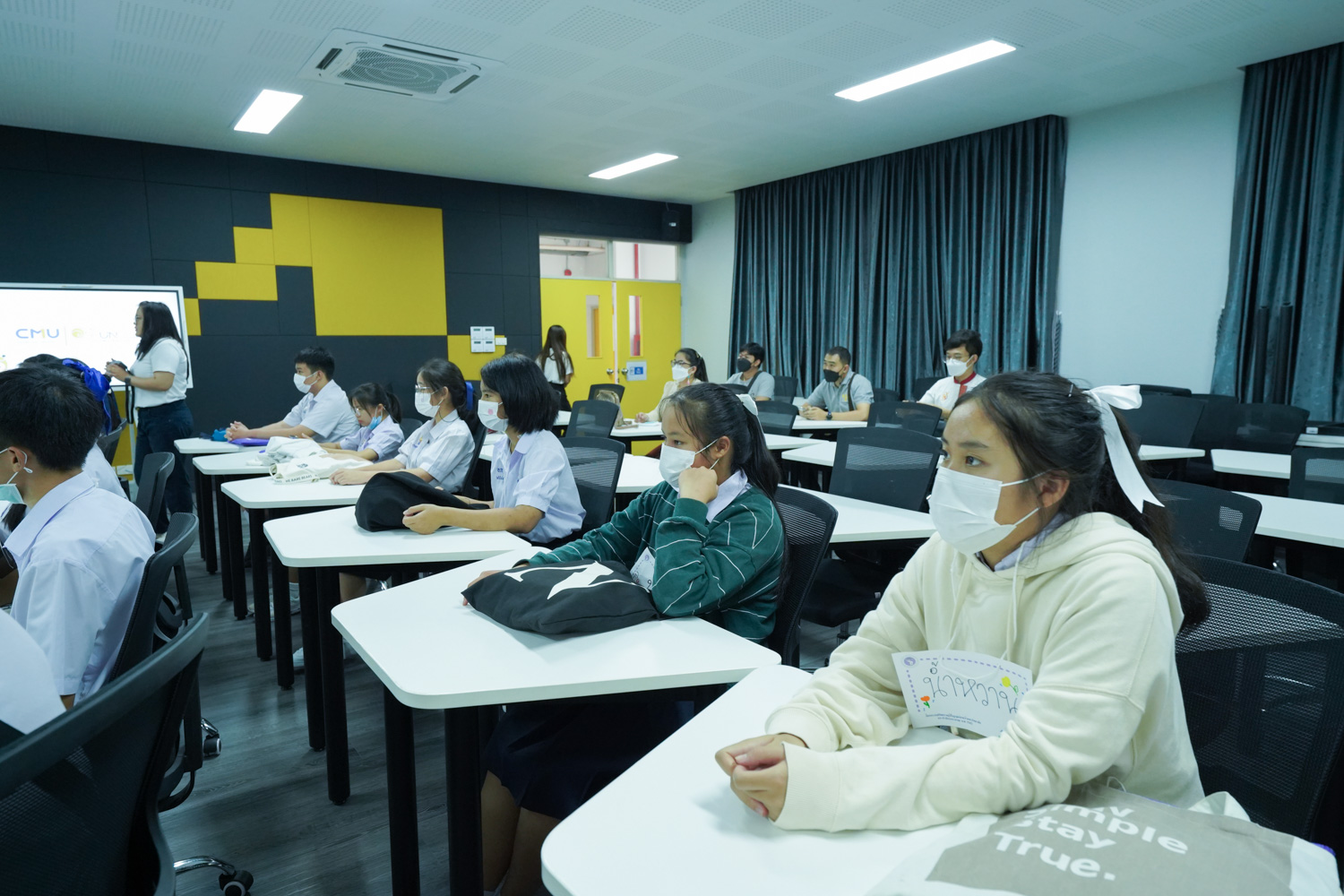 วันที่ 23 กันยายน 2565 ผู้ช่วยศาสตราจารย์ ดร.ศุภณัฐ ชัยดี ผู้ช่วยคณบดีฝ่ายสื่อสารองค์กร คณะวิทยาศาสตร์ กล่าวต้อนรับ พร้อมกับบรรยายแนะนำหลักสูตร และภาพรวมการเรียนการสอนของคณะวิทยาศาสตร์ ให้แก่นักเรียนจากโรงเรียนในเขตพื้นที่ห่างไกลของจังหวัดเชียงใหม่ ในโครงการเสริมความรู้พื้นฐานก่อนเข้ามหาวิทยาลัยตามแนวพระราชดำริของสมเด็จพระกนิษฐาธิราชเจ้า กรมสมเด็จพระเทพรัตนราชสุดาฯ สยามบรมราชกุมารี ซึ่งดำเนินการโดยสำนักบริการวิชาการ มหาวิทยาลัยเชียงใหม่ จำนวน 32 คน ที่มาเยี่ยมชม และศึกษาดูงานด้านการเรียนการสอนของคณะฯ ณ ห้อง Smart Classroom ชั้น 5 อาคาร 40 ปี คณะวิทยาศาสตร์ เพื่อให้นักเรียนมีข้อมูลประกอบการตัดสินใจศึกษาต่อในระดับอุดมศึกษาอย่างรอบด้าน