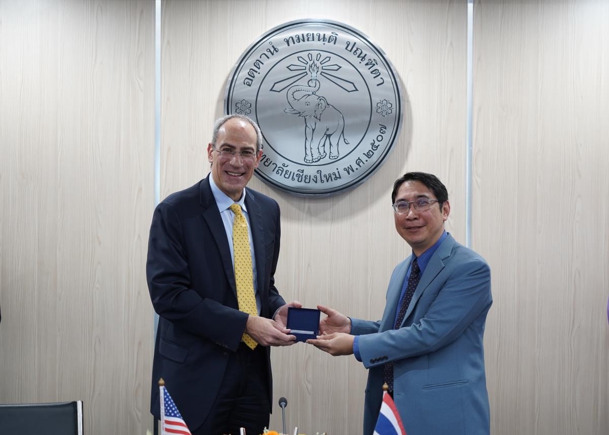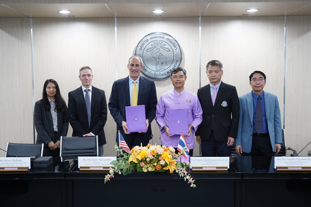 ศาสตราจารย์ เชี่ยวชาญพิเศษ ดร.ธรณินทร์ ไชยเรืองศรี คณบดีคณะวิทยาศาสตร์ พร้อมด้วยคณะผู้บริหารมหาวิทยาลัยเชียงใหม่ ซึ่งนำโดย ศาสตราจารย์ ดร.นายแพทย์พงษ์รักษ์ ศรีบัณฑิตมงคล อธิการบดีมหาวิทยาลัยเชียงใหมม่ ร่วมให้การต้อนรับ Michael Alexander, D.M.A , Chancellor, The University of Wisconsin-Green Bay, USA และคณะฯ ในโอกาสที่มาเยี่ยมเยือนมหาวิทยาลัยเชียงใหม่ และร่วมลงนามบันทึกข้อตกลงความร่วมมือทางวิชาการระหว่างมหาวิทยาลัยเชียงใหม่ และ The University of Wisconsin-Green Bay, USA โดยความร่วมมือของคณะวิศวกรรมศาสตร์และคณะวิทยาศาสตร์ ในหลักสูตรการเรียนการสอน การแลกเปลี่ยนนักศึกษา การประชุมสัมมนาทางวิชาการต่างๆ ซึ่งมีระยะเวลาดำเนินการร่วมกันภายใน 5 ปี ณ ห้องประชุมพระยาศรีวิสารวาจา สำนักงานมหาวิทยาลัย มหาวิทยาลัยเชียงใหม่ เมื่อวันศุกร์ที่ 6 มกราคม พ.ศ.2566