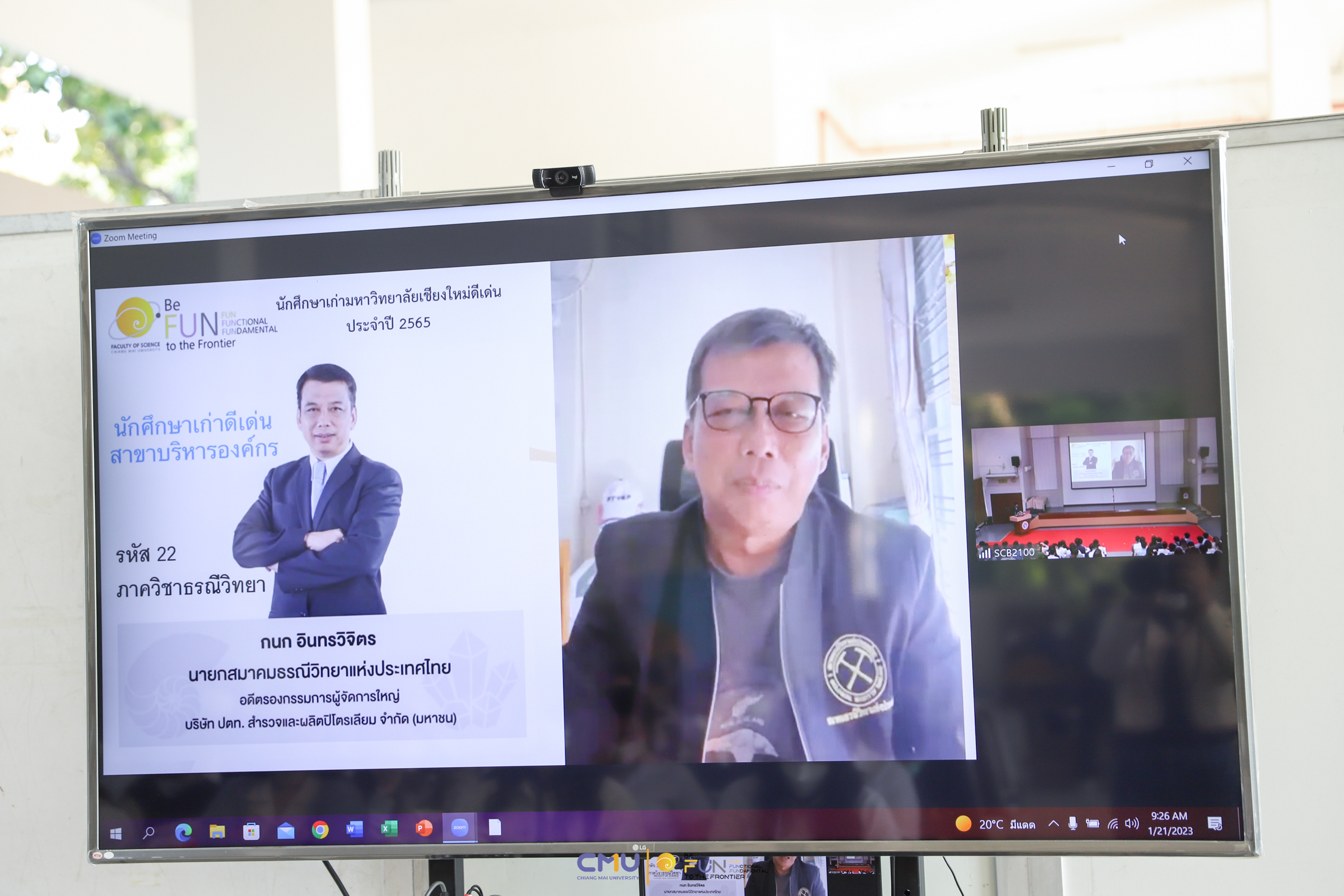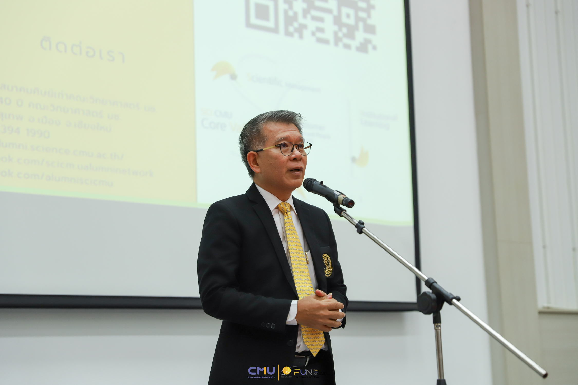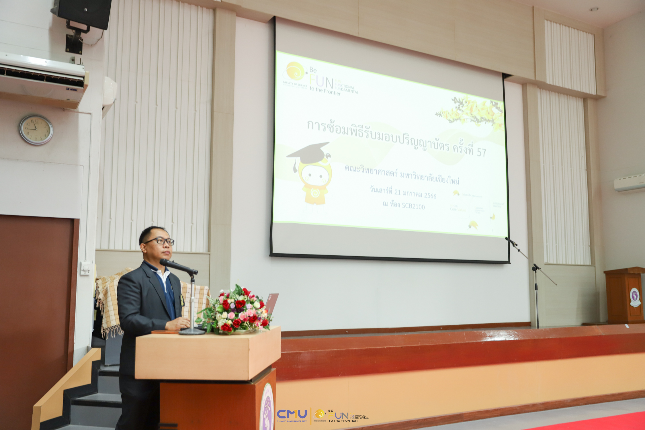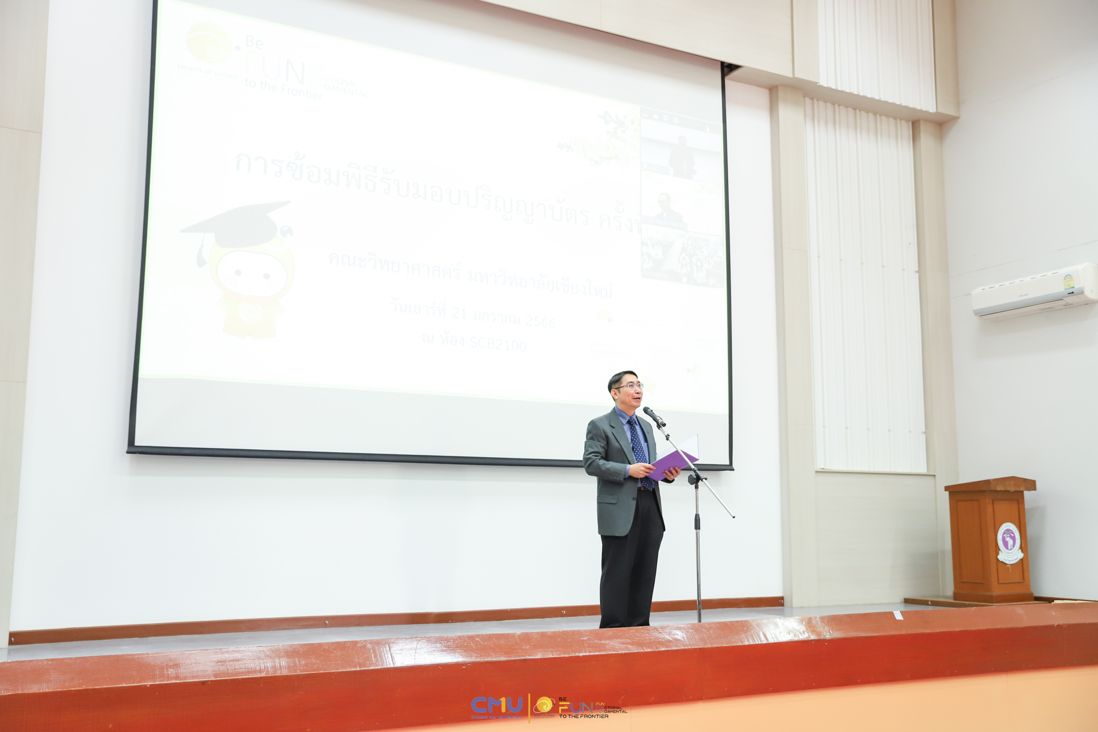 ศาสตราจารย์ เชี่ยวชาญพิเศษ ดร.ธรณินทร์ ไชยเรืองศรี คณบดีคณะวิทยาศาสตร์ และ ดร.สมหมาย เตชวาล นายกสมาคมนักศึกษาเก่าคณะวิทยาศาสตร์ กล่าวต้อนรับและแสดงความยินดีกับบัณฑิตใหม่ของคณะวิทยาศาสตร์ ที่จะเข้ารับมอบปริญญาบัตร ครั้งที่ 57 ของมหาวิทยาลัยเชียงใหม่ ในการฝึกซ้อมเข้ารับมอบปริญญาบัตรของบัณฑิตคณะวิทยาศาสตร์ เมื่อวันที่ 21 มกราคม 2566 ณ ห้องบรรยาย SCB2100 และลานอะตอม อาคาร 40 ปี คณะวิทยาศาสตร์