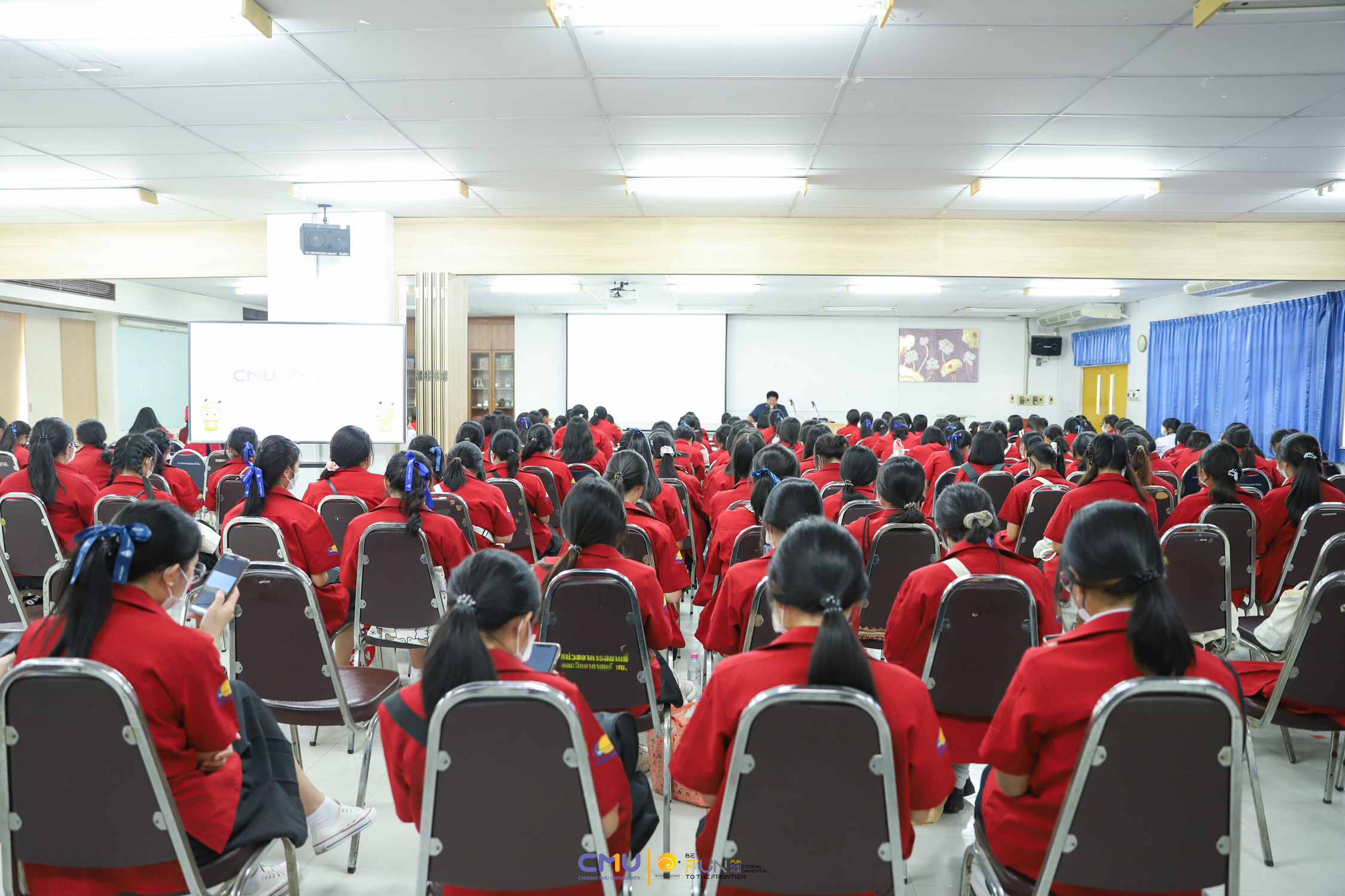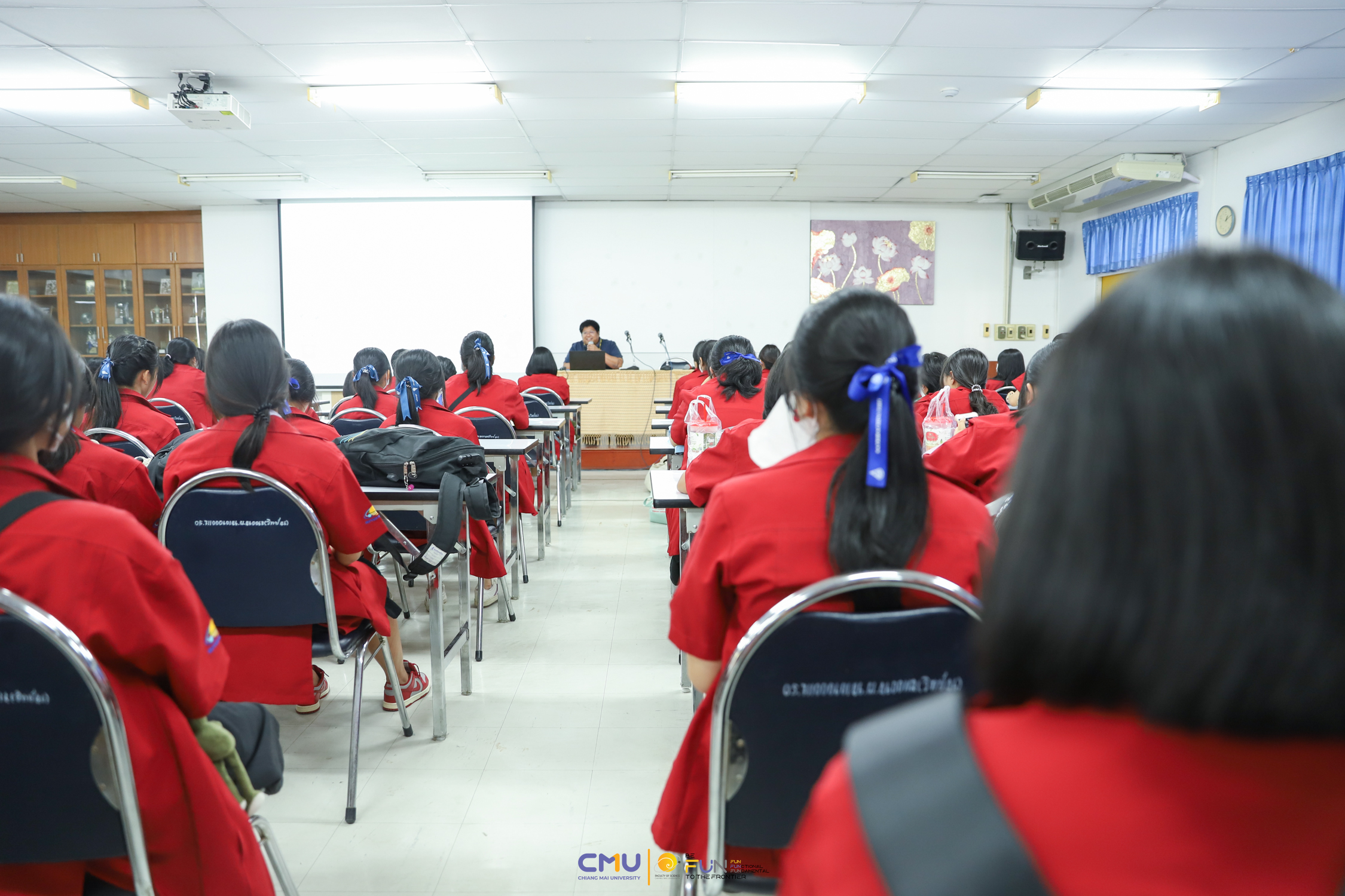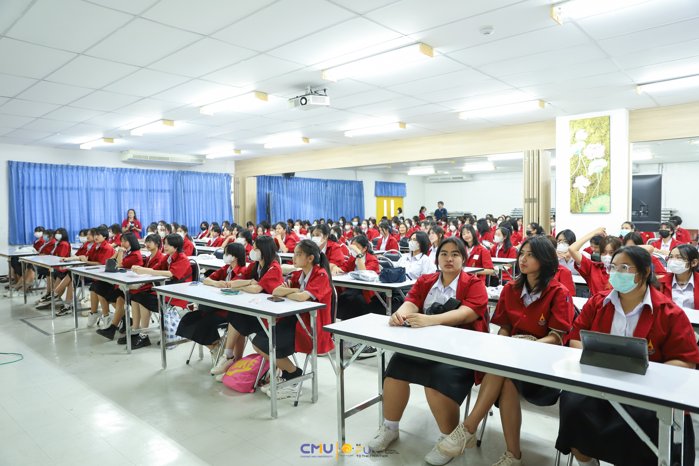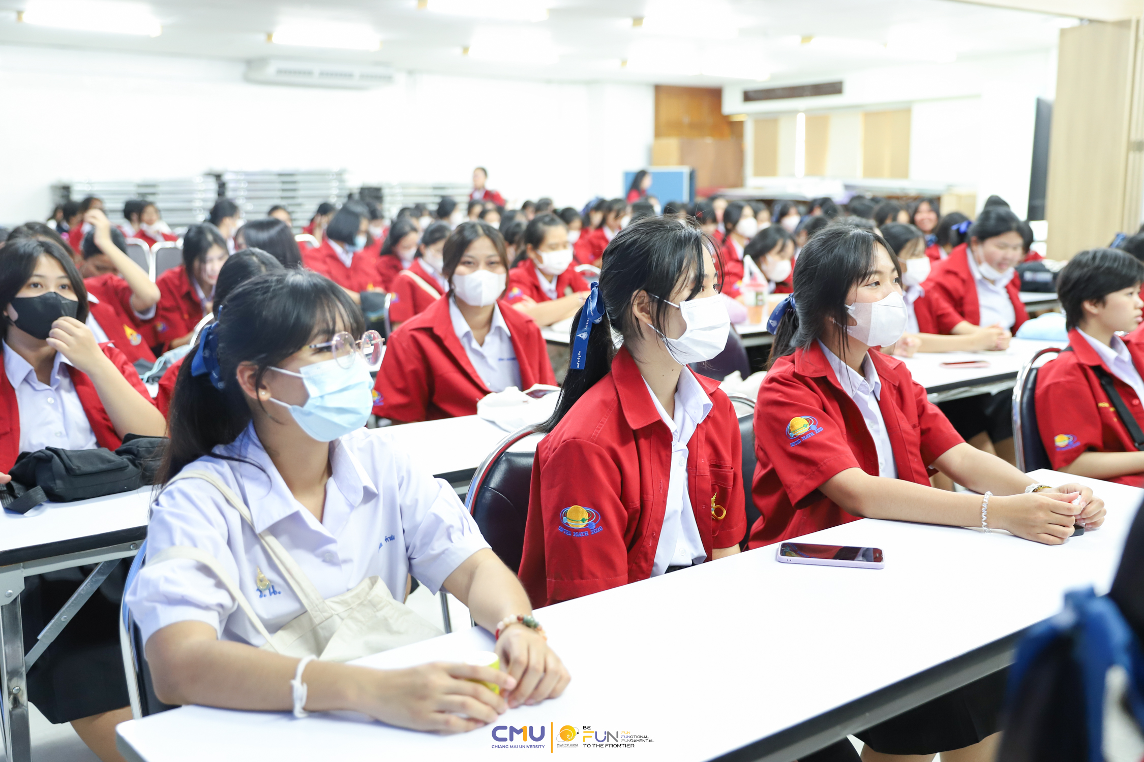 วันที่ 20 กุมภาพันธ์ 2566 ผู้ช่วยศาสตราจารย์ ดร.ศุภณัฐ ชัยดี ผู้ช่วยคณบดีฝ่ายสื่อสารองค์กร คณะวิทยาศาสตร์ กล่าวต้อนรับ พร้อมกับบรรยายแนะนำหลักสูตร และภาพรวมการเรียนการสอนของคณะวิทยาศาสตร์ ให้แก่นักเรียนห้องเรียนพิเศษคณิตศาสตร์ จากโรงเรียนสตรีราชินูทิศ อ.เมือง จ.อุดรธานี จำนวน 190 คน ที่มาเยี่ยมชม และศึกษาดูงานด้านการเรียนการสอนของคณะวิทยาศาสตร์ ทั้งนี้ เพื่อให้นักเรียนมีข้อมูลประกอบการตัดสินใจศึกษาต่อในระดับอุดมศึกษาอย่างรอบด้าน โดยมีอาจารย์ ดร. ว่าที่ร้อยเอกเฉลิมรัช นนทะภา พร้อมด้วยนักศึกษาภาควิชาคณิตศาสตร์ ร่วมต้อนรับน้องๆ ณ ห้องสัมมนา ชั้น 2 อาคาร 40 ปี คณะวิทยาศาสตร์ และนำเยี่ยมชมห้องเรียน บรรยากาศการเรียนการสอน และอาคารต่างๆ ภายในคณะ