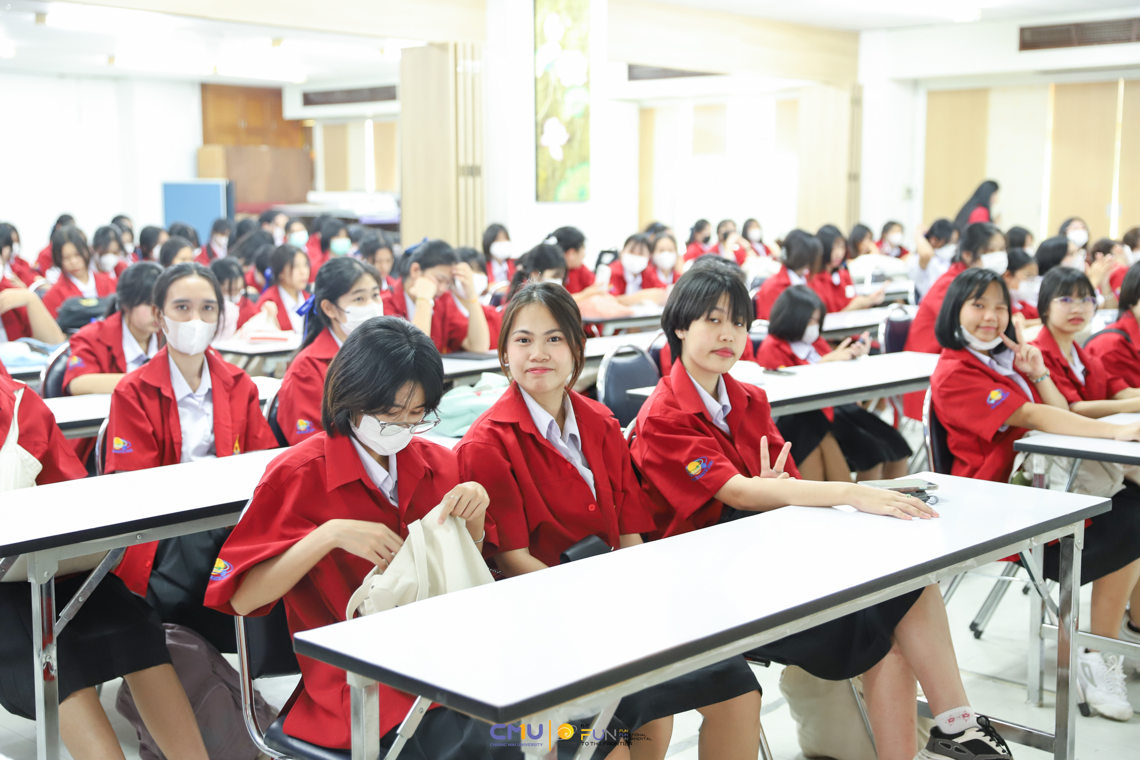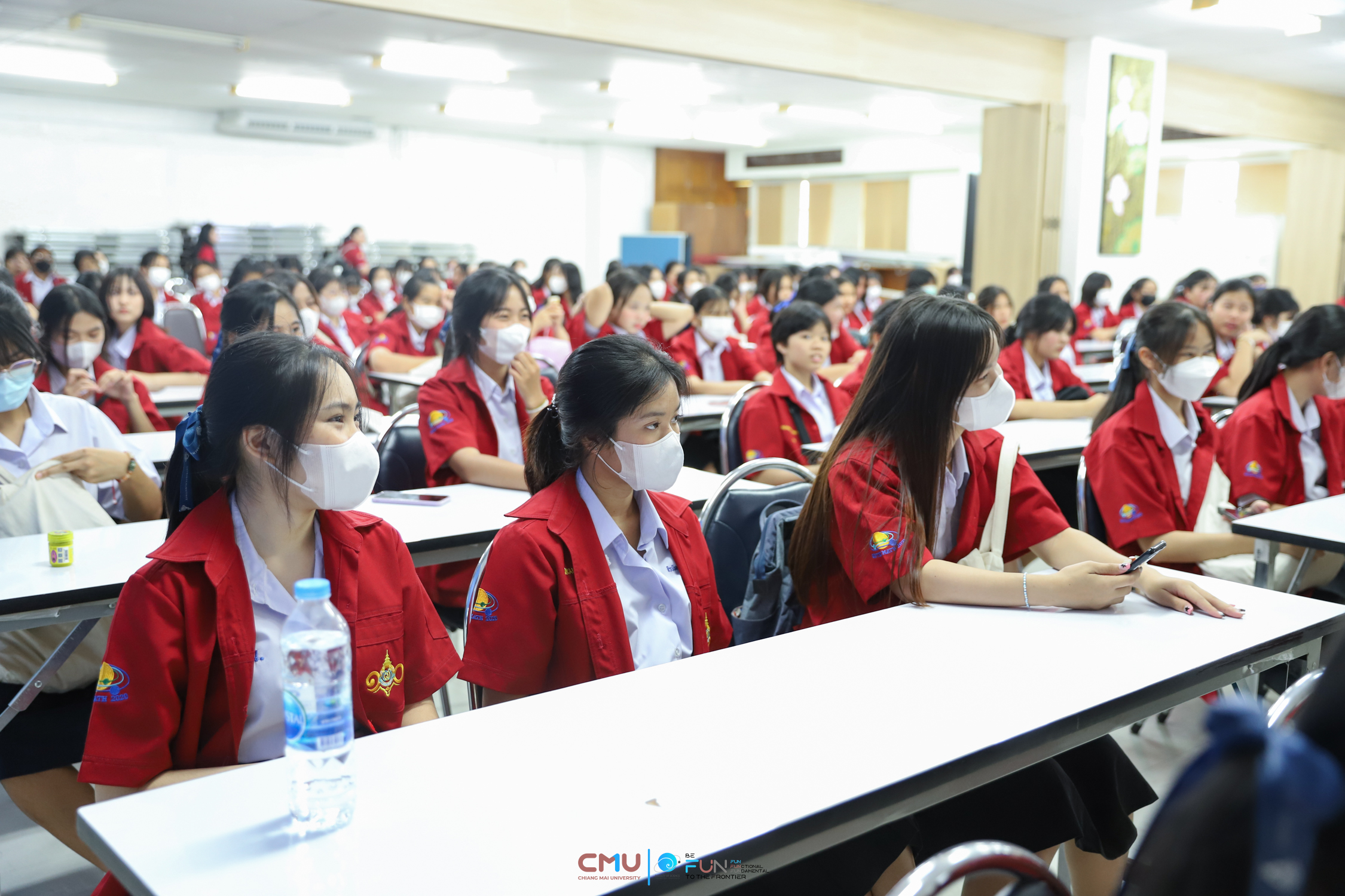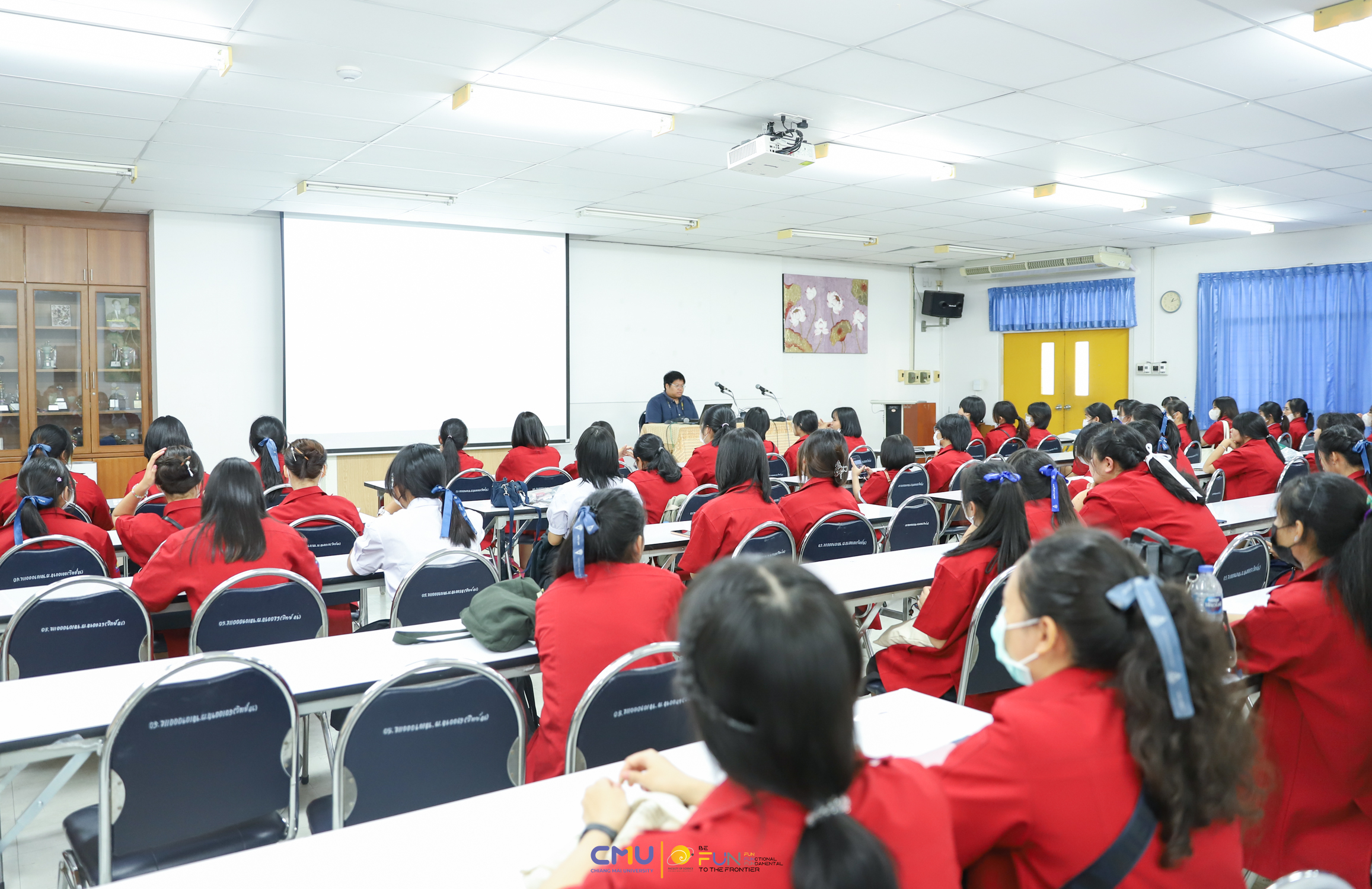 วันที่ 20 กุมภาพันธ์ 2566 ผู้ช่วยศาสตราจารย์ ดร.ศุภณัฐ ชัยดี ผู้ช่วยคณบดีฝ่ายสื่อสารองค์กร คณะวิทยาศาสตร์ กล่าวต้อนรับ พร้อมกับบรรยายแนะนำหลักสูตร และภาพรวมการเรียนการสอนของคณะวิทยาศาสตร์ ให้แก่นักเรียนห้องเรียนพิเศษคณิตศาสตร์ จากโรงเรียนสตรีราชินูทิศ อ.เมือง จ.อุดรธานี จำนวน 190 คน ที่มาเยี่ยมชม และศึกษาดูงานด้านการเรียนการสอนของคณะวิทยาศาสตร์ ทั้งนี้ เพื่อให้นักเรียนมีข้อมูลประกอบการตัดสินใจศึกษาต่อในระดับอุดมศึกษาอย่างรอบด้าน โดยมีอาจารย์ ดร. ว่าที่ร้อยเอกเฉลิมรัช นนทะภา พร้อมด้วยนักศึกษาภาควิชาคณิตศาสตร์ ร่วมต้อนรับน้องๆ ณ ห้องสัมมนา ชั้น 2 อาคาร 40 ปี คณะวิทยาศาสตร์ และนำเยี่ยมชมห้องเรียน บรรยากาศการเรียนการสอน และอาคารต่างๆ ภายในคณะ