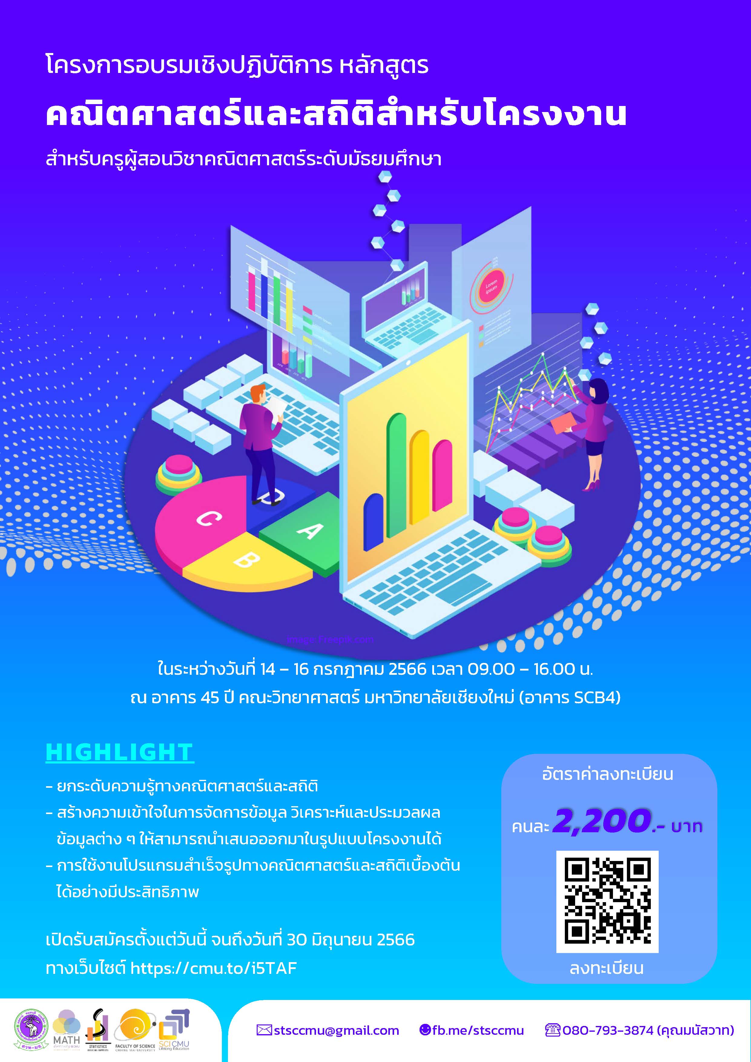 ศวท-มช. ร่วมกับ ภาควิชาคณิตศาสตร์ ภาควิชาสถิติ และศูนย์การเรียนรู้ตลอดชีวิต คณะวิทยาศาสตร์ มหาวิทยาลัยเชียงใหม่ ขอเชิญครูผู้สอนวิชาคณิตศาสตร์ ระดับมัธยมศึกษา เข้าร่วมโครงการอบรมเชิงปฏิบัติการ หลักสูตร “คณิตศาสตร์และสถิติสำหรับโครงงาน” เพื่อสร้างความเข้าใจในการจัดการข้อมูล วิเคราะห์และประมวลผลข้อมูลต่าง ๆ ให้สามารถนำเสนอออกมาในรูปแบบโครงงงานได้ ระหว่างวันที่ 14 – 16 กรกฎาคม 2566 เวลา 09.00 – 16.30 น. ณ อาคาร 45 ปี คณะวิทยาศาสตร์ มหาวิทยาลัยเชียงใหม่ (อาคาร SCB4)