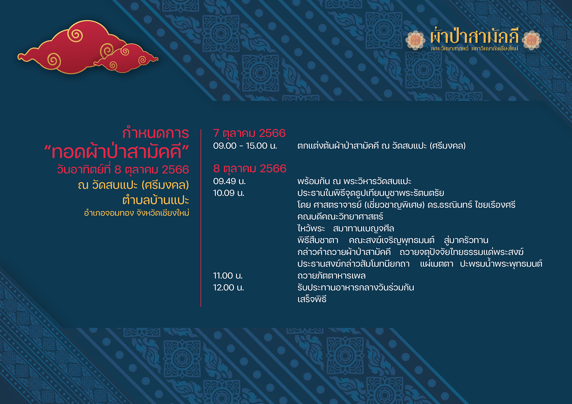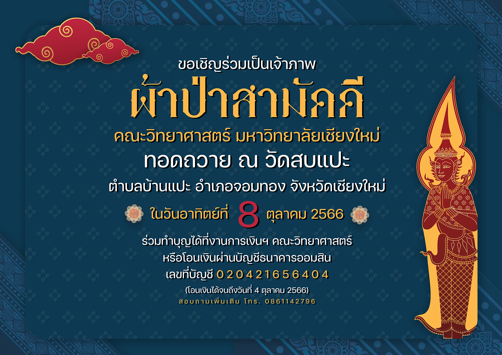 ขอเชิญร่วมเป็นเจ้าภาพผ้าป่าสามัคคี คณะวิทยาศาสตร์ มหาวิทยาลัยเชียงใหม่ ทอดถวาย ณ วัดสบแปะ อำเภอจอมทอง จังหวัดเชียงใหม่