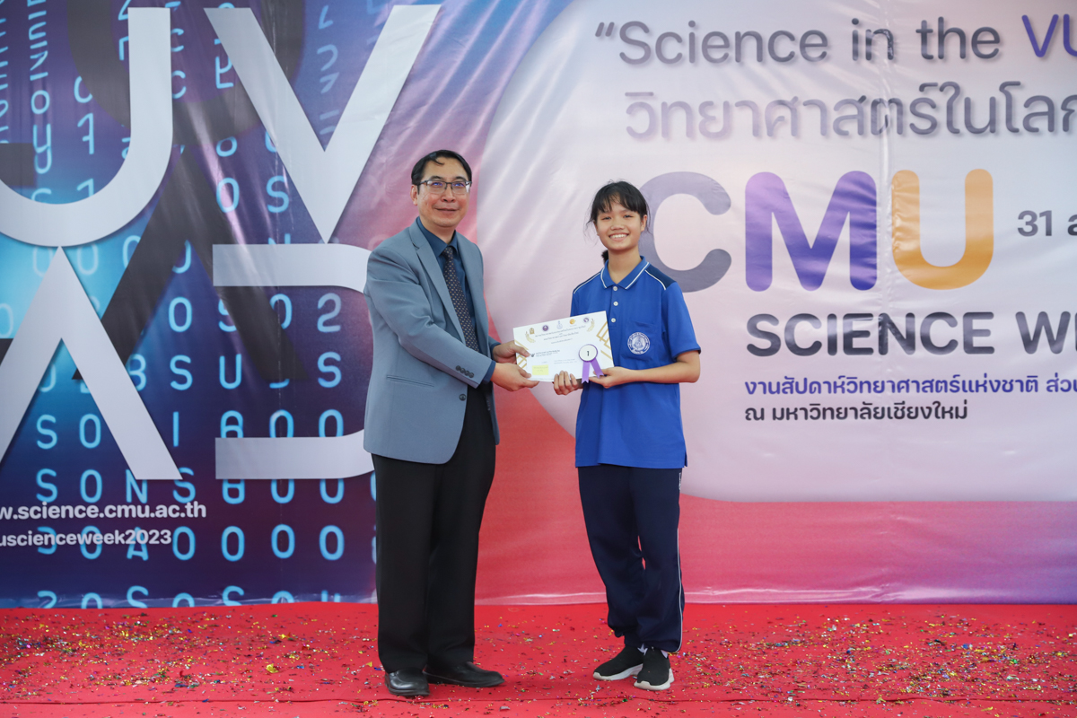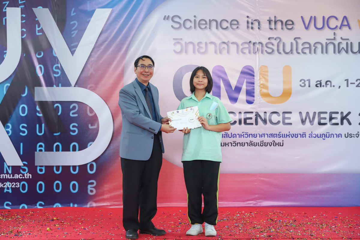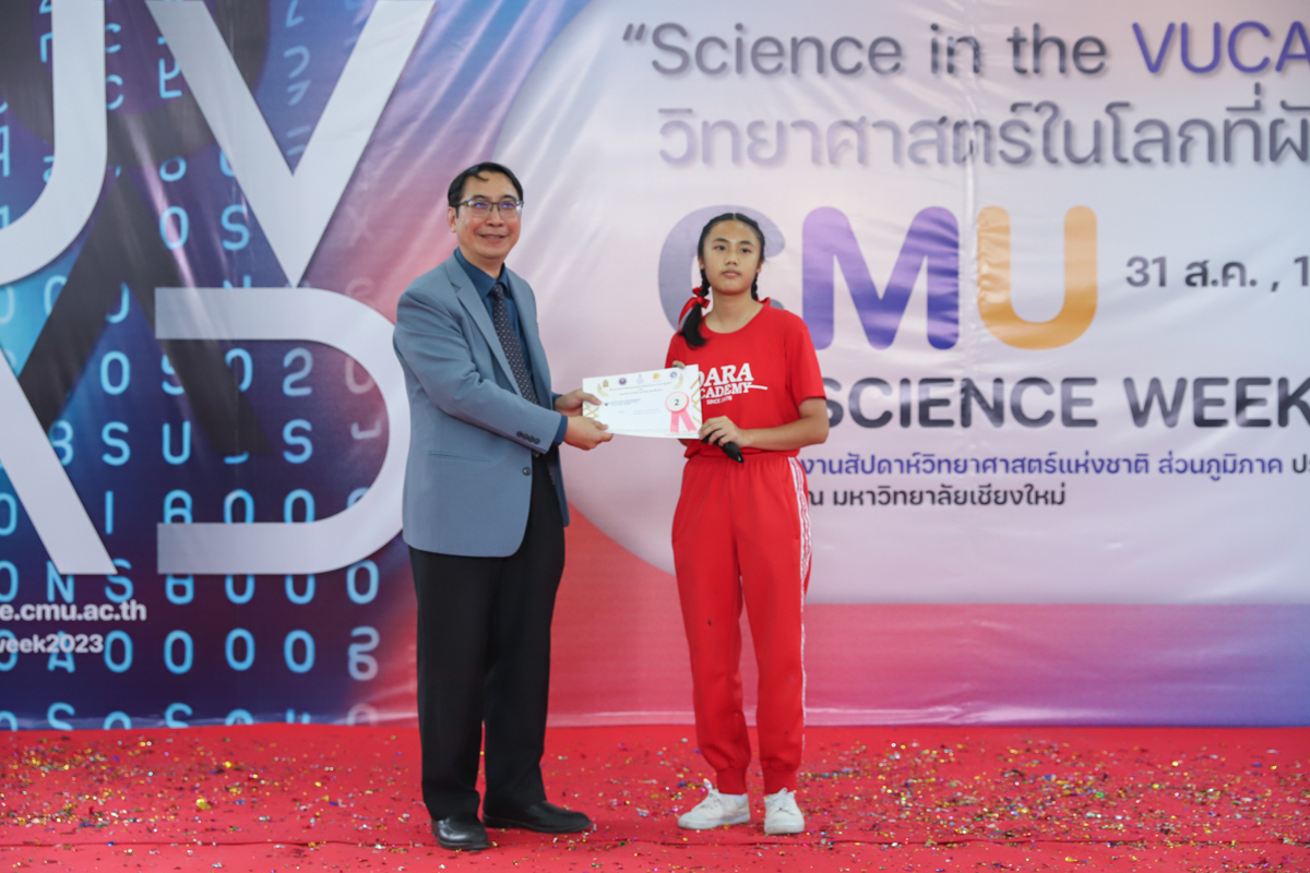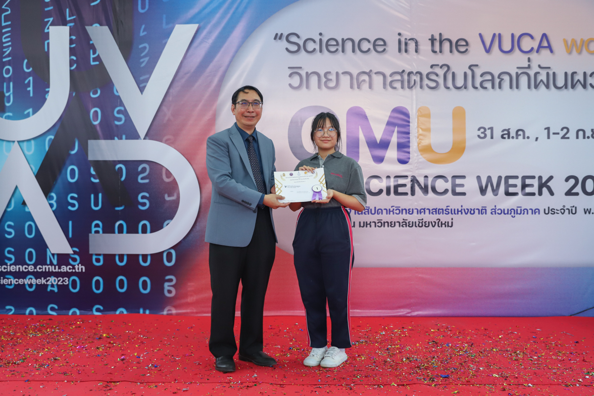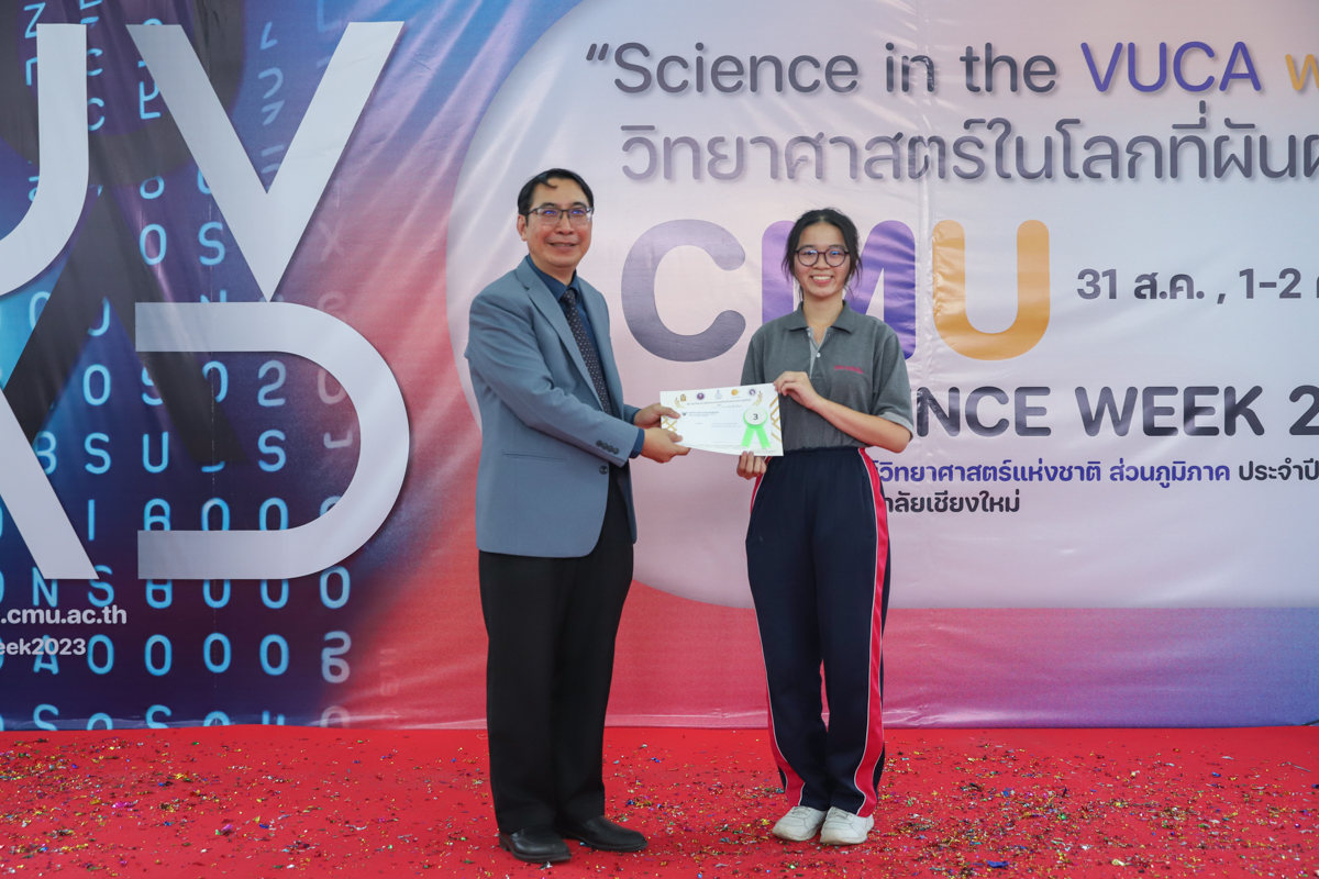 บรรยากาศการมอบรางวัลการแข่งขันวาดภาพจิตนาการทางวิทยาศาตร์ วันที่ 31 สิงหาคม 2566 ในงาน CMU SCIENCE WEEK 2023 งานสัปดาห์วิทยาศาสตร์แห่งชาติ ส่วนภูมิภาค ประจำปี 2566 ที่คณะวิทยาศาสตร์ มหาวิทยาลัยเชียงใหม่