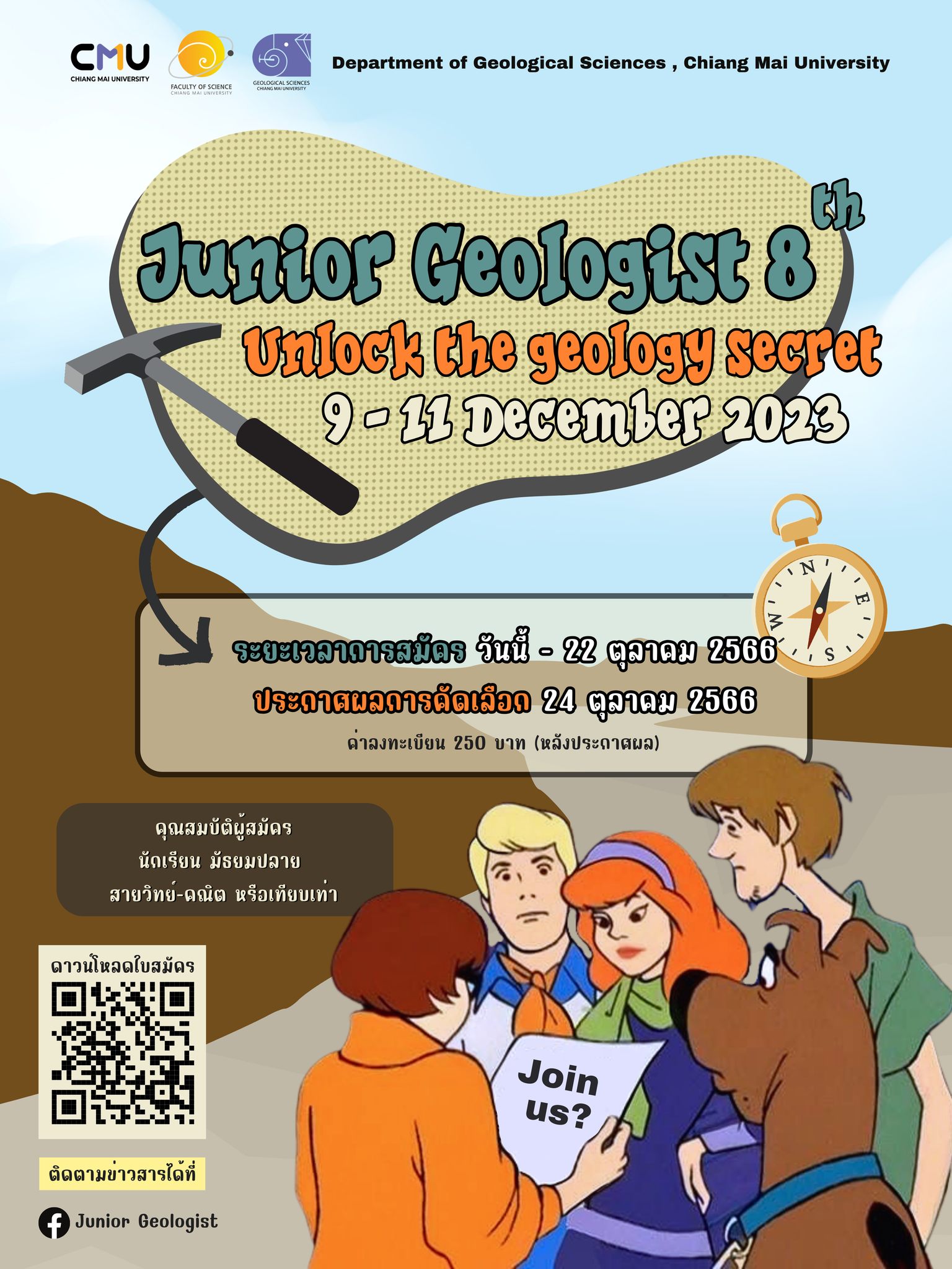 กลับมาอีกครั้งกับค่าย Junior Geologist ครั้งที่ 8 จัดโดยภาควิชาธรณีวิทยา คณะวิทยาศาสตร์ มหาวิทยาลัยเชียงใหม่ วันที่ 9-11 ธันวาคม 2566 ณ ภาควิชาธรณีวิทยา มหาวิทยาลัยเชียงใหม่