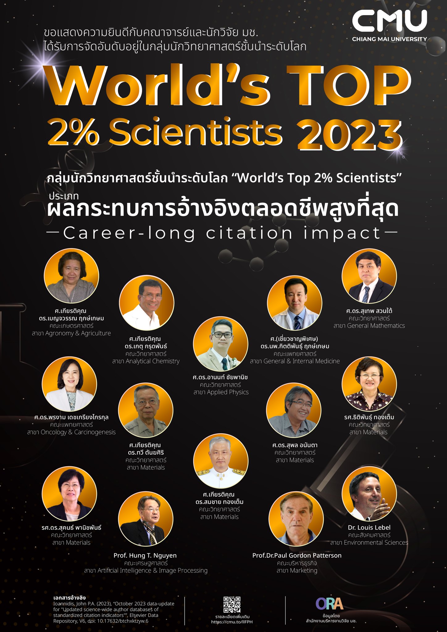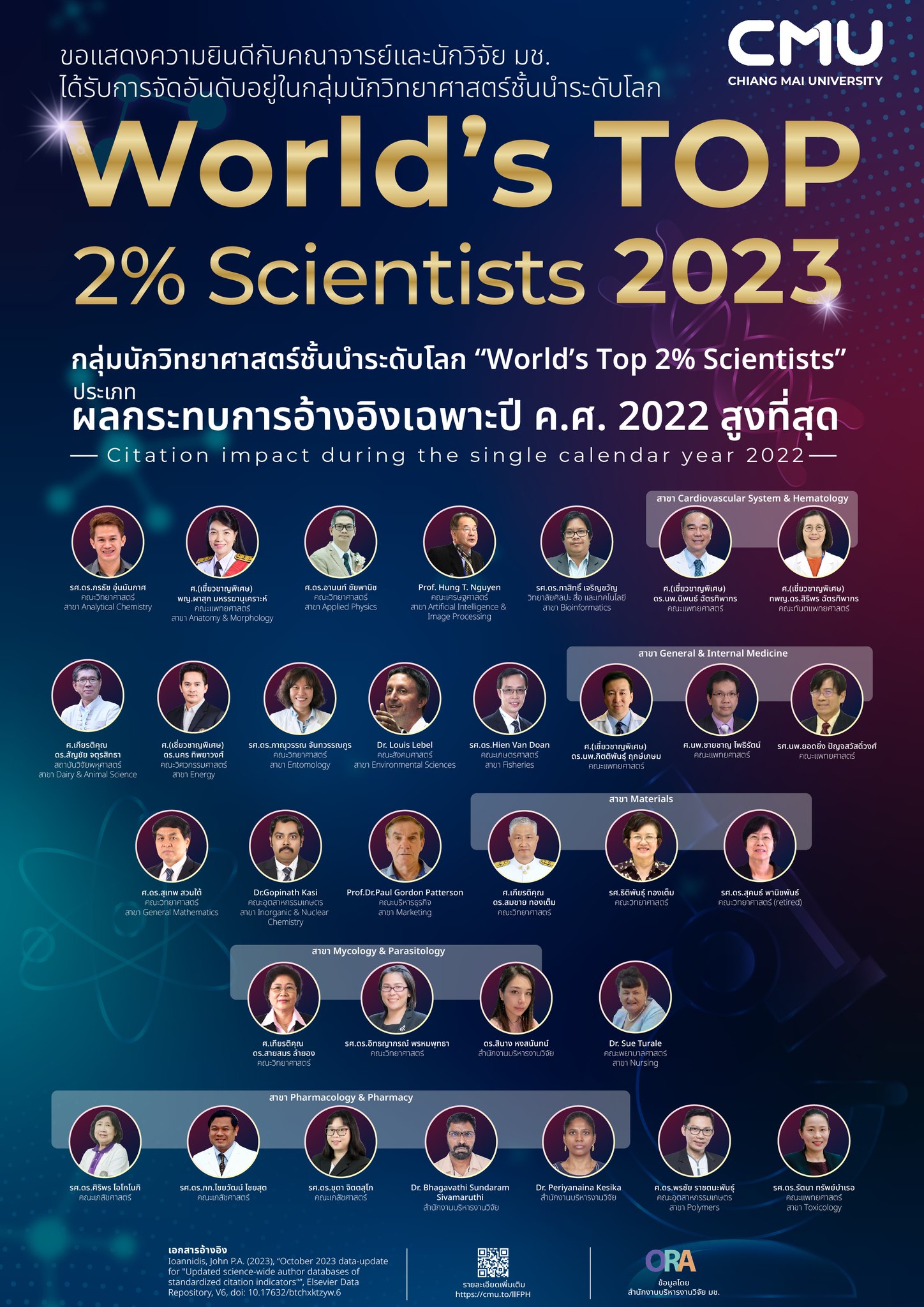 คณะวิทยาศาสตร์ขอแสดงความยินดีกับคณาจารย์และนักวิจัยมหาวิทยาลัยเชียงใหม่ทุกท่าน ที่ได้รับการจัดอันดับอยู่ในกลุ่มนักวิทยาศาสตร์ชั้นนำระดับโลก “World’s Top 2% Scientists 2023”