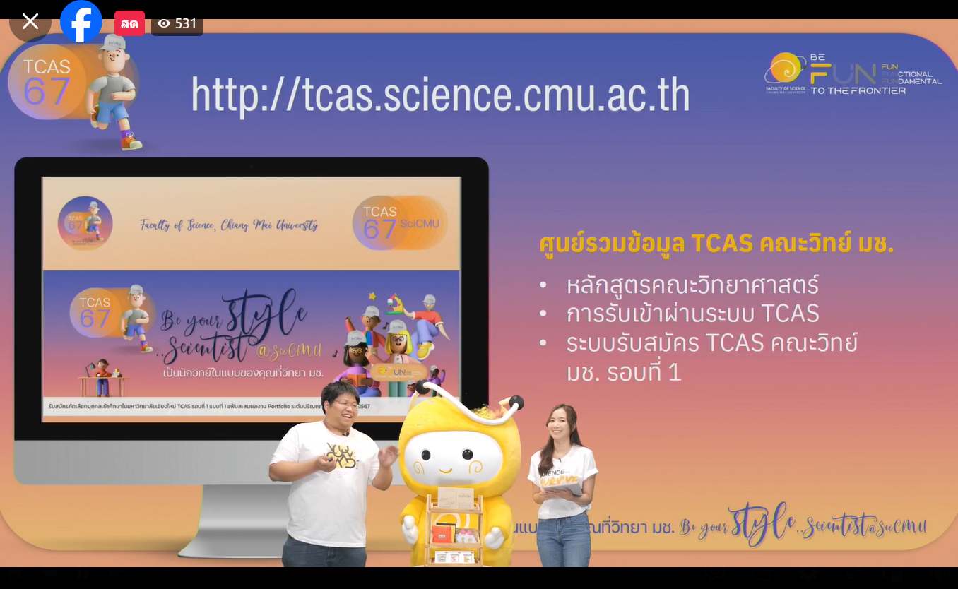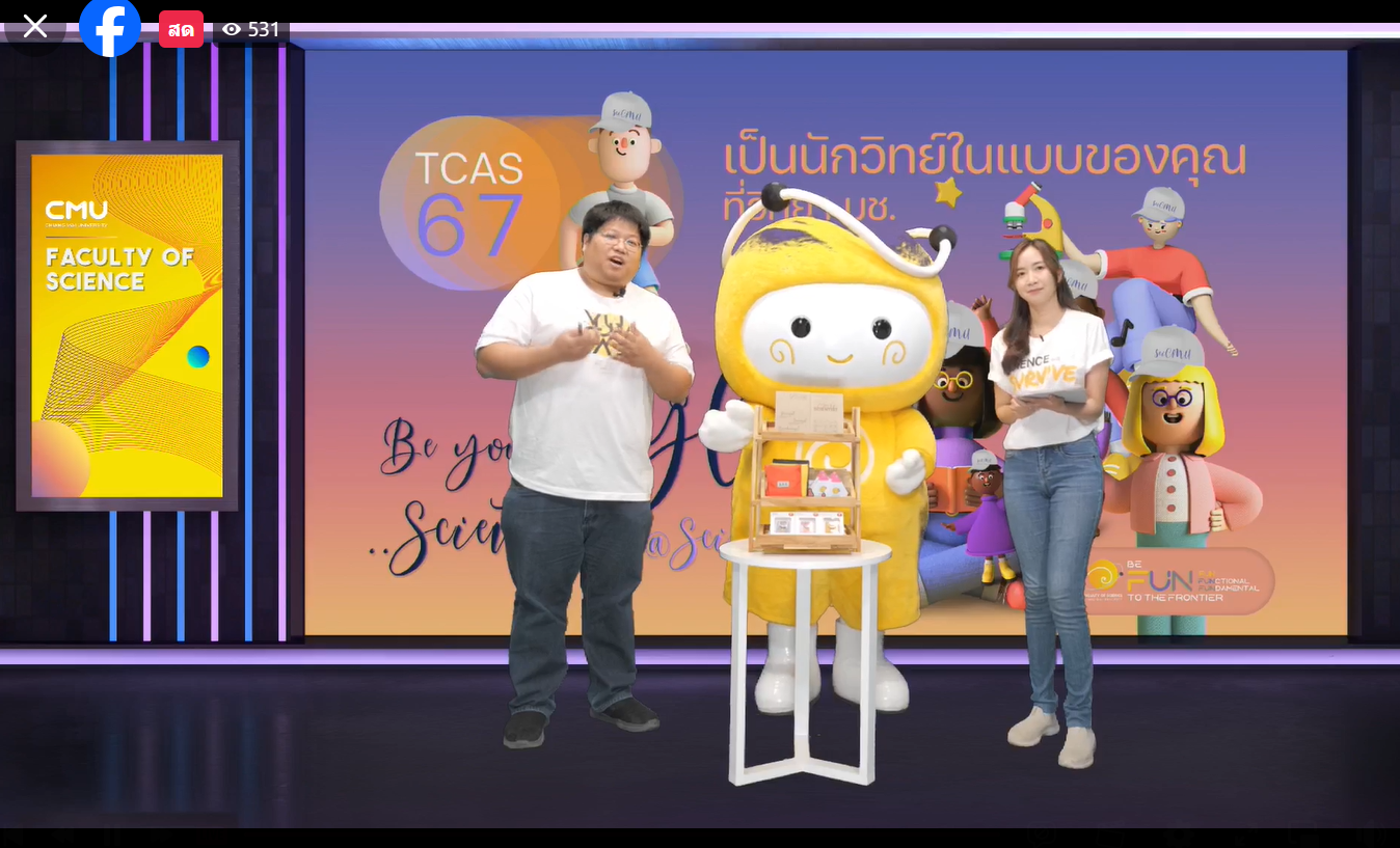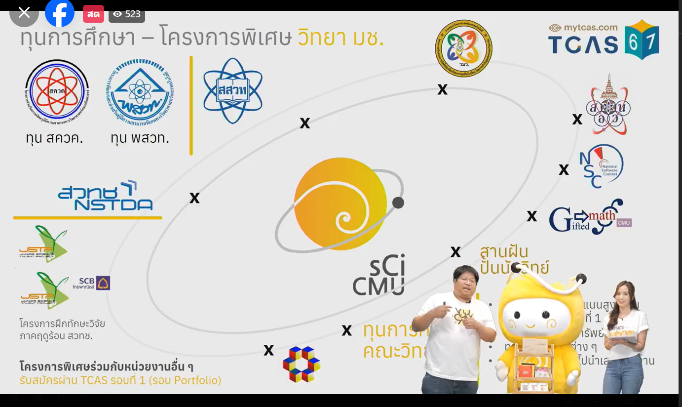 คณะวิทยาศาสตร์ร่วมจัดกิจกรรม CMU Open House Online 2023 "Be your style...Scientist ! เป็นนักวิทย์ในแบบของคุณ ที่วิทยา มช." เมื่อวันที่ 22 ตุลาคม 2566 ผ่าน FB LIVE CMU Open House และ Faculty of Science, Chiang Mai University เพื่อให้นักเรียนที่สนใจด้านวิทยาศาสตร์ได้ทำความรู้จักกันให้มากขึ้นว่าวิทยา มช. มีหลักสูตรอะไรบ้าง แต่ละหลักสูตรมีจุดเน้นจุดเด่นยังไง เรียนวิทยาศาสตร์ มช. จะสนับสนุนความเป็นตัวเองได้ยังไง ทุนการศึกษา กิจกรรมพัฒนานักศึกษา จุดเด่นของบัณฑิตที่จบจาก มช. เรียนจบแล้วทำงานอะไรได้บ้าง การสนับสนุนนักศึกษาสู่สากล อยากเรียนวิทยา มช. ต้องเตรียมตัวยังไงบ้าง พูดคุยแลกเปลี่ยนประสบการณ์กับพี่ๆ และอาจารย์ พร้อมตอบทุกคำถามที่ทุกคนอยากรู้ โดยมีนักเรียนให้ความสนใจเข้ามาชม Live และร่วมสนุกตอบคำถามอย่างคึกคัก
