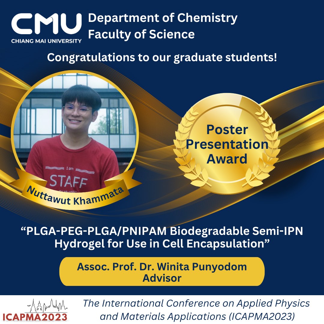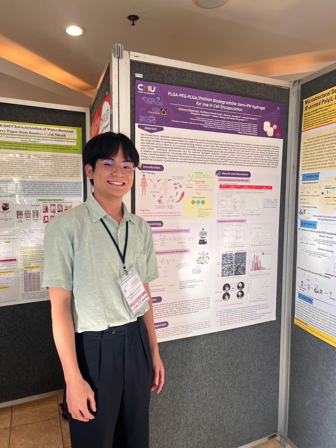 Nuttawut's poster presentation showcases his innovative semi-IPN hydrogel, developed for the purpose of cell encapsulation, under the guidance of Assoc. Prof. Dr. Winita Punyodom.