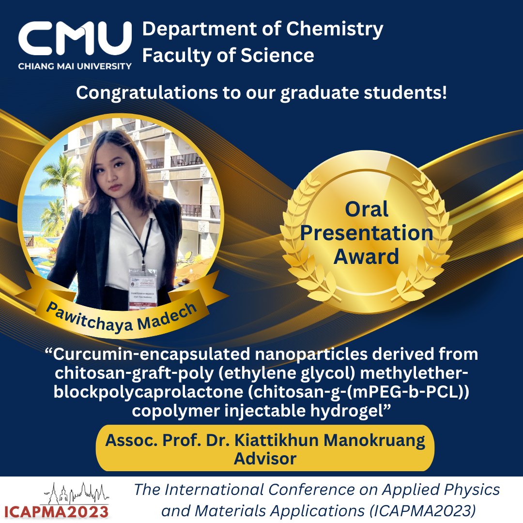 Pawitchaya's oral presentation focuses on her study of a biobased copolymer injectable hydrogel for the delivery of the anticancer drugs curcumin. This research is guided by Assoc. Prof. Dr. Kiattikhun Manokruang.