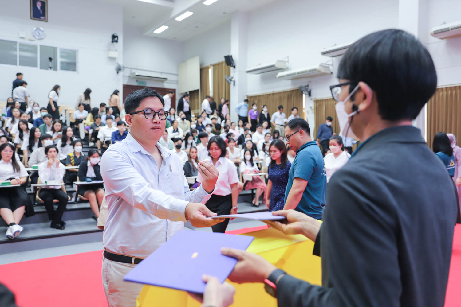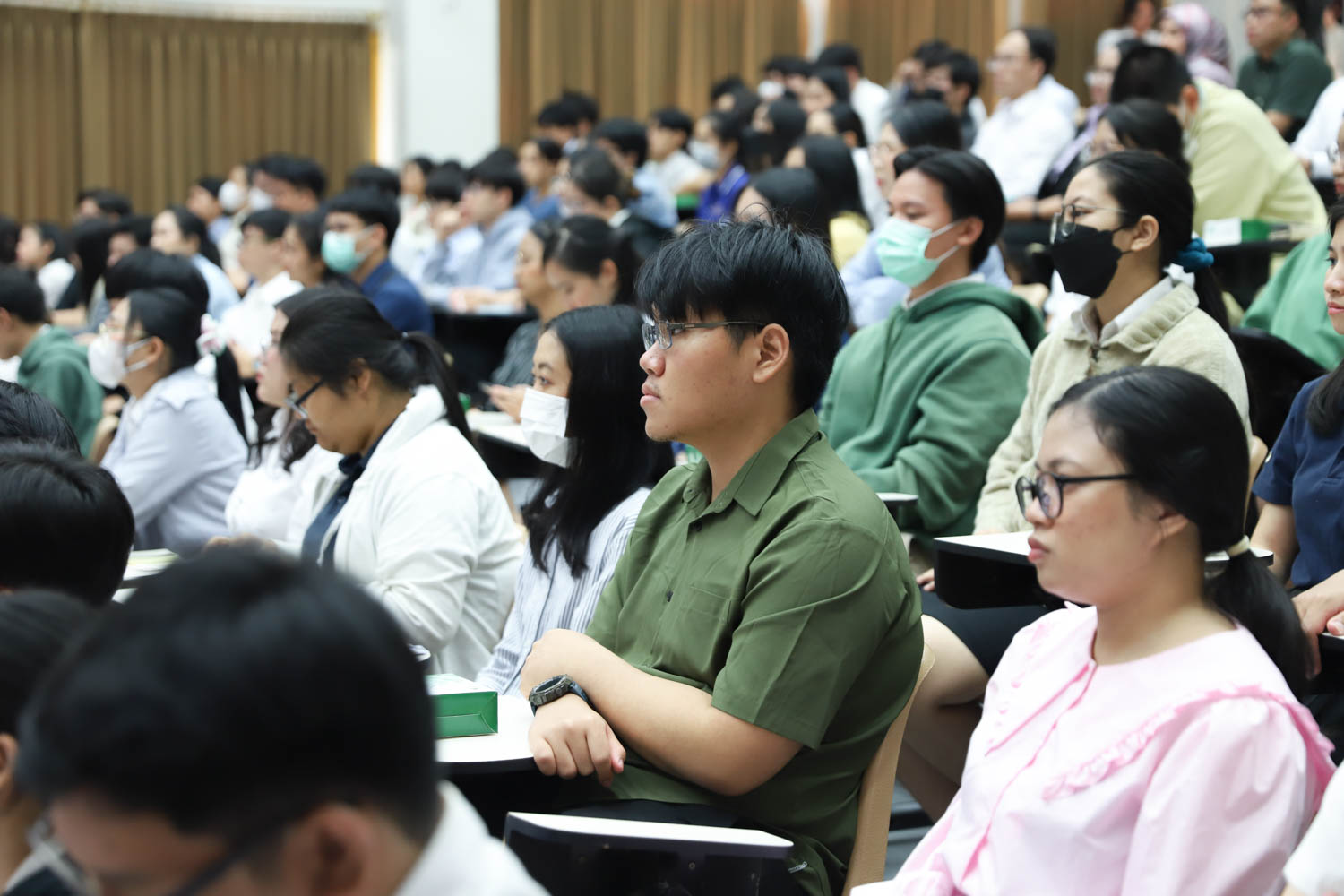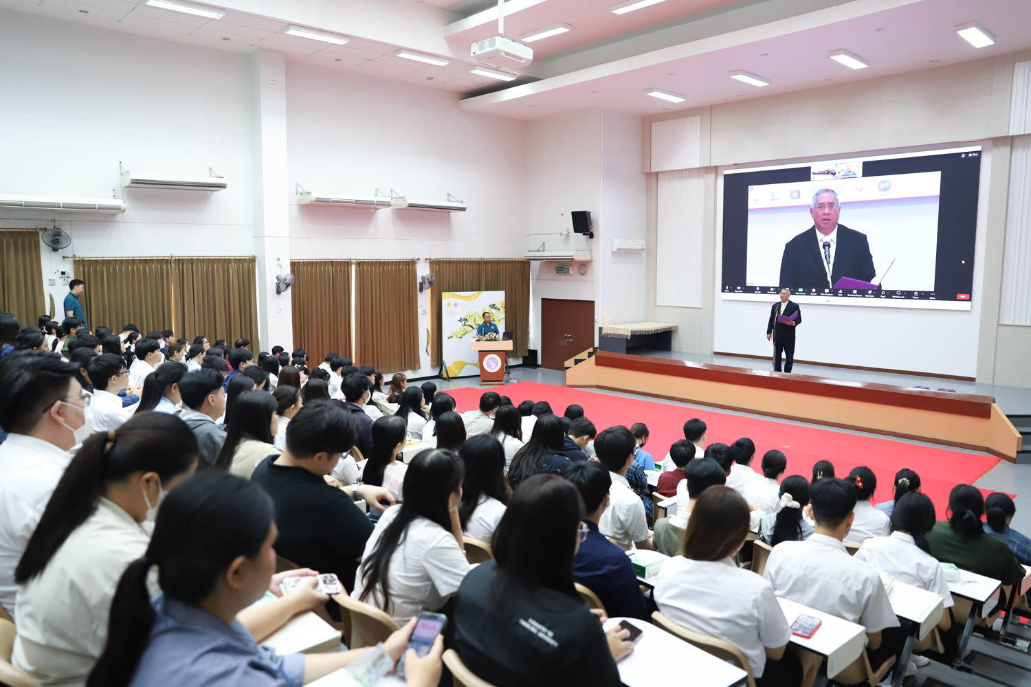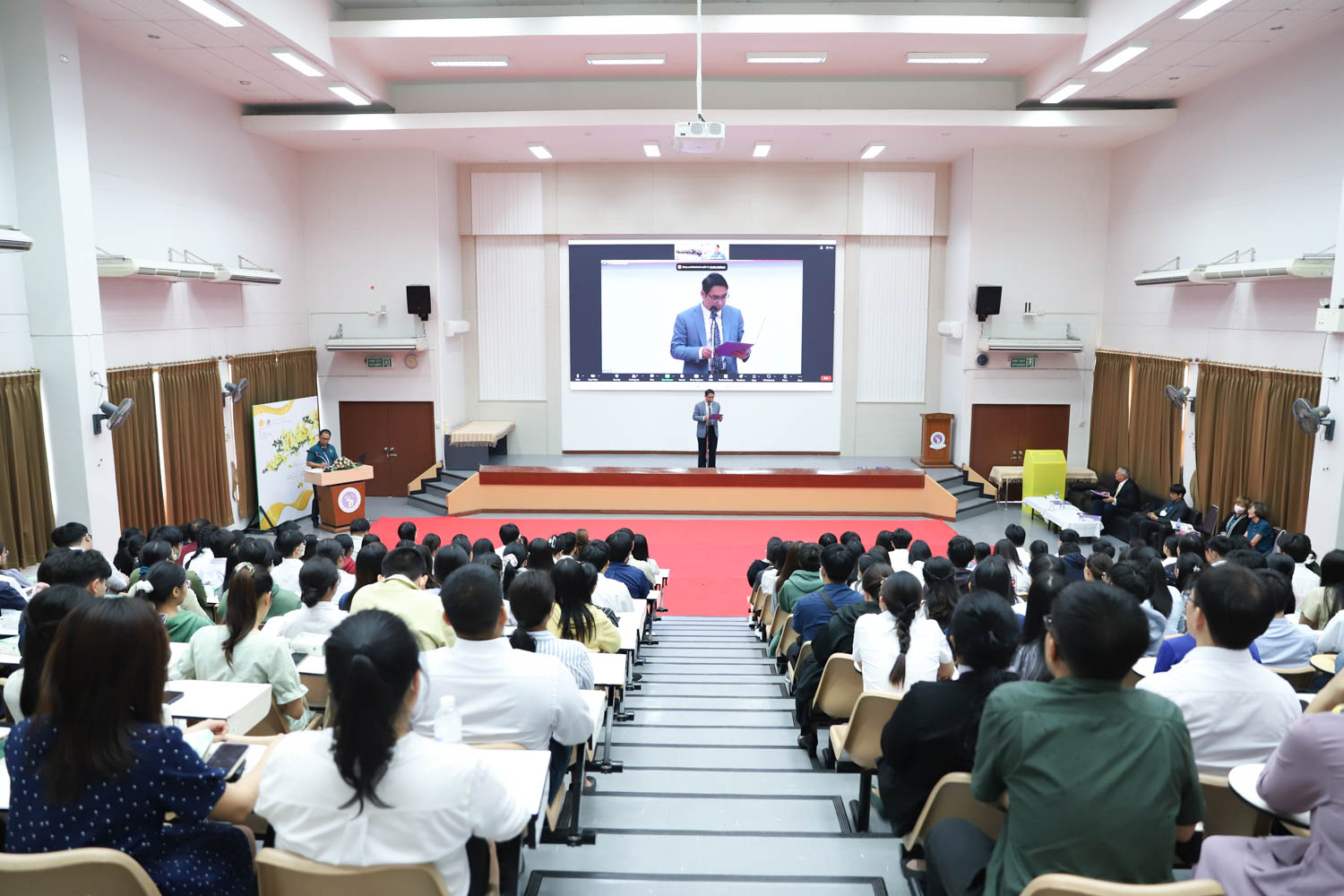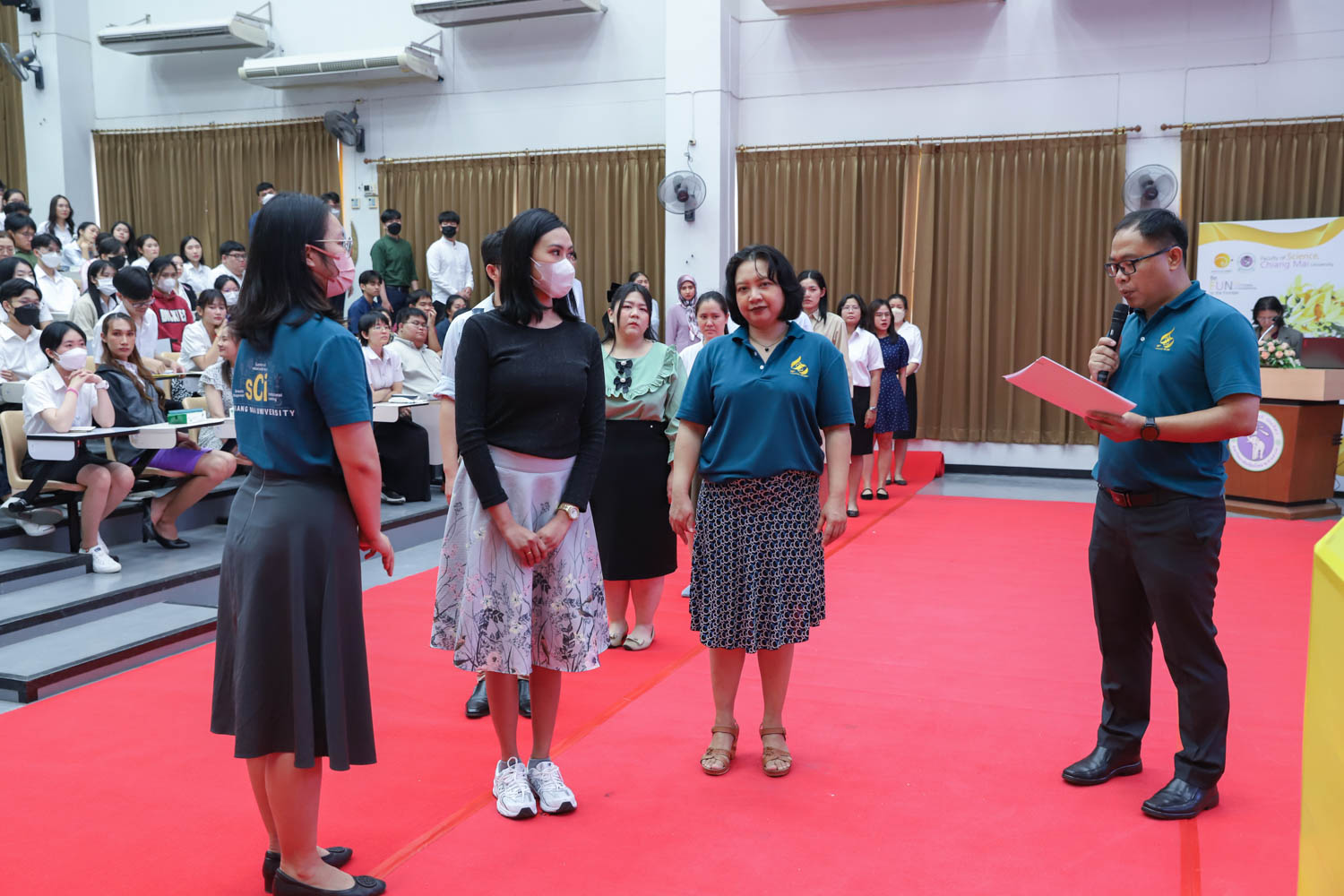 ศาสตราจารย์ (เชี่ยวชาญพิเศษ) ดร.ธรณินทร์ ไชยเรืองศรี คณบดีคณะวิทยาศาสตร์ และคุณพร้อมพร อิศรางกูร ณ อยุธยา นายกสมาคมนักศึกษาเก่าคณะวิทยาศาสตร์ กล่าวต้อนรับ และแสดงความยินดีกับบัณฑิตใหม่ของคณะวิทยาศาสตร์ ที่จะเข้ารับพระราชทานปริญญาบัตร ครั้งที่ 58 ของมหาวิทยาลัยเชียงใหม่ ในวันที่ 29-30 มกราคม 2567 ในการฝึกซ้อมเข้ารับพระราชทานปริญญาบัตรของบัณฑิตคณะวิทยาศาสตร์ เมื่อวันที่ 26 มกราคม 2567 ณ ห้องบรรยาย SCB2100 อาคาร 40 ปี คณะวิทยาศาสตร์