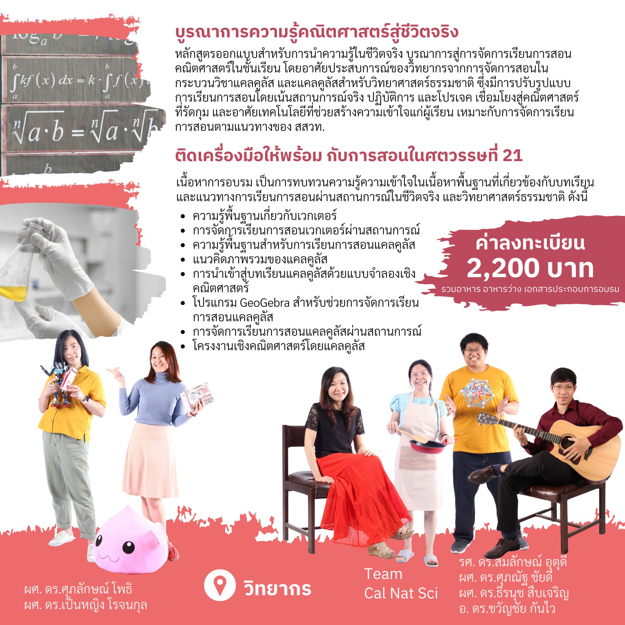 หลักสูตรออกแบบสำหรับการนำความรู้ในชีวิตจริง บูรณาการสู่การจัดการเรียนการสอนคณิตศาสตร์ในชั้นเรียน โดยอาศัยประสบการณ์ของวิทยากรจากการจัดการสอนในกระบวนวิชาแคลคูลัส และแคลคูลัสสำหรับวิทยาศาสตร์ธรรมชาติ ซึ่งมีการปรับรูปแบบการเรียนการสอนโดยเน้นสถานการณ์จริง ปฏิบัติการ และโปรเจค เชื่อมโยงสู่คณิตศาสตร์ที่รัดกุม และอาศัยเทคโนโลยีที่ช่วยสร้างความเข้าใจแก่ผู้เรียน เหมาะกับการจัดการเรียนการสอนตามแนวทางของ สสวท.