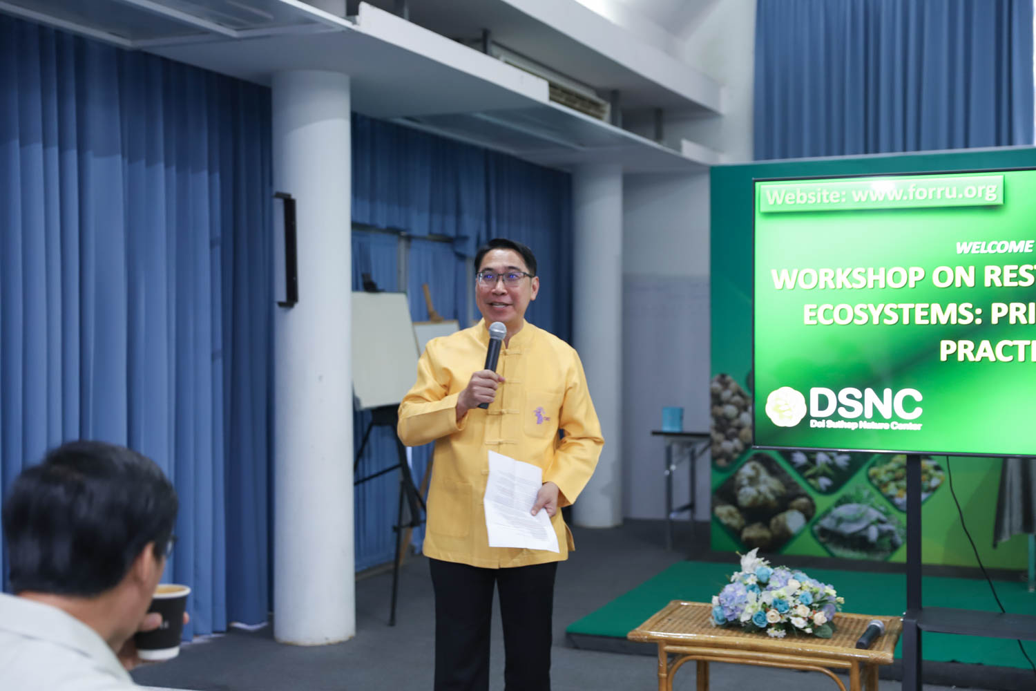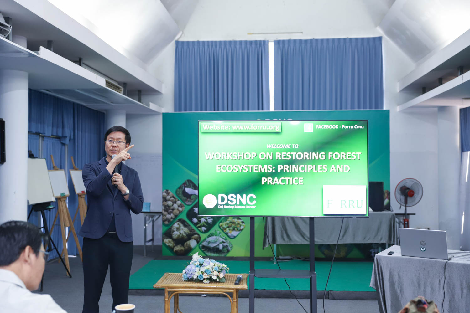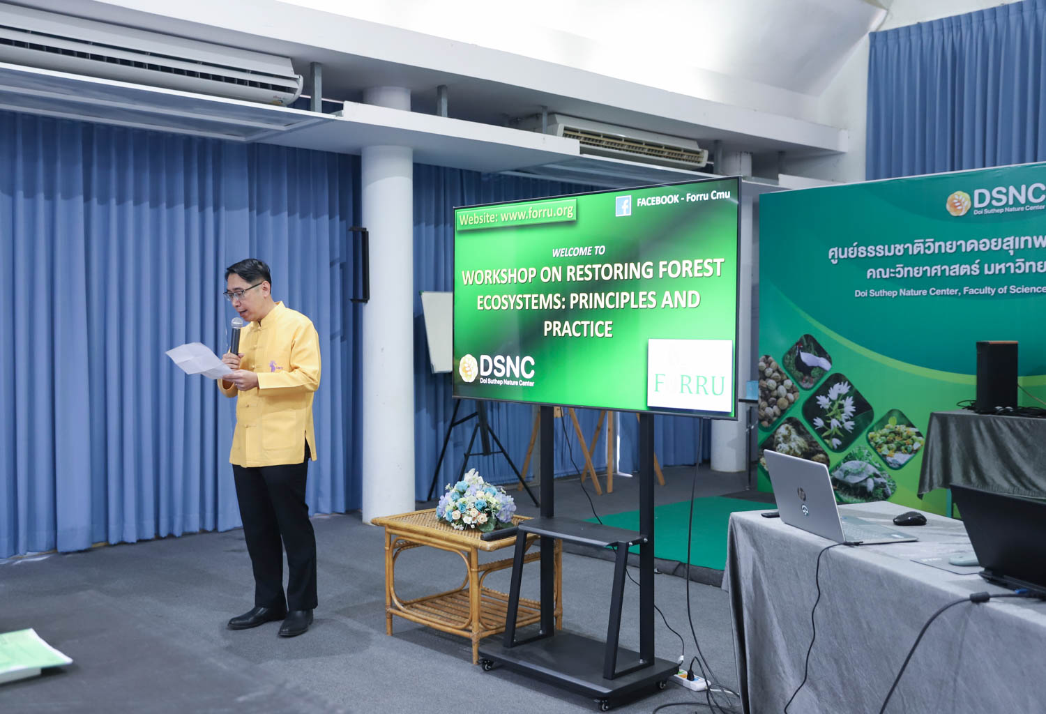 ศาสตราจารย์ (เชี่ยวชาญพิเศษ) ดร.ธรณินทร์ ไชยเรืองศรี คณบดีคณะวิทยาศาสตร์ กล่าวต้อนรับผู้เข้าร่วมโครงการอบรมเชิงปฏิบัติการเรื่อง Restoring Tropical Forests Principles and Practice ซึ่งจัดโดย หน่วยวิจัยการฟื้นฟูป่า ภาควิชาชีววิทยา คณะวิทยาศาสตร์ (The Forest Restoration Research Unit (FORRU-CMU)) นำโดย รศ.ดร.สตีเฟ่น เอลเลียต เมื่อวันที่ 5 กุมภาพันธ์ 2567 ณ ศูนย์ธรรมชาติวิทยาดอยสุเทพเฉลิมพระเกียรติฯ คณะวิทยาศาสตร์ ผู้เข้าร่วมโครงการประกอบด้วยเจ้าหน้าที่จาก World Bank และกระทรวงสิ่งแวดล้อม ราชอาณาจักรกัมพูชา จำนวน 19 ท่าน โดยโครงการจะจัดต่อเนื่องไปจนถึงวันที่ 7 กุมภาพันธ์นี้