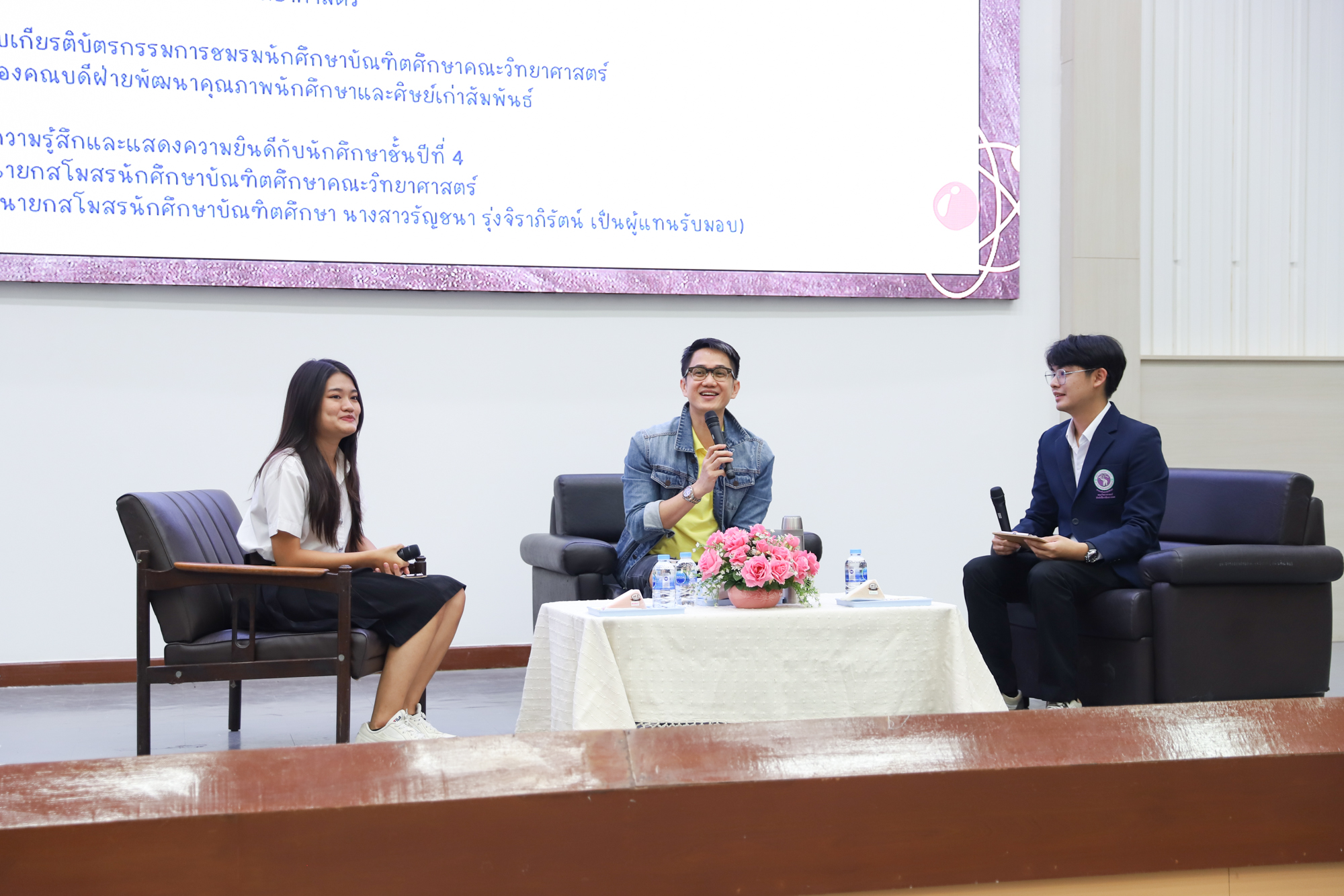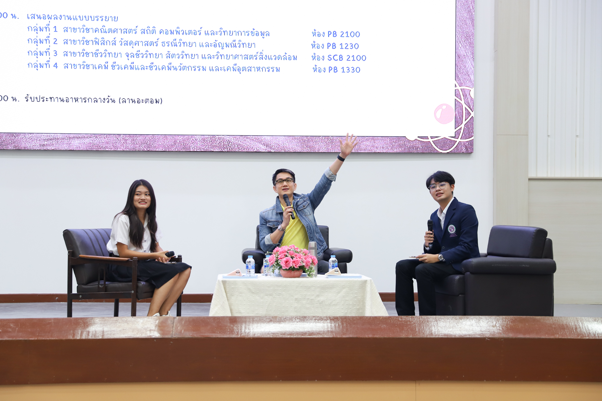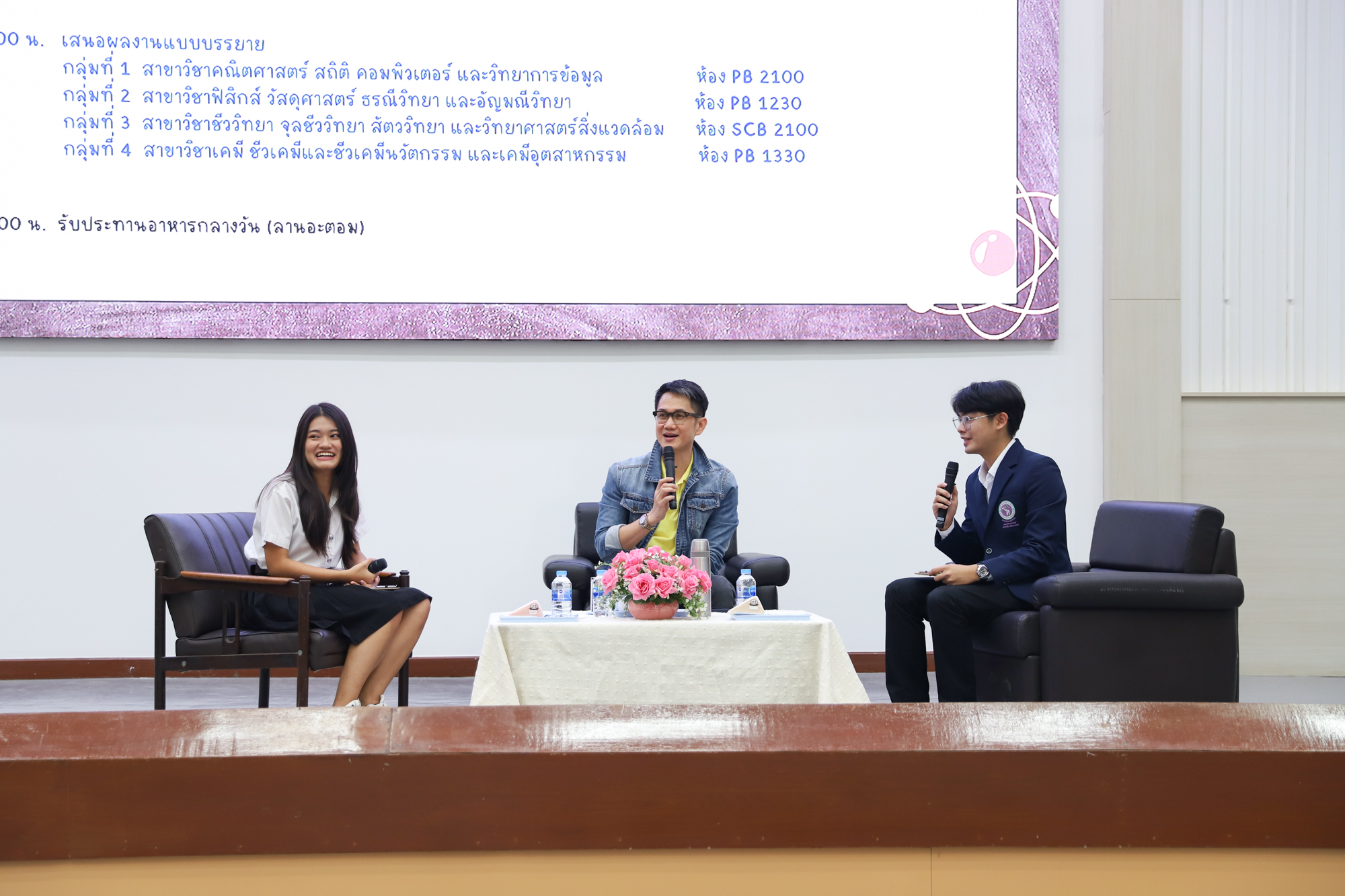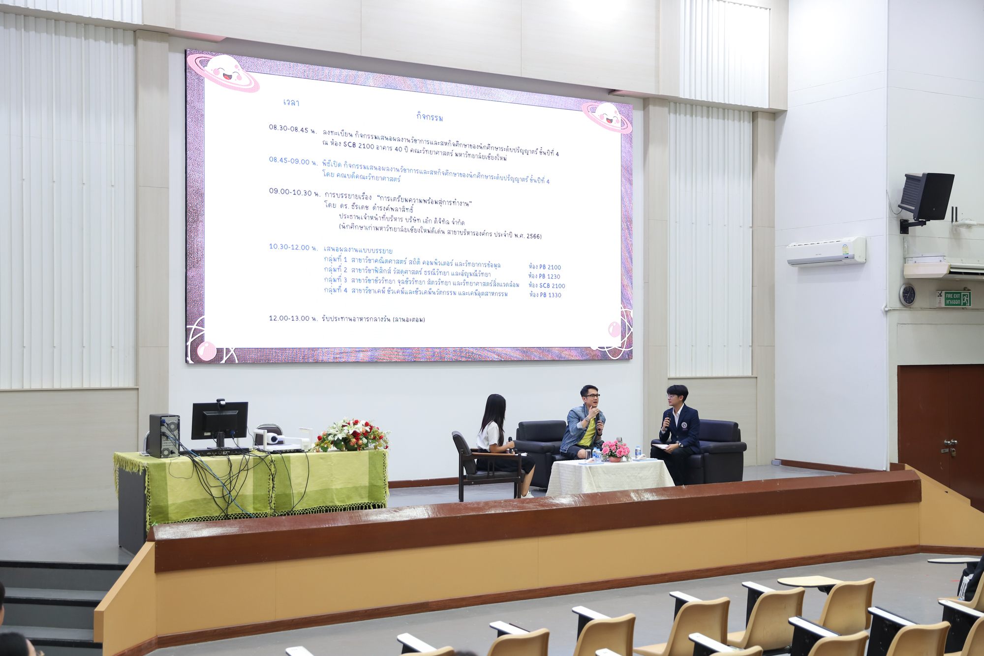 คณะวิทยาศาสตร์จัดกิจกรรมกิจกรรมนำเสนอผลงานวิชาการและสหกิจศึกษาของนักศึกษาระดับปริญญาตรี ชั้นปีที่ 4 ในวันที่ 6 มีนาคม 2567 โดยได้รับเกียรติจากรองคณบดีฝ่ายวิชาการ ผู้ช่วยศาสตราจารย์ ดร. ภควรรณ พวงสมบัติ เป็นประธานเปิดกิจกรรม และ ดร.ธีรเดช ดำรงค์พลาสิทธิ์ ประธานเจ้าหน้าที่บริหาร บริษัท เอ้ก ดิจิทัล จำกัด ศิษย์เก่าคณะวิทยาศาสตร์ มาร่วมแบ่งปันประสบการณ์ให้กับน้องๆ และบรรยายในหัวข้อ “การเตรียมความพร้อมสู่การทำงาน” ณ ห้องบรรยาย SCB2100 ชั้น 1 อาคาร 40 ปี คณะวิทยาศาสตร์ โดยภายหลังจากการบรรยายเสร็จสิ้น นักศึกษาได้เสนอผลงานแบบ Oral Presentation โดยแบ่งเป็น 4 กลุ่ม ได้แก่