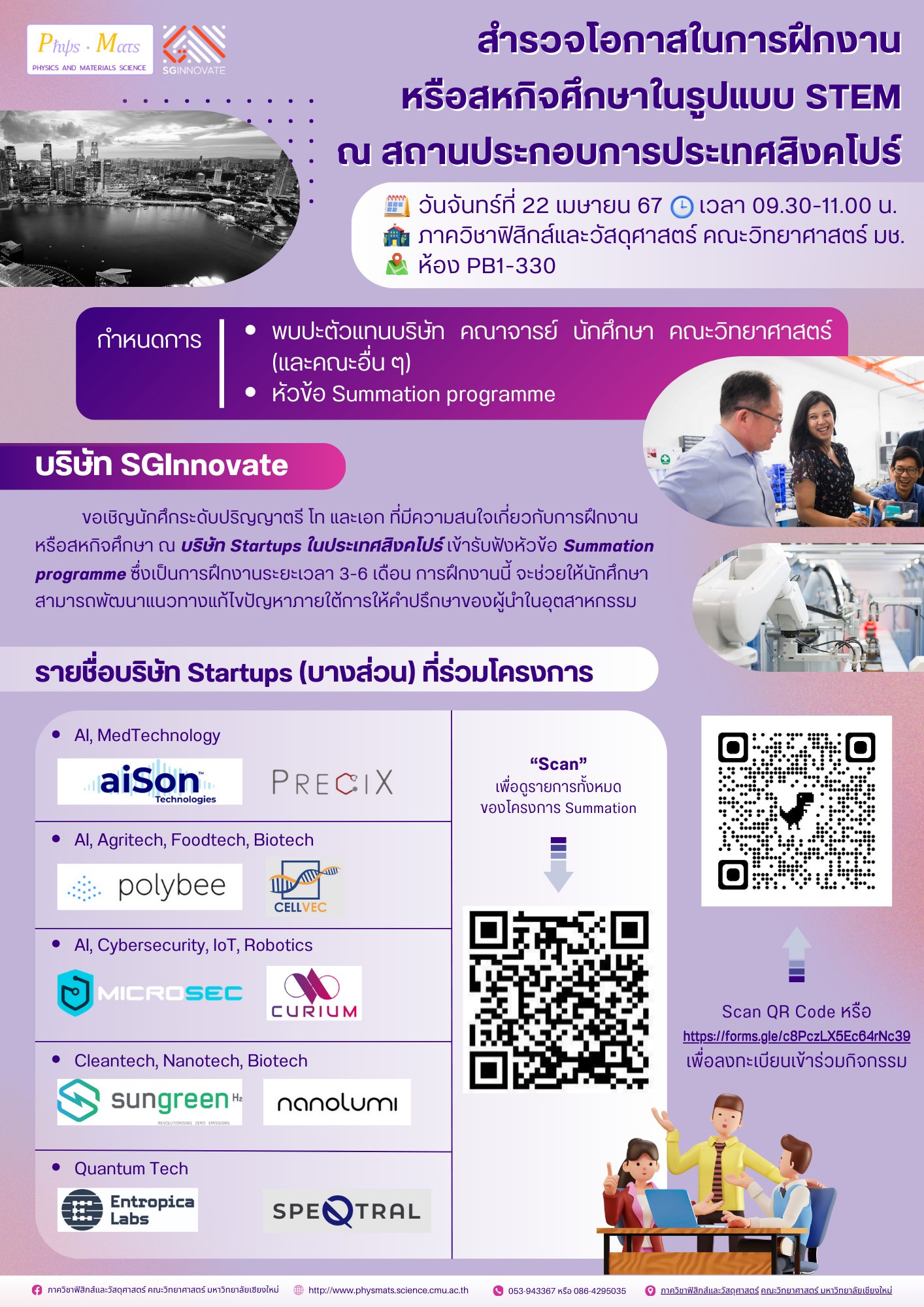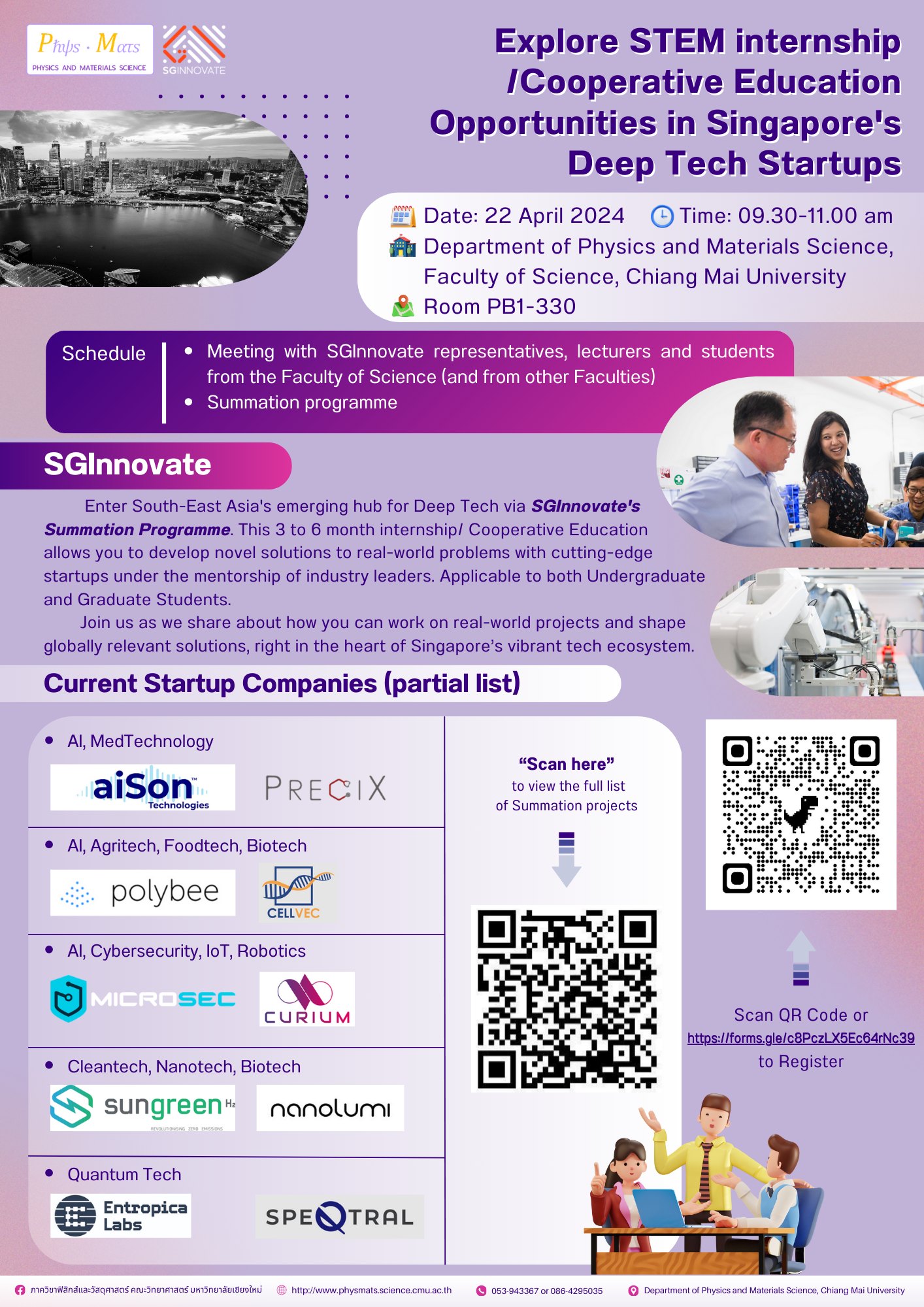 ขอเชิญนักศึกษาระดับปริญญาตรี โท เอก และคณาจารย์ ที่สนใจเกี่ยวกับการฝึกงาน/ สหกิจศึกษาในบริษัท Startups ที่ประเทศ Singapore ร่วมรับฟังบรรยายและสอบถามเกี่ยวกับ Summation Programme โดยบริษัท SGInnovate ในวันจันทร์ที่ 22 เมษายน 2567 เวลา 9:30-11:00 น. ณ ห้อง PB1-330 ภาควิชาฟิสิกส์และวัสดุศาสตร์ คณะวิทยาศาสตร์ มหาวิทยาลัยเชียงใหม่