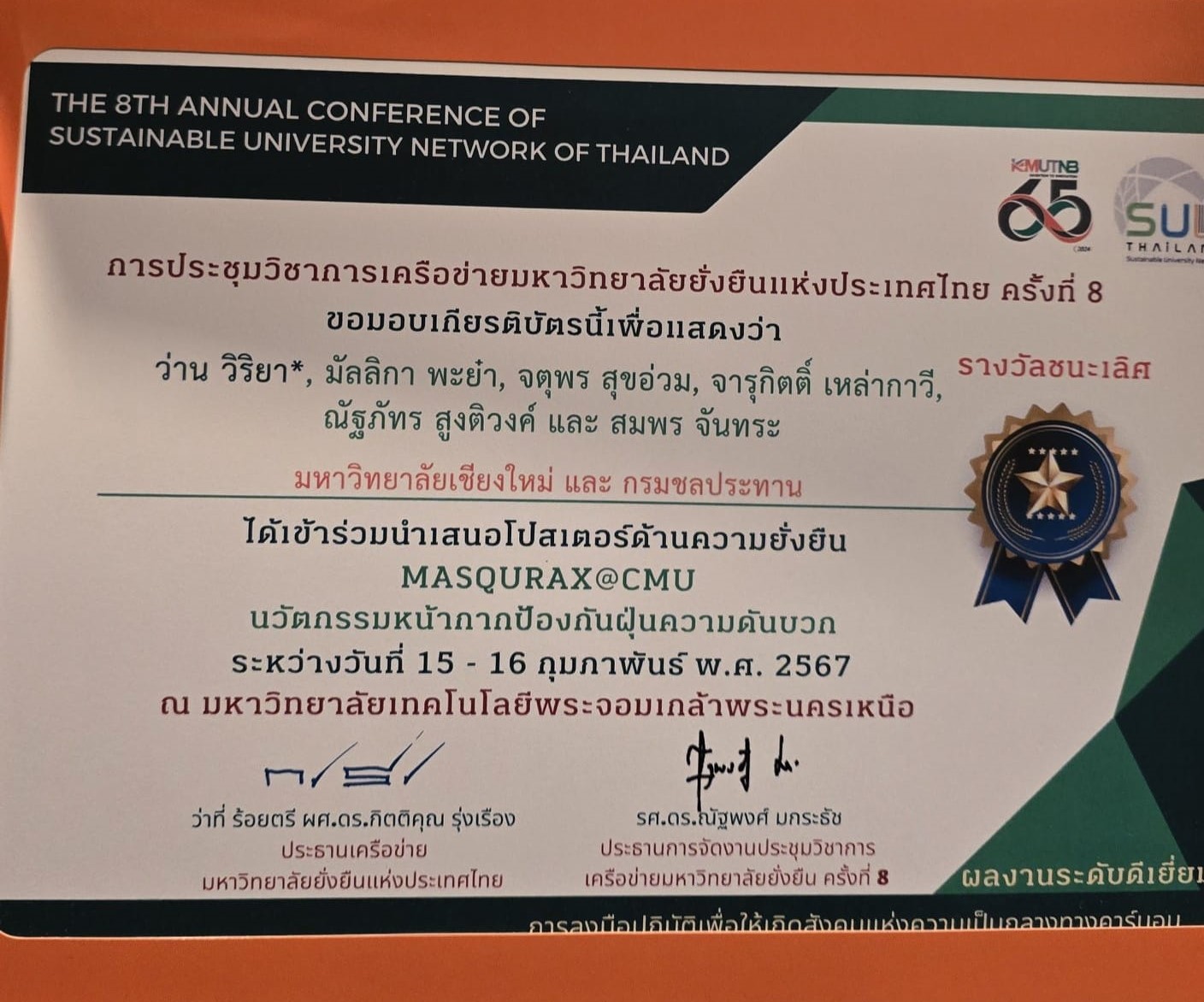 ผศ.ดร.ว่าน วิริยา ภาควิชาเคมี คณะวิทยาศาสตร์ และทีม ได้รับรางวัลการนำเสนอผลงานยอดเยี่ยม ด้าน Sustainability จากงานประชุมวิชาการ SUN Thailand ประจำปี 2566 (การประชุมวิชาการประจำปีเครือข่ายมหาวิทยาลัยยั่งยืนแห่งประเทศไทย ครั้งที่ 8) ซึ่งจัดขึ้นเมื่อวันที่ 15-16 กุมภาพันธ์ 2567 ณ มหาวิทยาลัยเทคโนโลยีพระจอมเกล้าพระนครเหนือ
