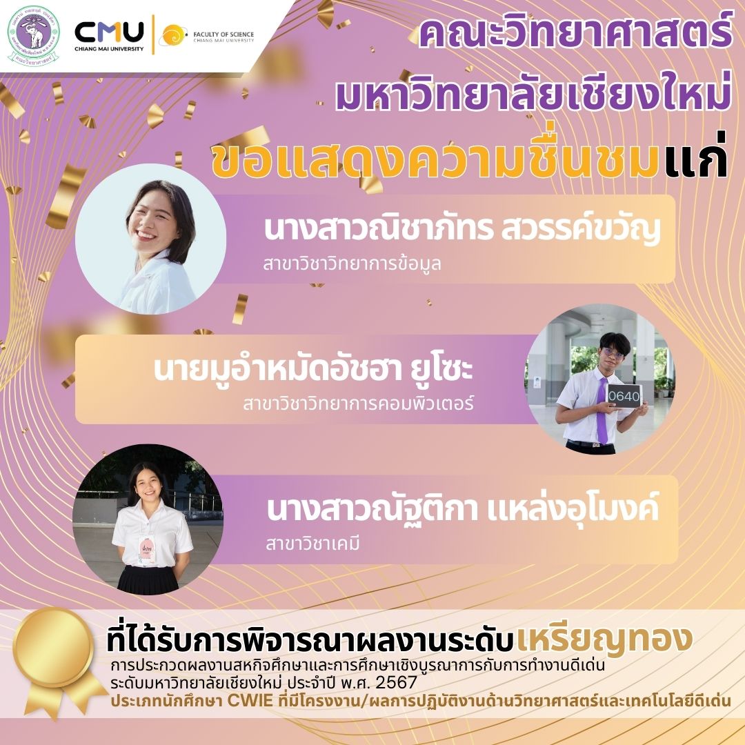 นักศึกษาคณะวิทยาศาสตร์ มช. ได้รับรางวัลการประกวดผลงานสหกิจศึกษาและการศึกษาเชิงบูรณาการกับการทำงานดีเด่น (CWIE) ประจำปี พ.ศ. 2567 ระดับมหาวิทยาลัย และระดับเครือข่ายพัฒนาสหกิจศึกษาและการบูรณาการกับการทำงานภาคเหนือตอนบน โดยมหาวิทยาลัยเชียงใหม่จะส่งผลงานเข้าร่วมประกวดในระดับชาติต่อไป