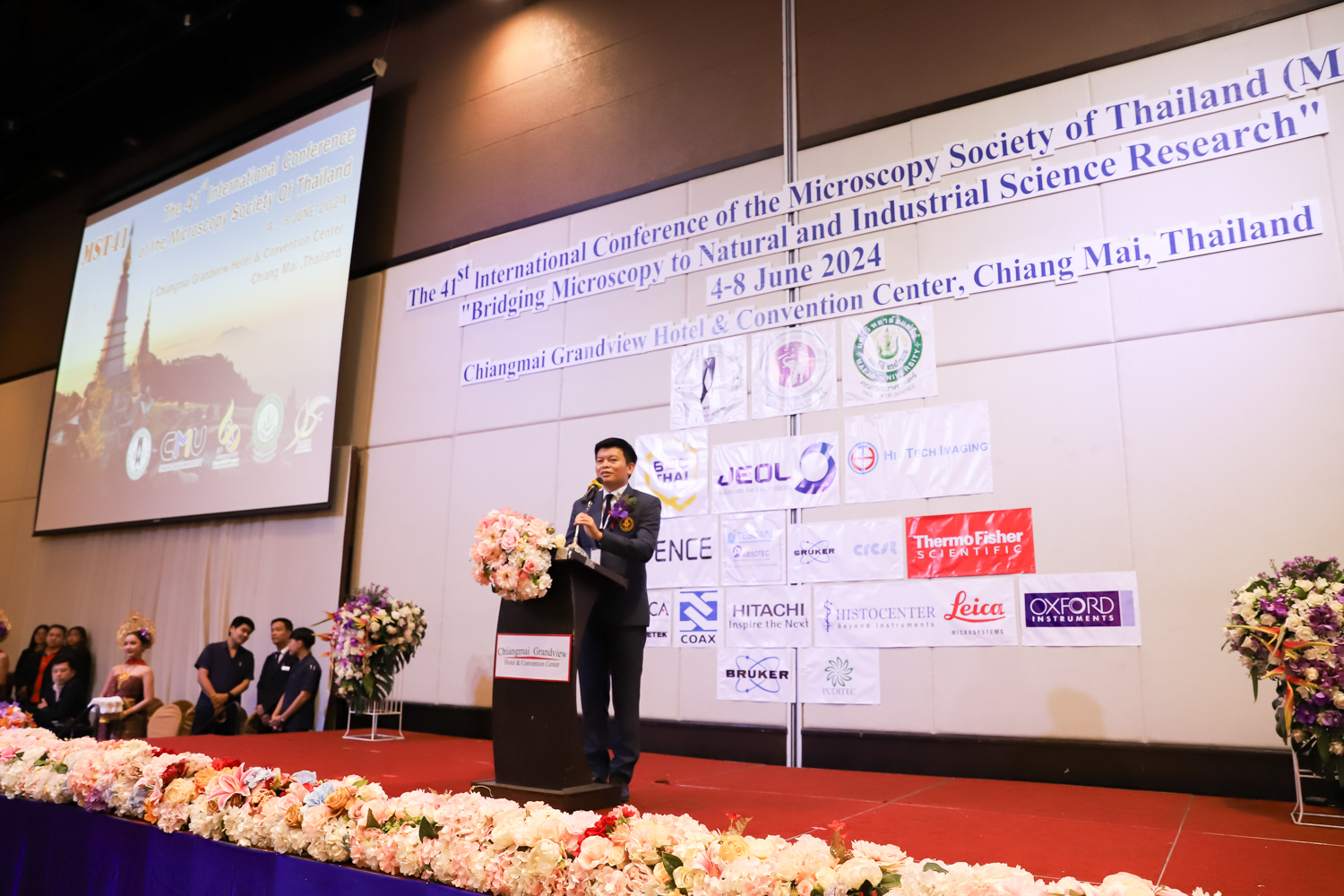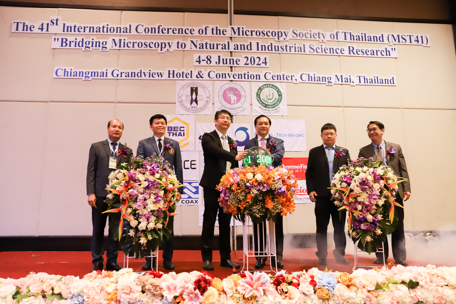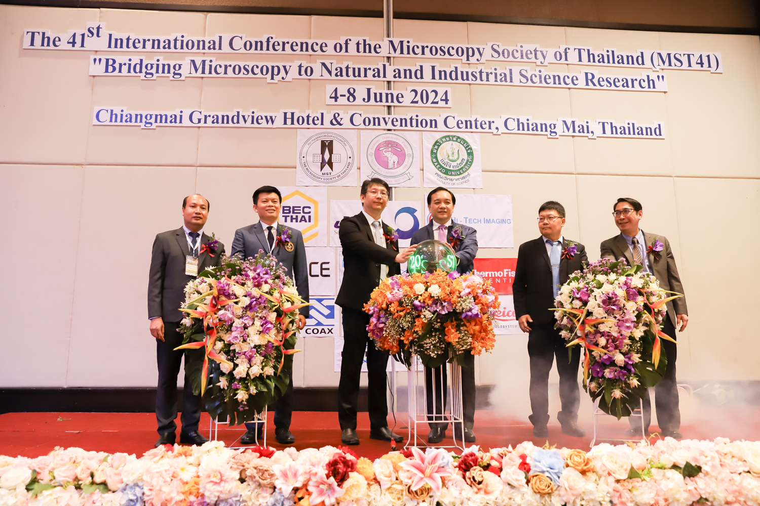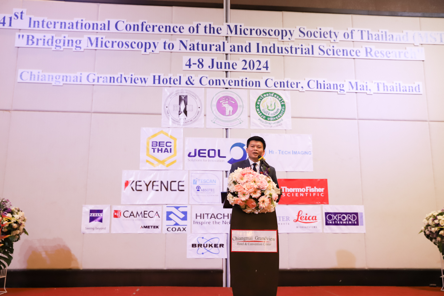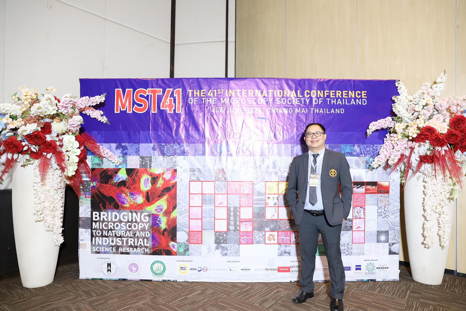 st International Conference of The Microscopy Society of Thailand (MST41)” ระหว่างวันที่ 4-8 มิถุนายน 2567 ณ โรงแรมเชียงใหม่แกรนด์วิว โดยได้รับเกียรติจาก ศาสตราจารย์ปฏิบัติ ดร.ชรินทร์ เตชะพันธุ์ รองอธิการบดี มหาวิทยาลัยเชียงใหม่ และรองศาสตราจารย์ ดร.ชัยยศ สัมฤทธิ์สกุล รักษาการแทนรองอธิการบดี มหาวิทยาลัยแม่โจ้ เป็นประธานเปิดงาน รองศาสตราจารย์ ดร.วิสุทธิ์ ประดิษฐ์อาชีพ นายกสมาคมจุลทรรศน์แห่งประเทศไทย กล่าวต้อนรับผู้เข้าร่วมงาน และผู้ช่วยศาสตราจารย์ ดร.วรพงษ์ เทียมสอน หัวหน้าภาควิชาเคมีอุตสากรรม กล่าวรายงานความเป็นมาของการจัดงาน ในวันที่ 6 มิถุนายน 2567 ณ โรงแรมเชียงใหม่แกรนด์วิว
