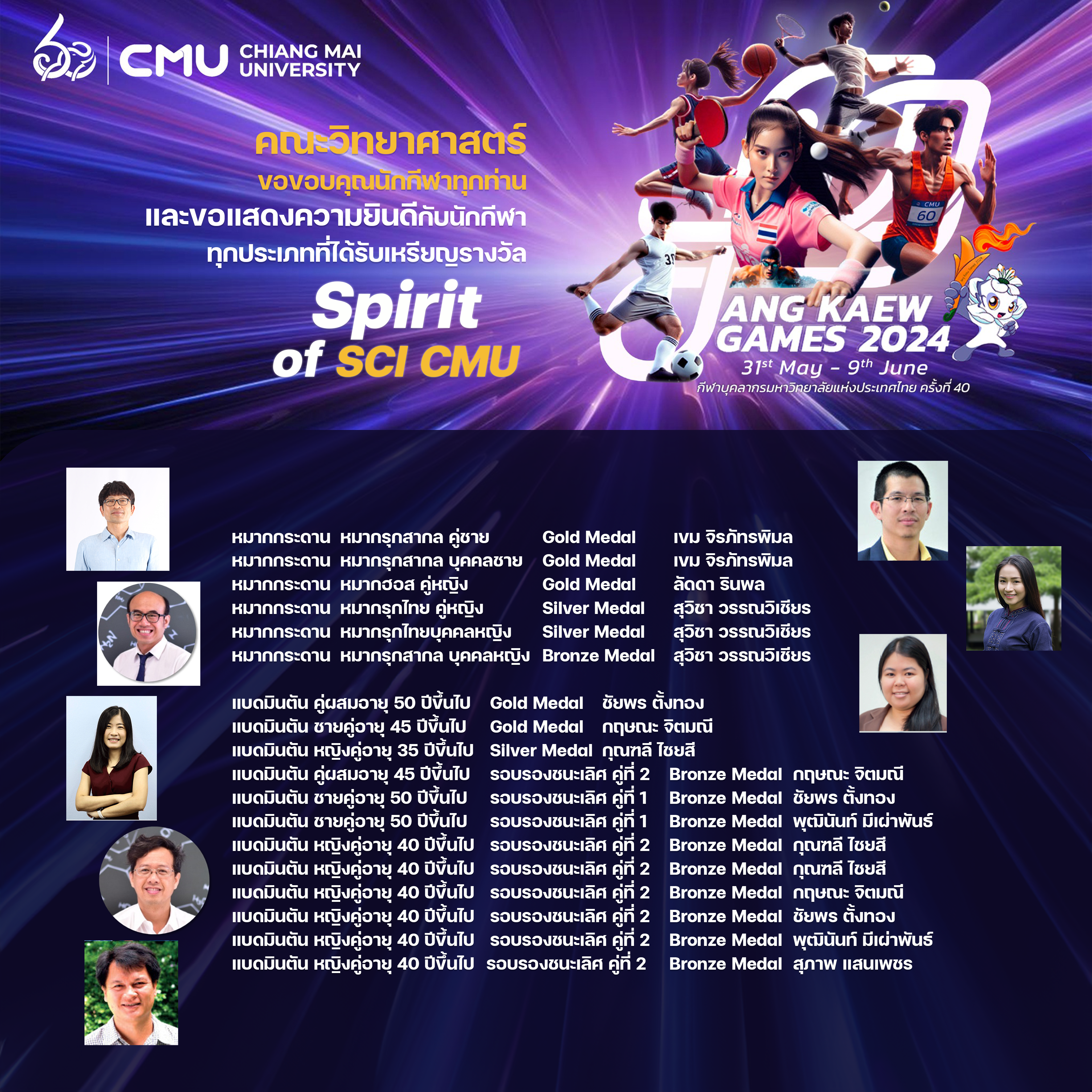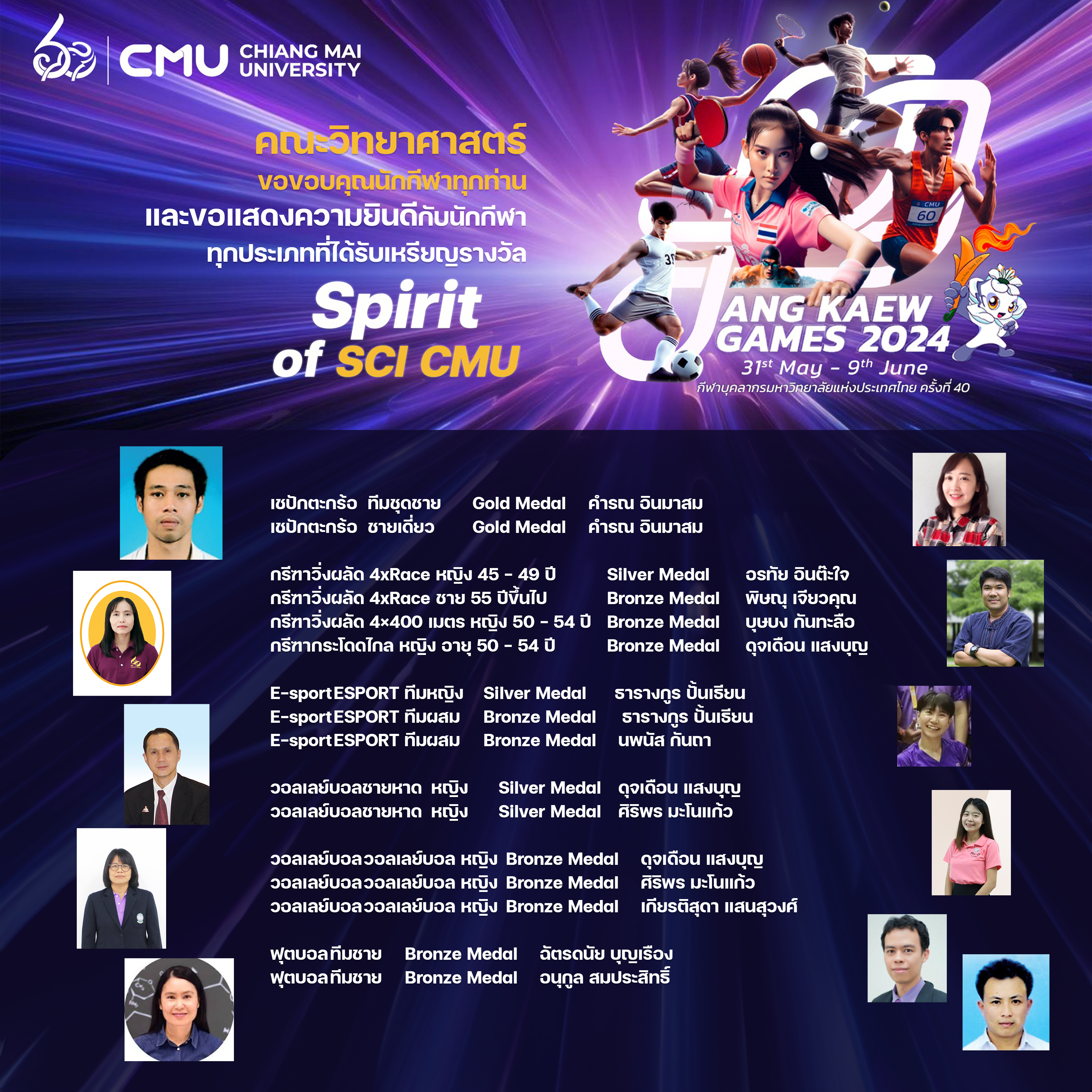 คณะวิทยาศาสตร์ขอขอบคุณนักกีฬาทุกท่าน และขอแสดงความยินดีกับนักกีฬาทุกประเภทที่ได้รับเหรียญรางวัล