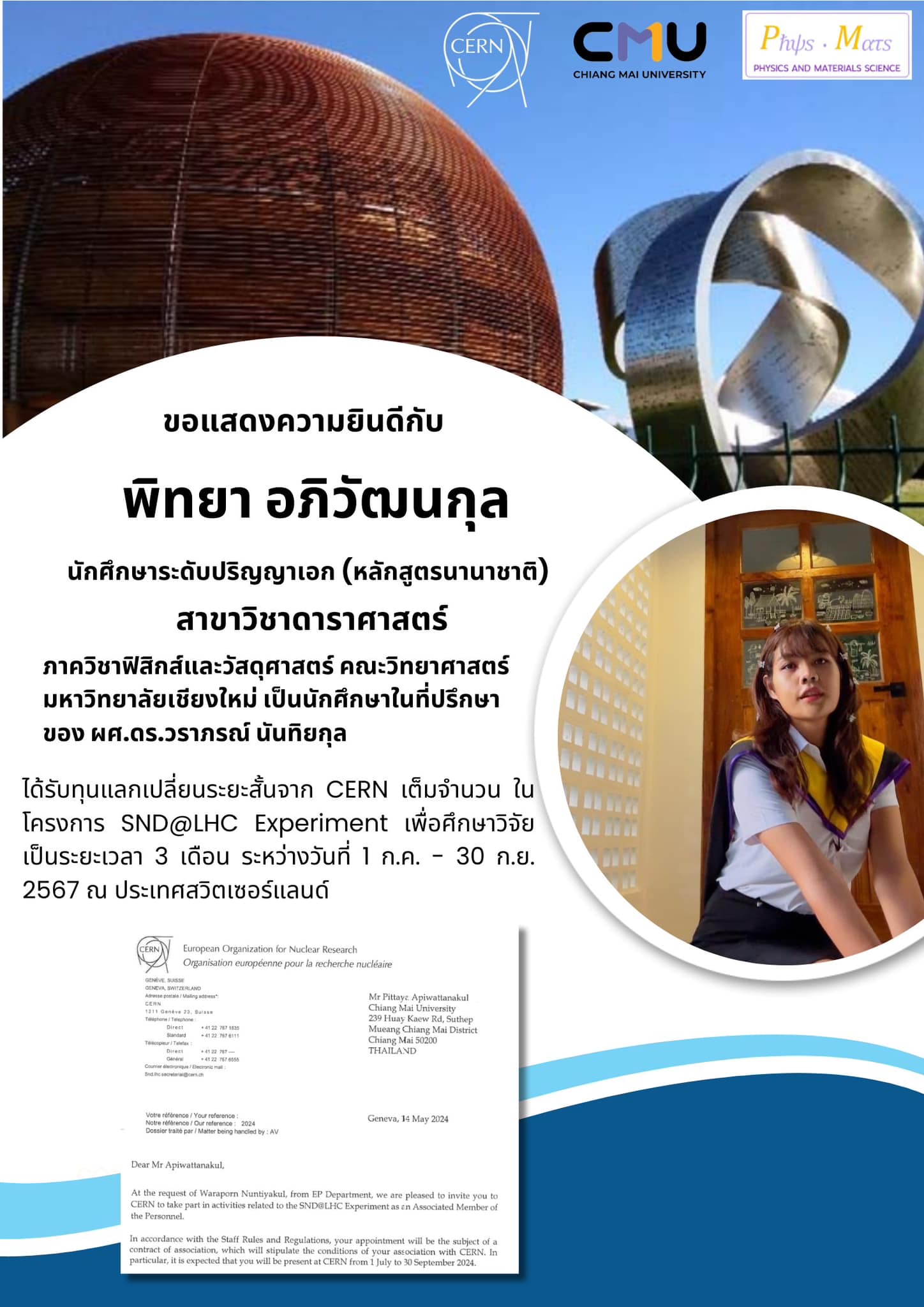 ขอแสดงความยินดีกับ “พิทยา อภิวัฒนกุล” นักศึกษาระดับปริญญาเอก (หลักสูตรนานาชาติ) สาขาดาราศาสตร์ ภาควิชาฟิสิกส์และวัสดุศาสตร์ คณะวิทยาศาสตร์ มหาวิทยาลัยเชียงใหม่ ซึ่งมี ผศ.ดร.วราภรณ์ นันทิยกุล เป็นอาจารย์ที่ปรึกษา ที่ได้รับทุนแลกเปลี่ยนระยะสั้นจาก CERN เต็มจำนวน ในโครงการ SND@LHC Experiment เพื่อศึกษาวิจัยเป็นระยะเวลา 3 เดือน ระหว่างวันที่ 1 ก.ค. - 30 ก.ย.67 ณ ประเทศสวิตเซอร์แลนด์