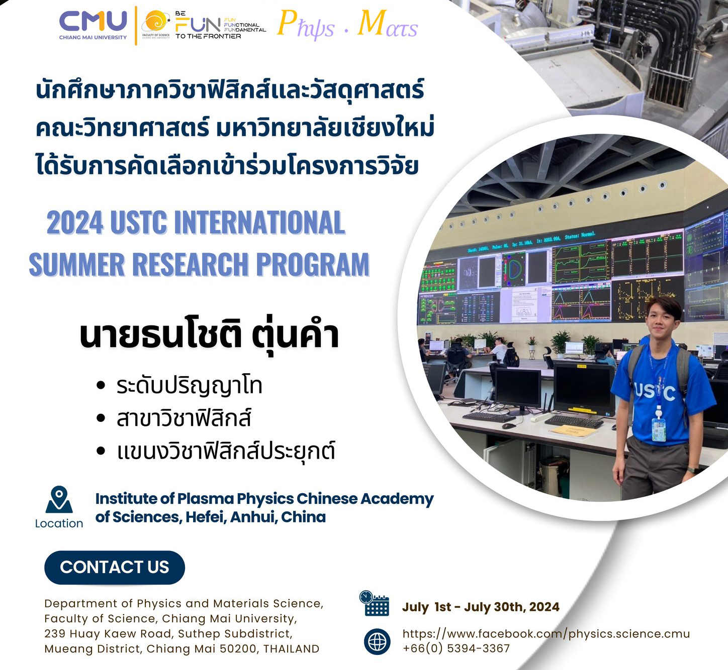 นายธนโชติ ตุ่นคำ นักศึกษาระดับปริญญาโท สาขาวิชาฟิสิกส์ (แขนงวิชาฟิสิกส์ประยุกต์) ได้รับการคัดเลือกเข้าร่วมโครงการวิจัยภาคฤดูร้อน 2024 USTC INTERNATIONAL SUMMER RESEARCH PROGRAM) ณ Institute of Plasma Physics Chinese Academy of Sciences, Hefei, Anhui, China http://english.ipp.cas.cn/ สาธารณรัฐประชาชนจีน ระหว่างวันที่ 1 กรกฎาคม ถึงวันที่ 30 กรกฎาคม 2567