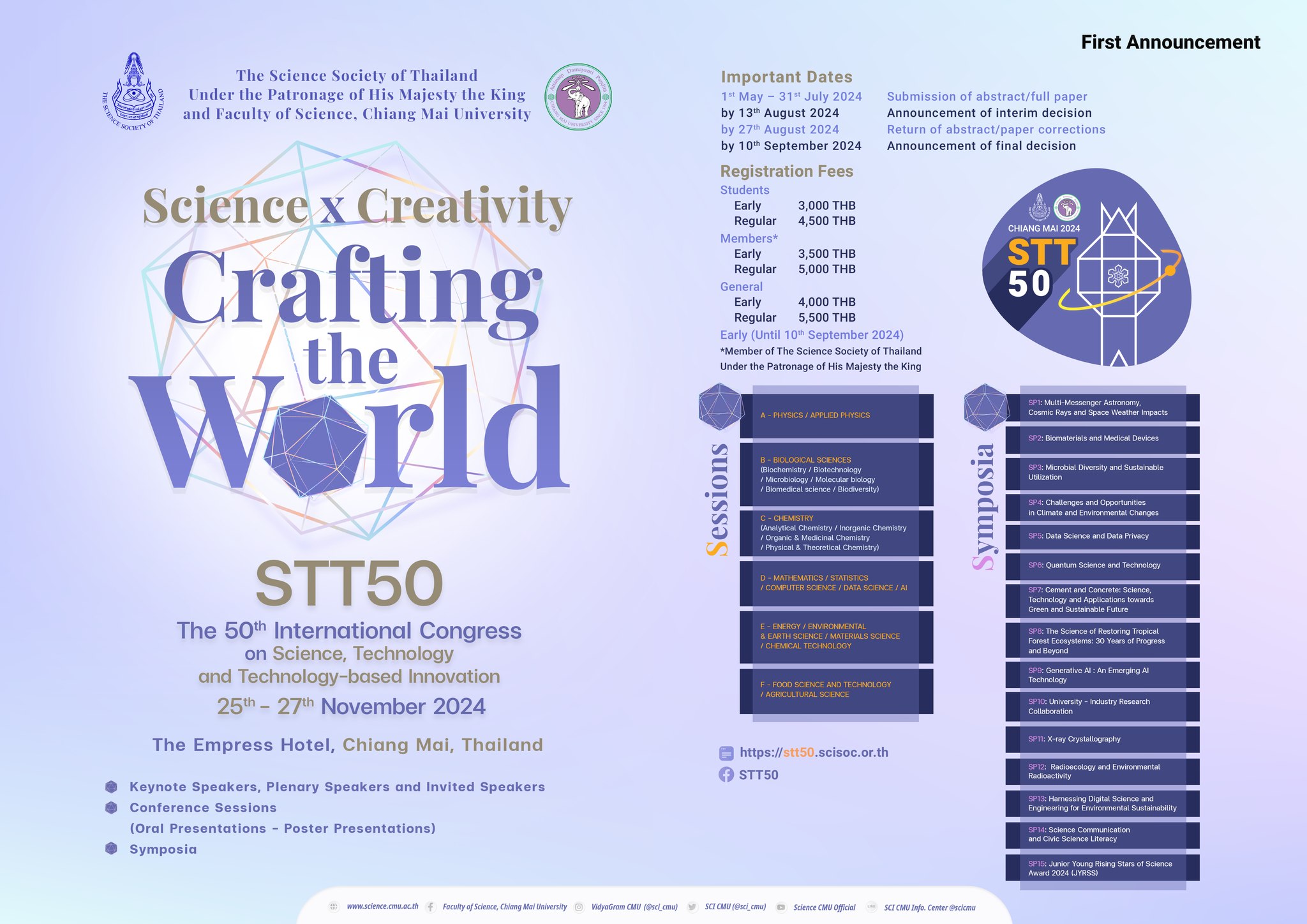 สมาคมวิทยาศาสตร์แห่งประเทศไทย ในพระบรมราชูปถัมภ์ ร่วมกับ คณะวิทยาศาสตร์ มหาวิทยาลัยเชียงใหม่ จะจัดการประชุมวิชาการนานาชาติด้านวิทยาศาสตร์ เทคโนโลยีและนวัตกรรมทางเทคโนโลยี ครั้งที่ 50 (STT50) ในระหว่างวันที่ 25 - 27 พฤศจิกายน 2567 ณ โรงแรมดิเอ็มเพรส จังหวัดเชียงใหม่ ภายใต้แนวความคิด "Science x Creativity : Crafting the World"