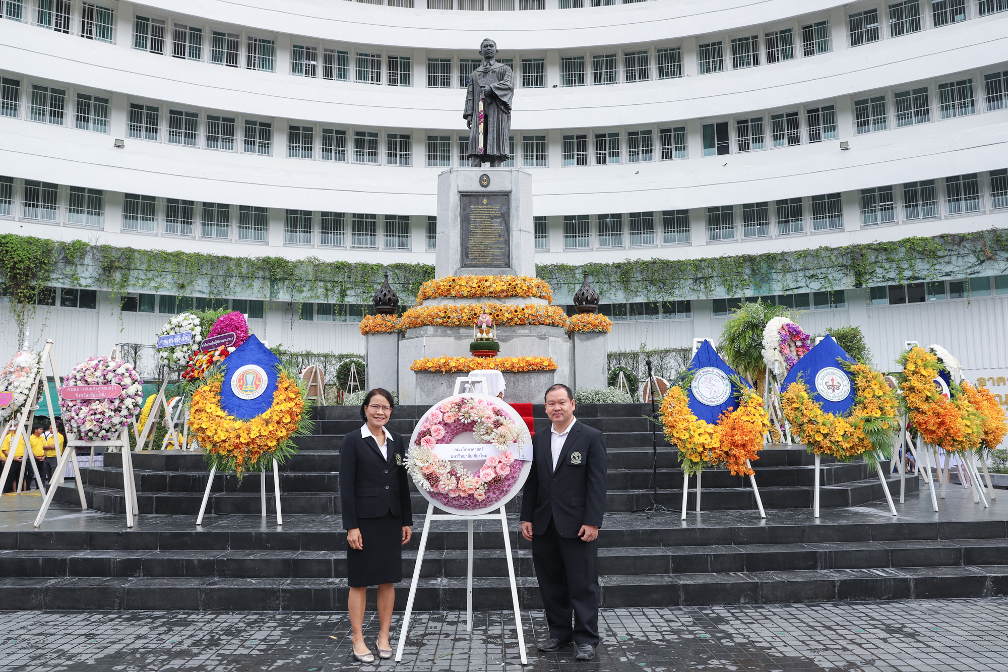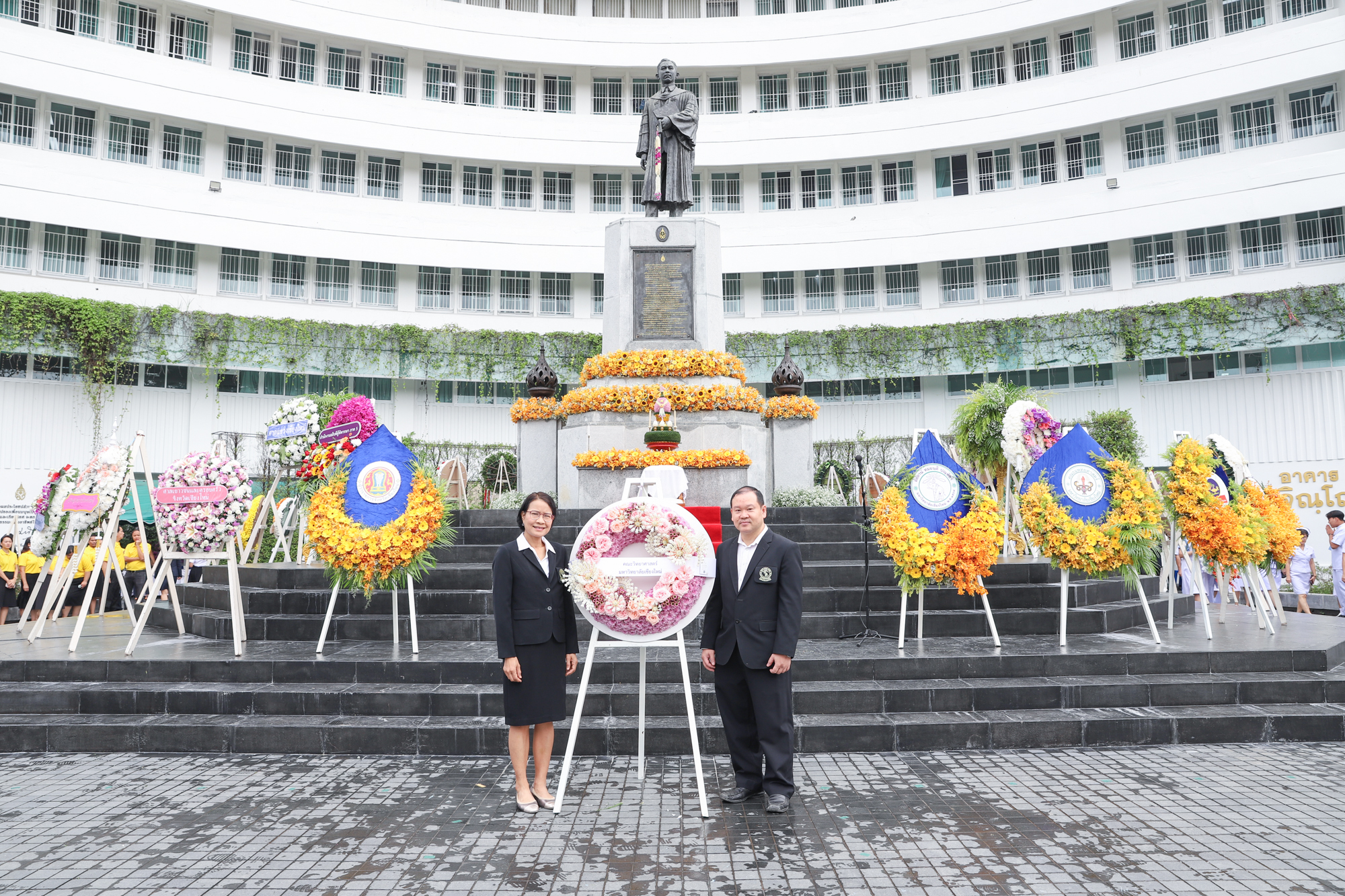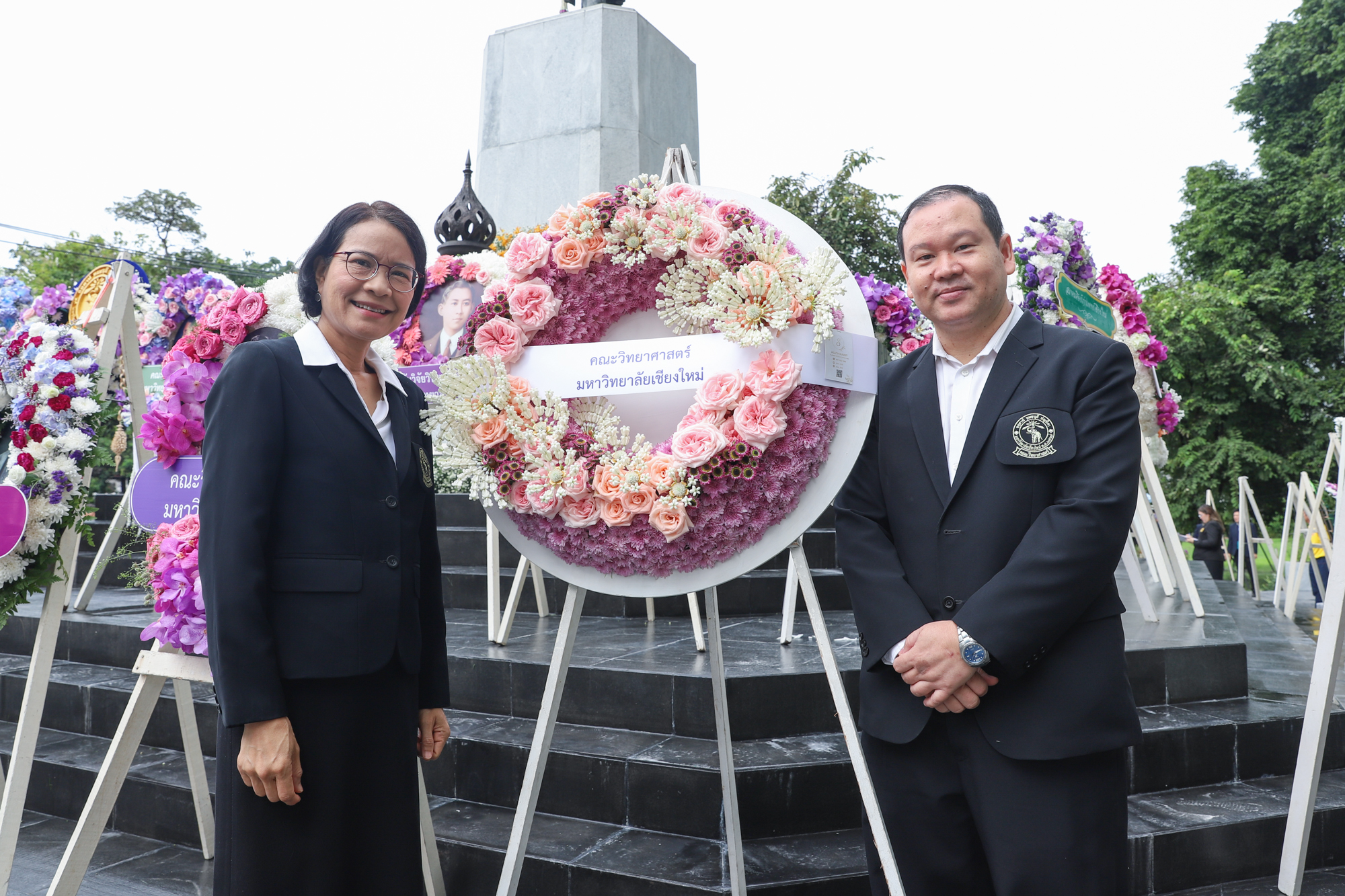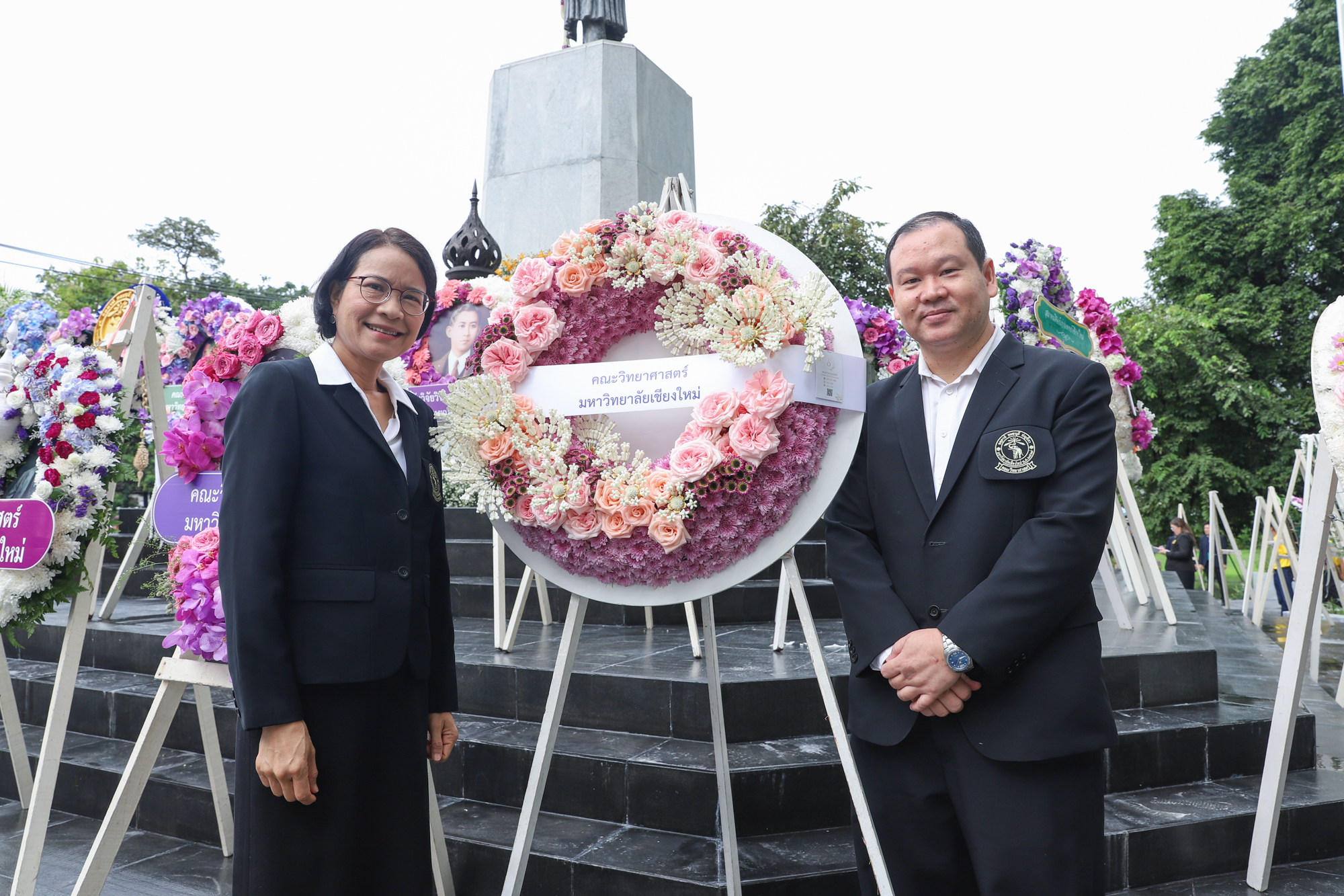 รองศาสตราจารย์ ดร.หทัยชนก เนียมทรัพย์ รองคณบดีฝ่ายบริหาร คณะวิทยาศาสตร์ พร้อมด้วยอาจารย์ ดร. วรวุฒิ ศรีสุขคำ ผู้ช่วยคณบดีฝ่ายกายภาพ ร่วมพิธีวางพวงมาลาถวายบังคมพระราชานุสาวรีย์สมเด็จพระมหิตลาธิเบศร อดุลยเดชวิกรม พระบรมราชชนก เนื่องในวันมหิดล ประจำปี 2567 ณ ลานพระบรมราชานุสาวรีย์ฯ คณะแพทยศาสตร์ มหาวิทยาลัยเชียงใหม่ เมื่อวันที่ 24 กันยายน พ.ศ. 2567