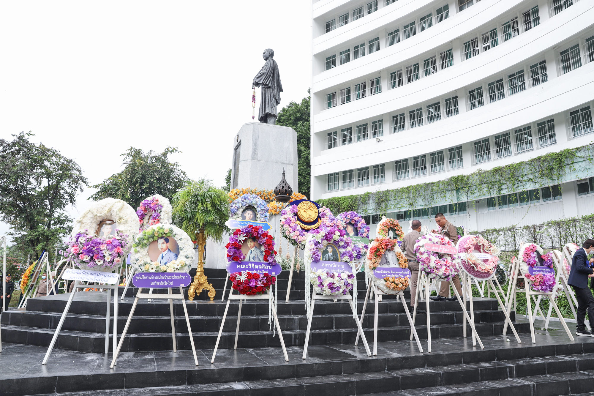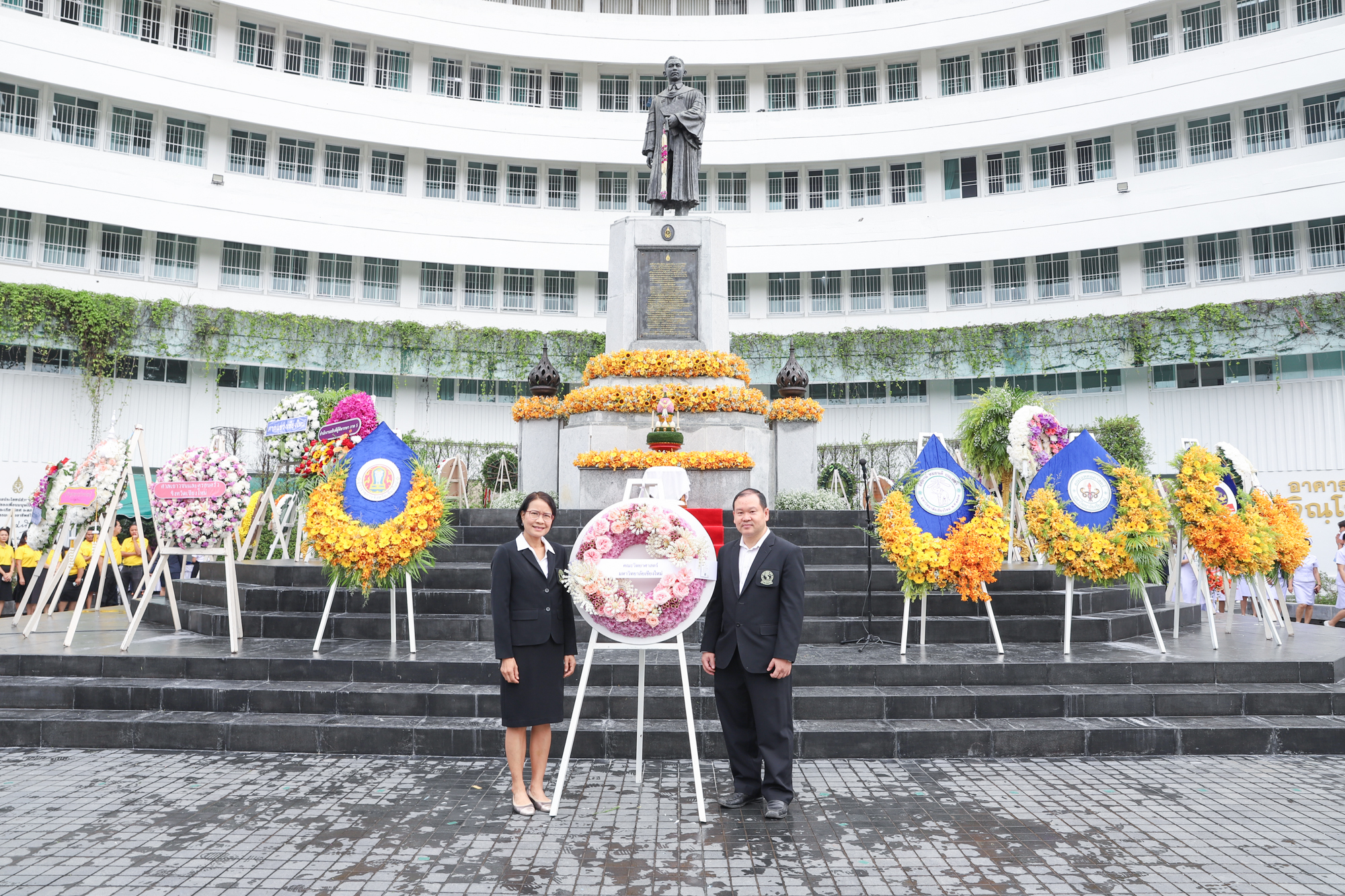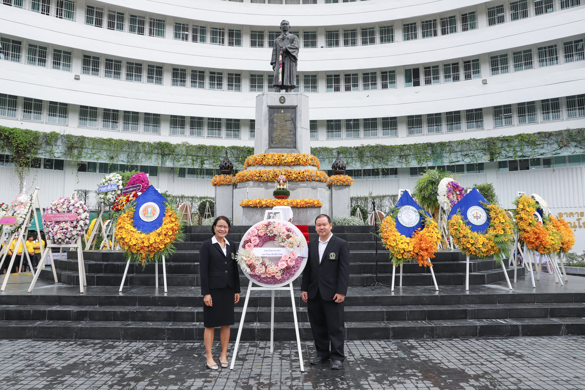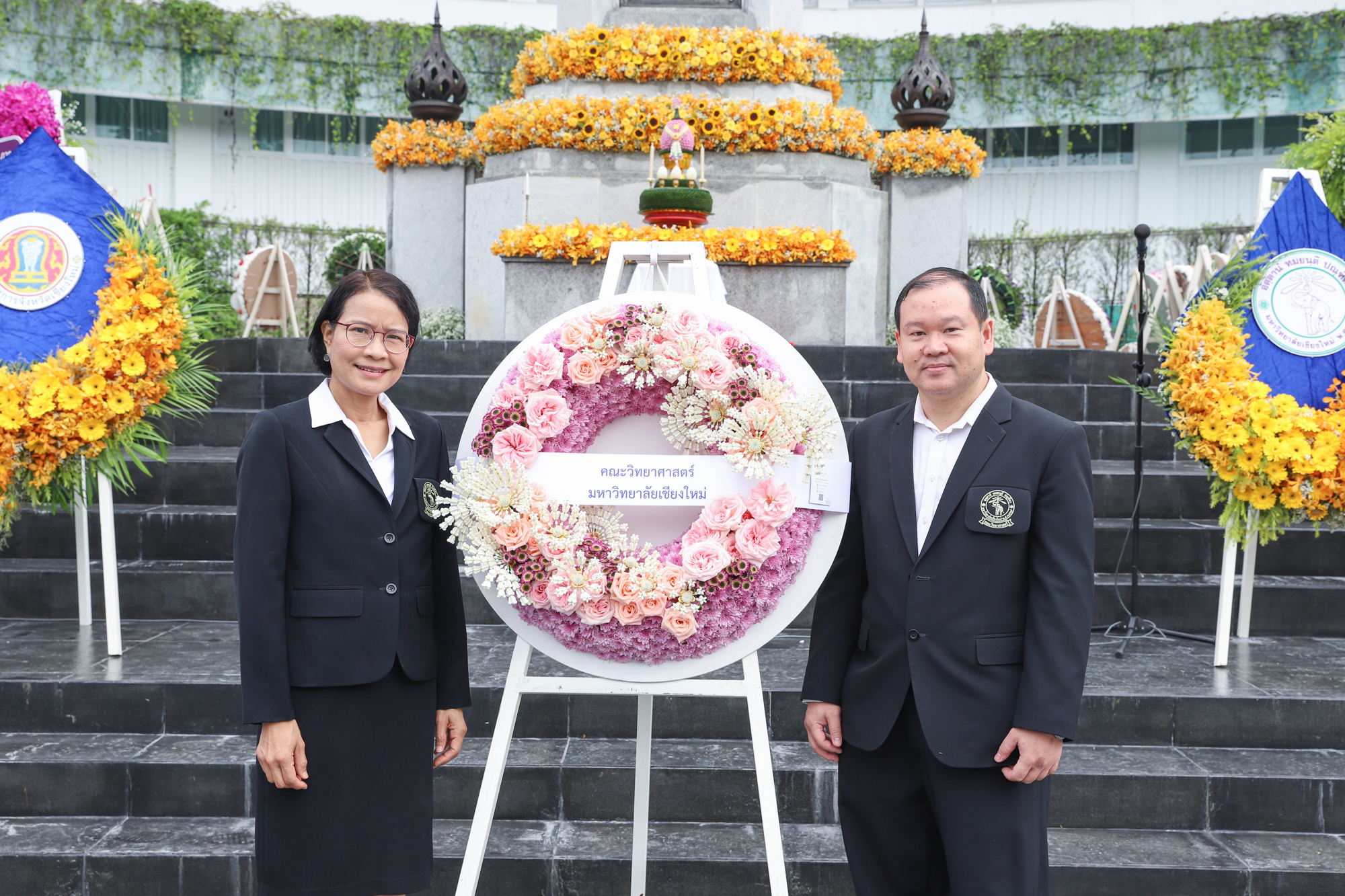 รองศาสตราจารย์ ดร.หทัยชนก เนียมทรัพย์ รองคณบดีฝ่ายบริหาร คณะวิทยาศาสตร์ พร้อมด้วยอาจารย์ ดร. วรวุฒิ ศรีสุขคำ ผู้ช่วยคณบดีฝ่ายกายภาพ ร่วมพิธีวางพวงมาลาถวายบังคมพระราชานุสาวรีย์สมเด็จพระมหิตลาธิเบศร อดุลยเดชวิกรม พระบรมราชชนก เนื่องในวันมหิดล ประจำปี 2567 ณ ลานพระบรมราชานุสาวรีย์ฯ คณะแพทยศาสตร์ มหาวิทยาลัยเชียงใหม่ เมื่อวันที่ 24 กันยายน พ.ศ. 2567