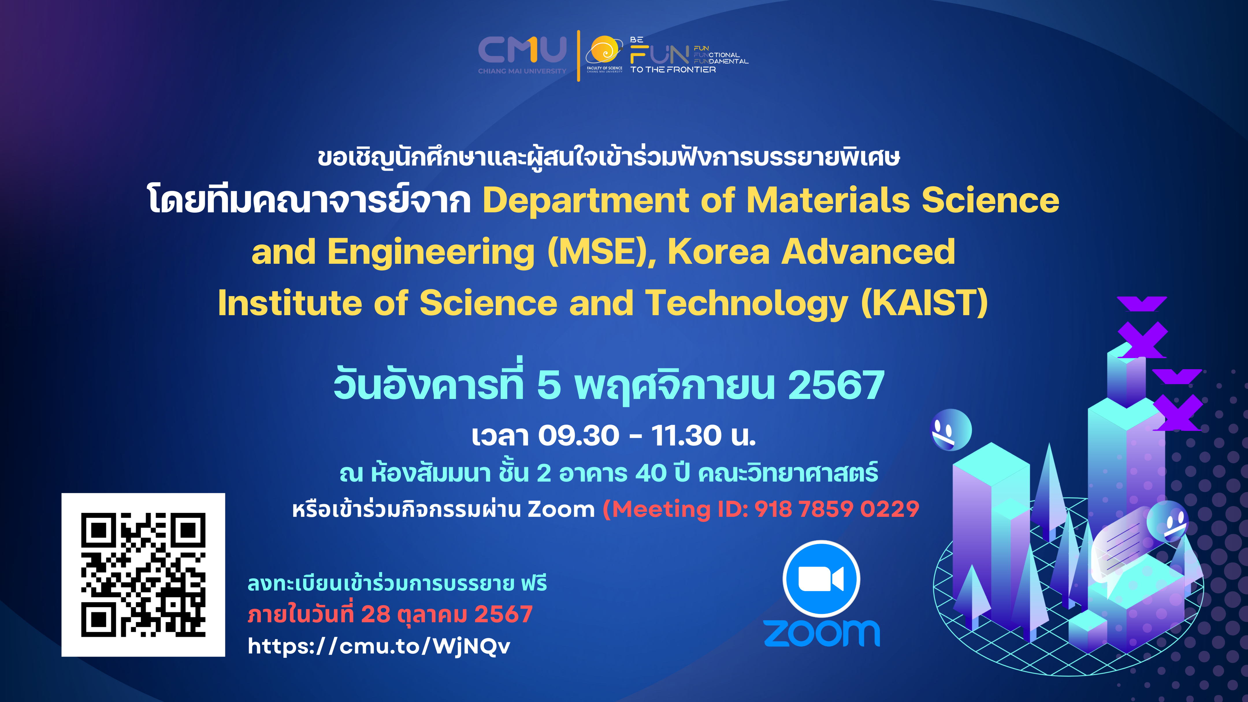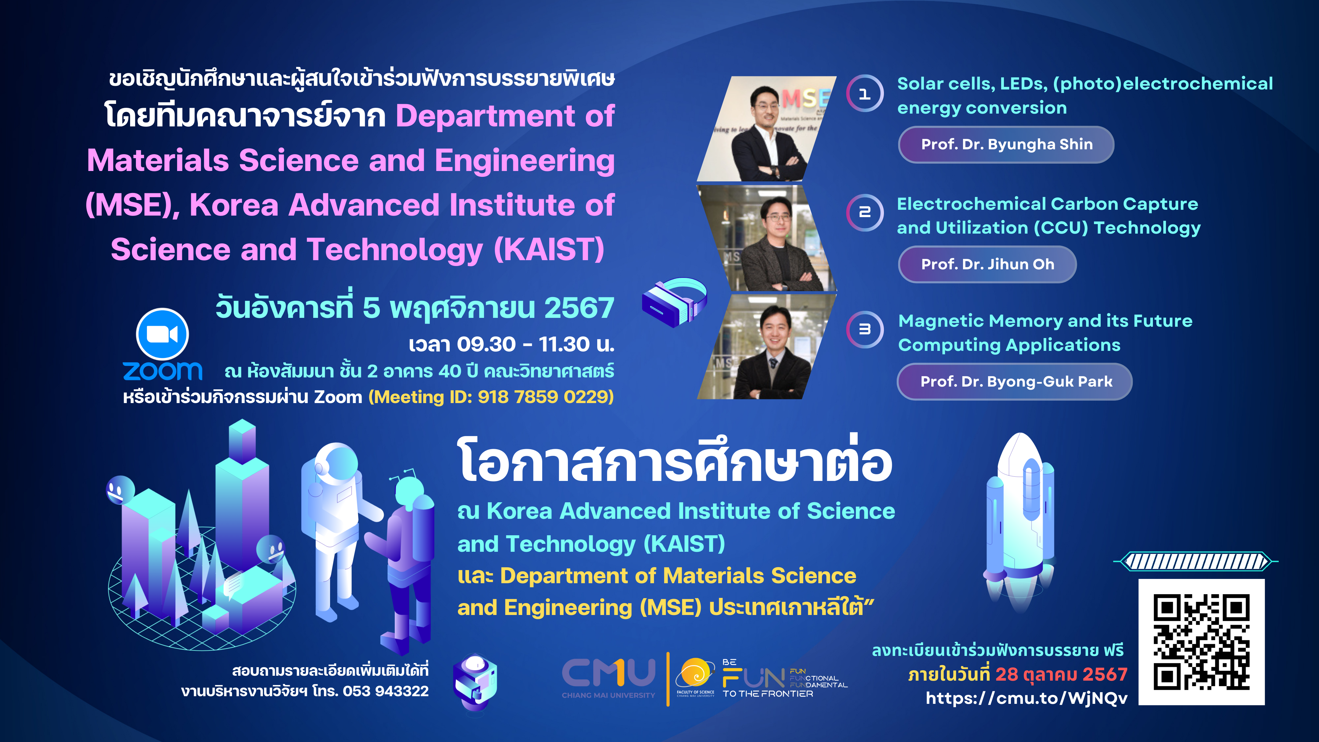 ขอเชิญนักศึกษาและผู้สนใจเข้าร่วมฟังบรรยายพิเศษ โดยคณาจารย์จาก Department of Materials Science and Engineering (MSE), Korea Advanced Institute of Science and Technology (KAIST) ประเทศเกาหลีใต้ และรับฟังการบรรยายแนะนำโอกาสการศึกษาต่อ KAIST และ MSE ในวันอังคารที่ 5 พฤศจิกายน 2567 เวลา 09.30 – 11.30 น. ณ ห้องสัมมนา ชั้น 2 อาคาร 40 ปี คณะวิทยาศาสตร์ ฟรี! หรือเข้าร่วมกิจกรรมผ่าน Zoom (Meeting ID: 918 7859 0229