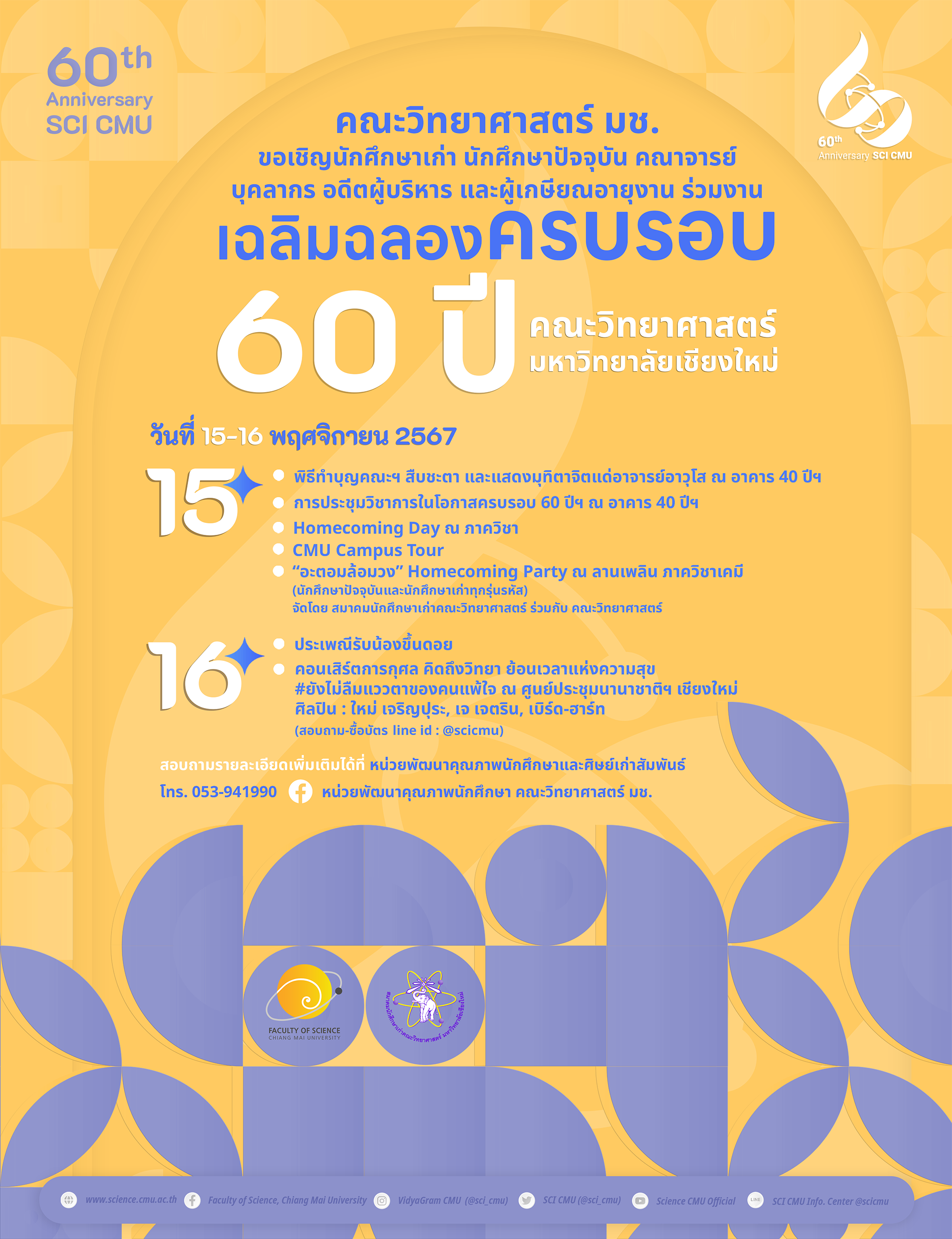 คณะวิทยาศาสตร์และสมาคมนักศึกษาเก่าคณะวิทยาศาสตร์ ขอเชิญนักศึกษาเก่า นักศึกษาปัจจุบัน คณาจารย์ บุคลากร อดีตผู้บริหาร และผู้เกษียณอายุงาน ร่วมงานเฉลิมฉลองครบรอบ 60 ปี คณะวิทยาศาสตร์ มหาวิทยาลัยเชียงใหม่ ระหว่างวันที่ 15-16 พฤศจิกายน 2567