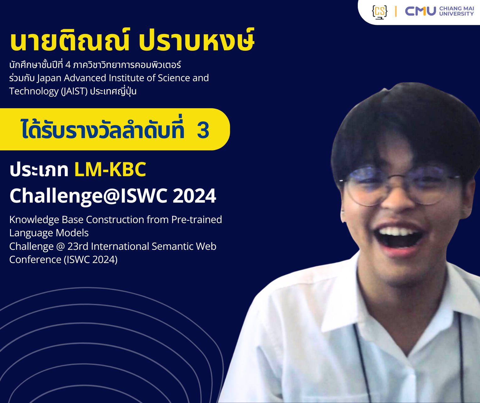 นักศึกษาชั้นปีที่ 4 ภาควิชาวิทยาการคอมพิวเตอร์ คณะวิทยาศาสตร์ มหาวิทยาลัยเชียงใหม่ ร่วมกับ Japan Advanced Institute of Science and Technology (JAIST) ประเทศญี่ปุ่น ได้รับรางวัลในการแข่งขันระดับนานาชาติ ประเภท Challenge@ISWC 2024 ในงาน THE 23RD INTERNATIONAL SEMANTIC WEB CONFERENCE (ISWC 2024)