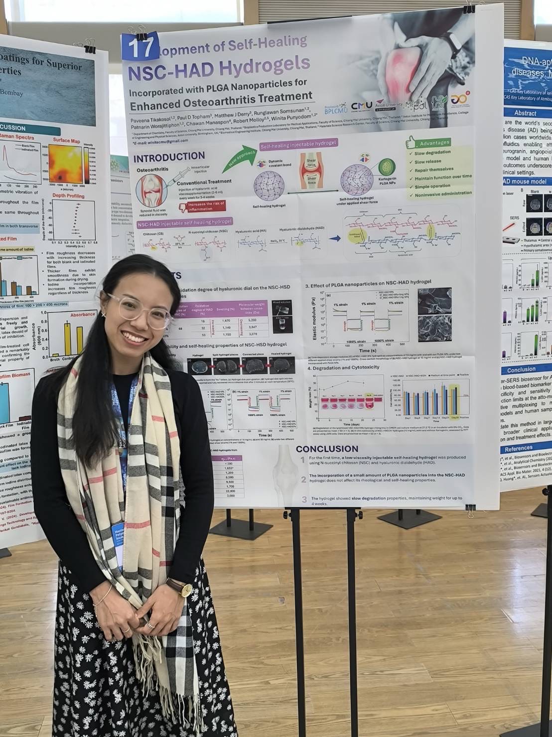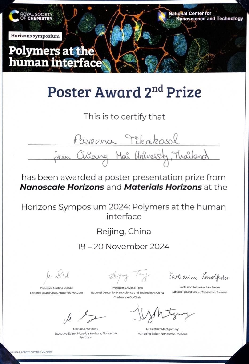 นางสาวปวีณา ติกะโกศล นักศึกษาระดับปริญญาเอก สาขาวิชาเคมี ได้รับรางวัล Poster Award 2nd prize จากการนำเสนอผลงาน “Development of Self-Healing NSC-HAD Hydrogels Incorporated with PLGA Nanoparticles for Enhanced Osteoarthritis Treatment” โดยมี รศ.ดร.วินิตา บุณโยดม เป็นอาจารย์ที่ปรึกษาวิทยานิพนธ์หลัก ในงานประชุมวิชาการระดับนานาชาติ Horizons symposium: Polymers at the human interface จัดขึ้น ณ National Center for Nanoscience and Technology (NCNST), Beijing, China เมื่อวันที่ 19-20 พฤศจิกายน 2567 จัดโดย Royal Society of Chemistry