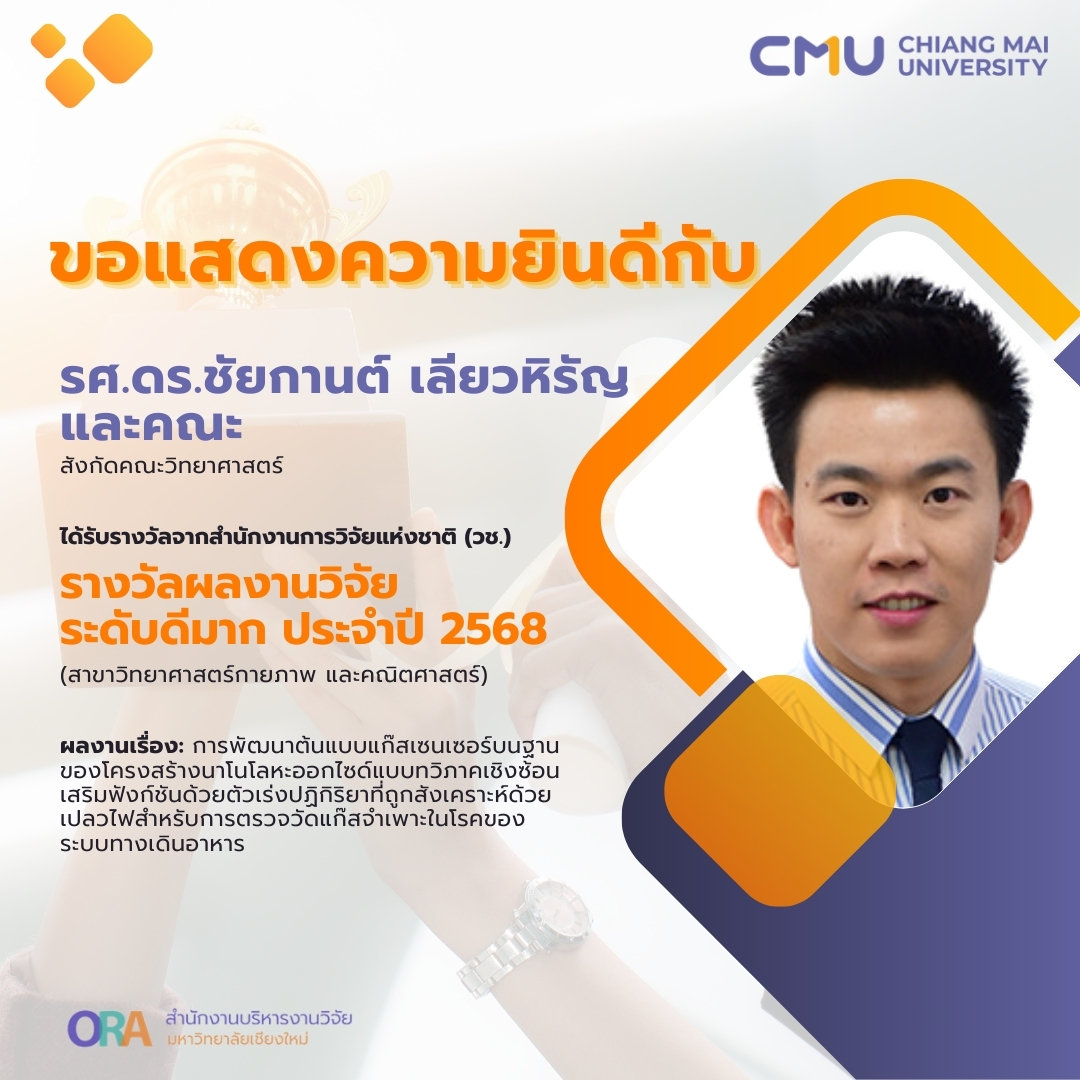รองศาสตราจารย์ ดร.ชัยกานต์ เลียวหิรัญ และคณะ สังกัดคณะวิทยาศาสตร์ ได้รับรางวัลผลงานวิจัย ระดับดีมาก (สาขาวิทยาศาสตร์กายภาพ และคณิตศาสตร์) ผลงานเรื่อง “การพัฒนาต้นแบบแก๊สเซนเซอร์บนฐานของโครงสร้างนาโนโลหะออกไซด์แบบทวิภาคเชิงซ้อนเสริมฟังก์ชันด้วยตัวเร่งปฏิกิริยาที่ถูกสังเคราะห์ด้วยเปลวไฟสำหรับการตรวจวัดแก๊สจำเพาะในโรคของระบบทางเดินอาหาร”
