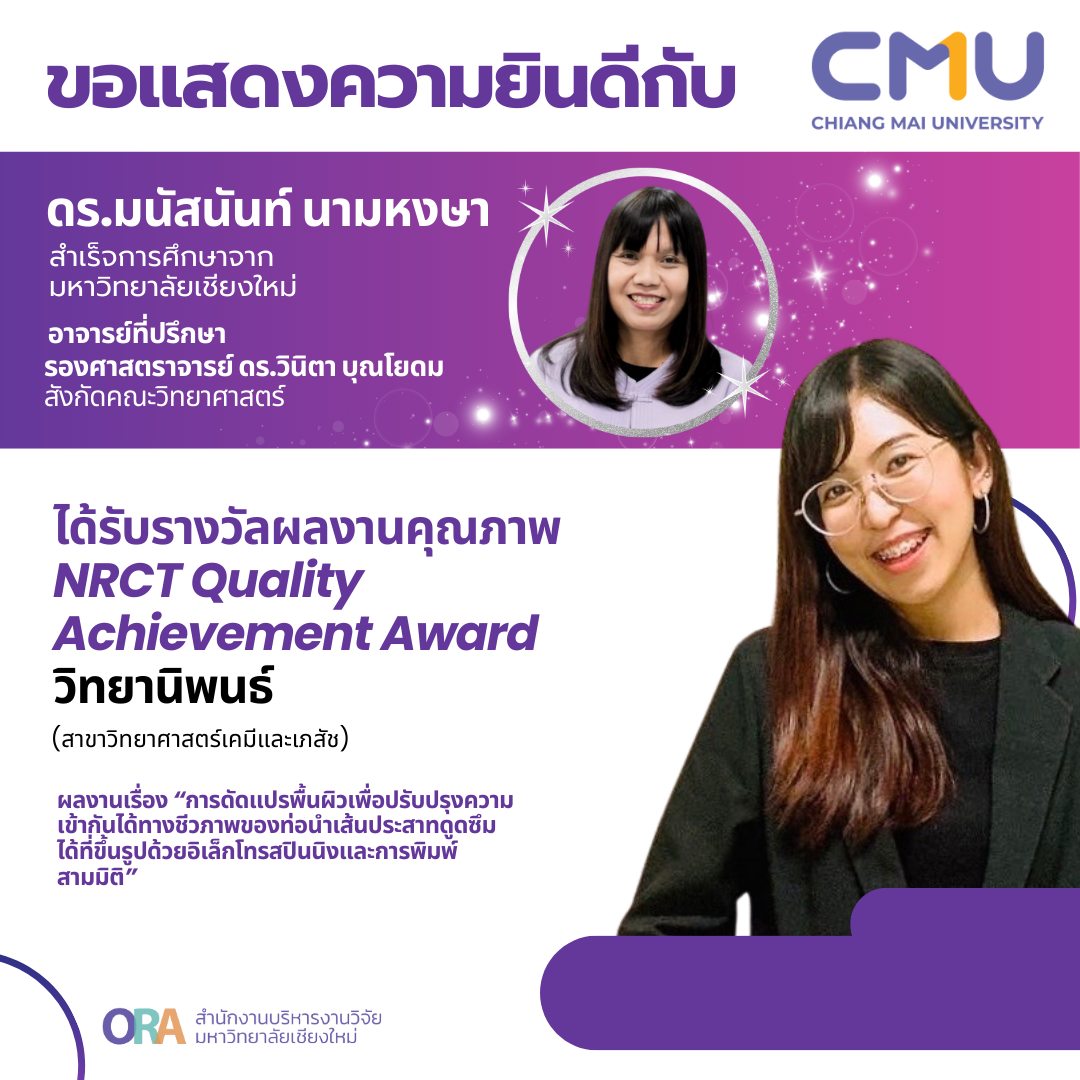 สาขาวิทยาศาสตร์เคมีและเภสัช : ผลงานเรื่อง “การดัดแปรพื้นผิวเพื่อปรับปรุงความเข้ากันได้ทางชีวภาพของท่อนำเส้นประสาทดูดซึมได้ที่ขึ้นรูปด้วยอิเล็กโทรสปินนิงและการพิมพ์สามมิติ” โดย ดร.มนัสนันท์ นามหงษา (อาจารย์ที่ปรึกษา: รองศาสตราจารย์ ดร.วินิตา บุณโยดม คณะวิทยาศาสตร์)