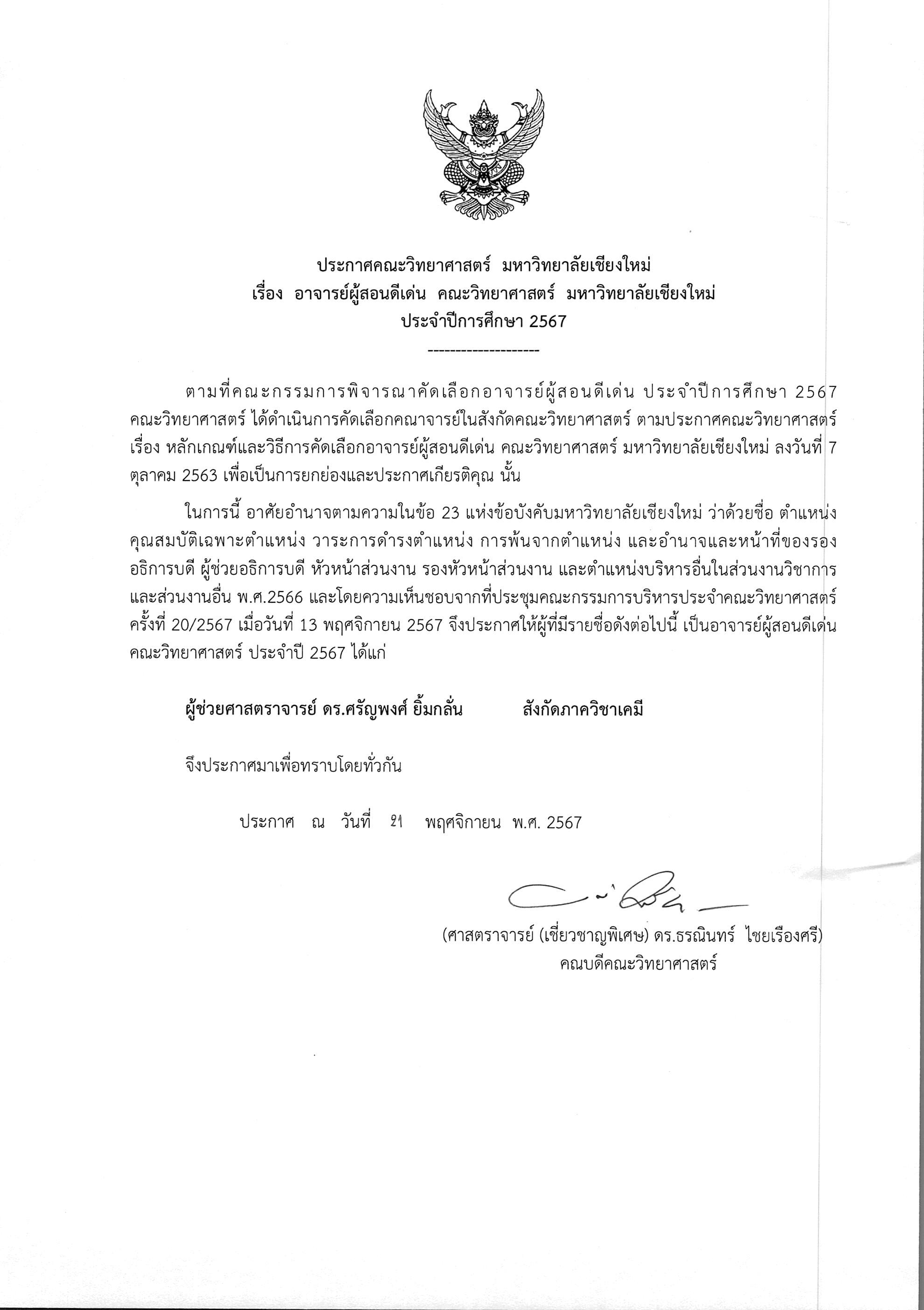 คณะวิทยาศาสตร์ขอแสดงความยินดีกับอาจารย์ที่ได้รับคัดเลือกเป็นอาจารย์ผู้สอนดีเด่นคณะวิทยาศาสตร์ ประจำปีการศึกษา 2567