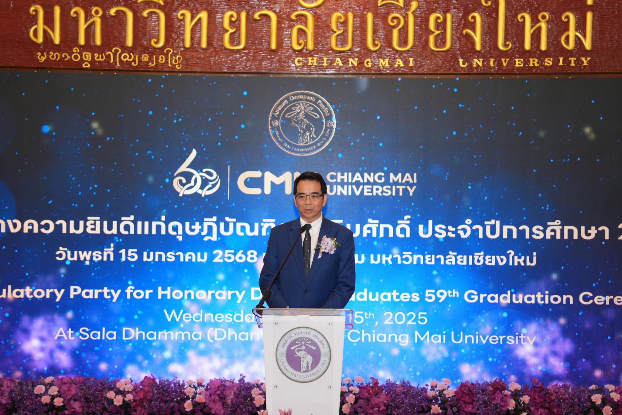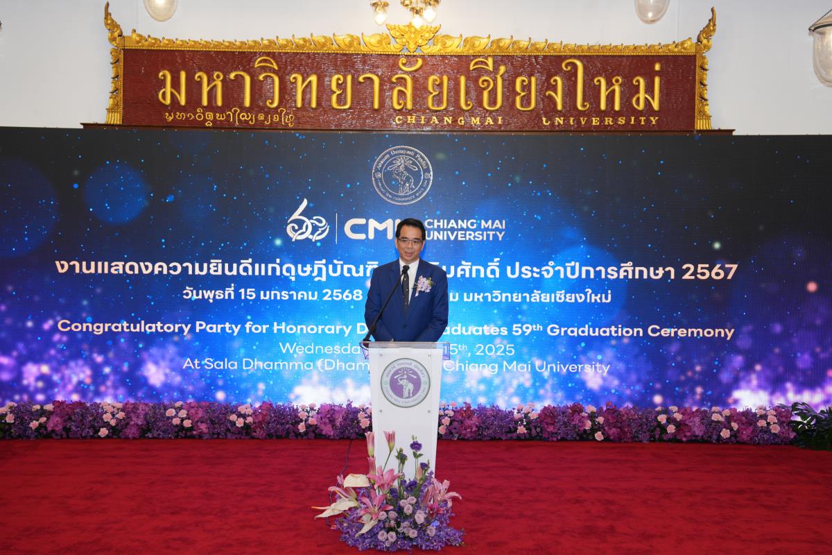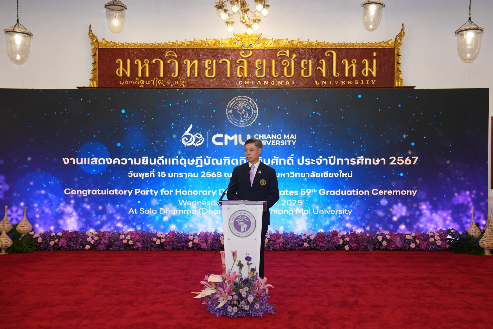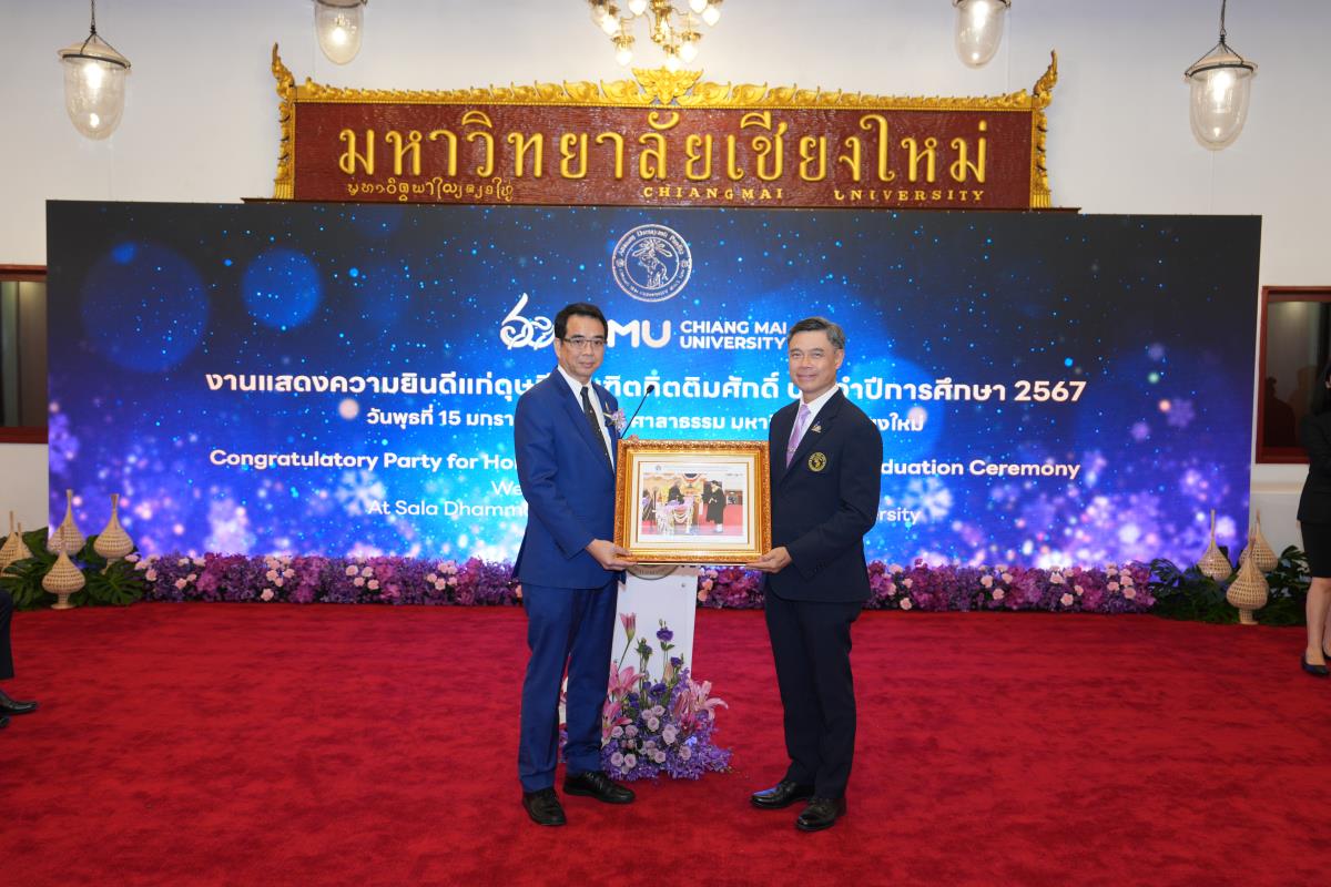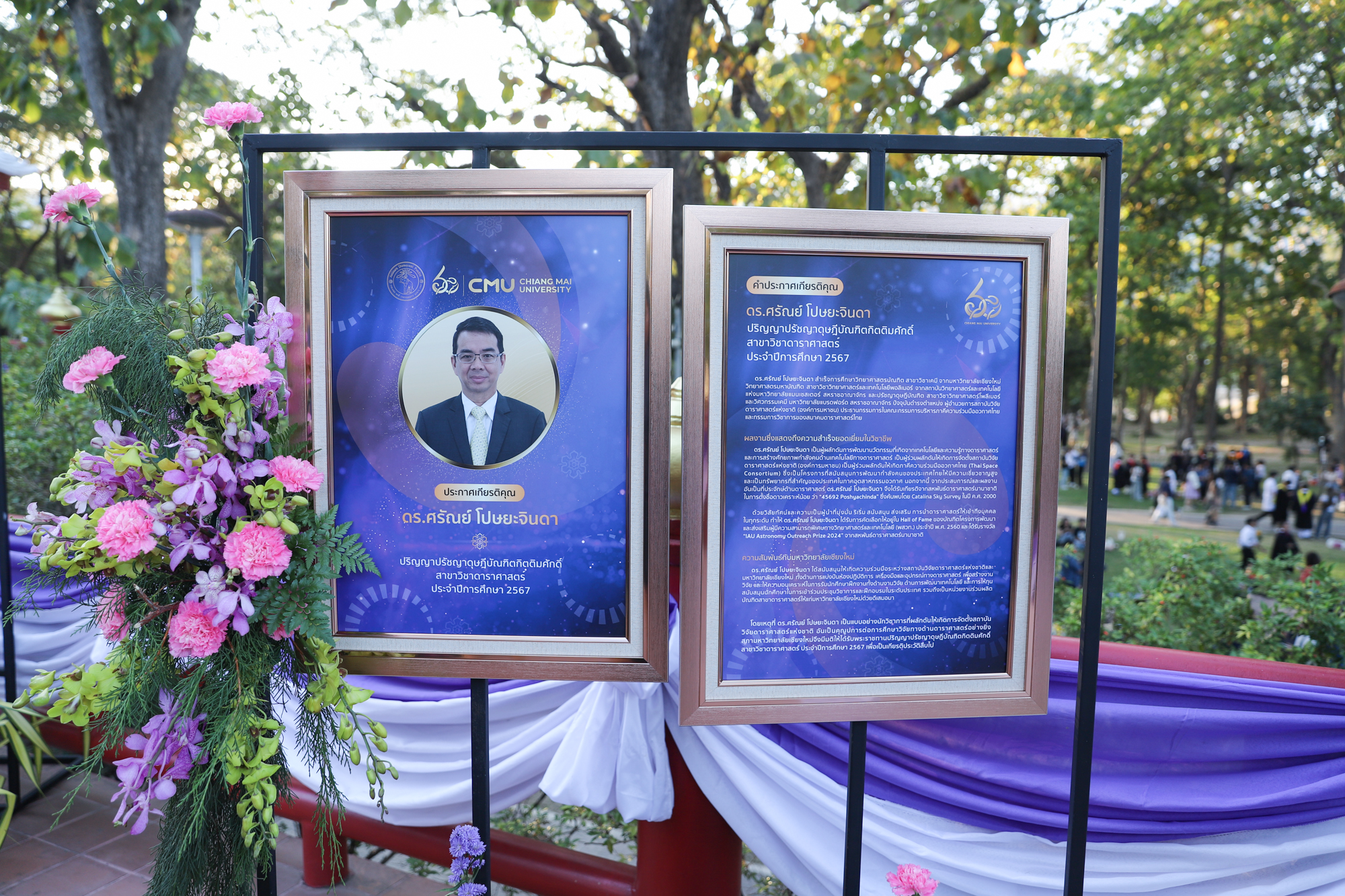ดร.ศรัณย์ โปษยะจินดา นักศึกษาเก่าคณะวิทยาศาสตร์ มหาวิทยาลัยเชียงใหม่ ซึ่งได้เข้ารับพระราชทานปริญญาปรัชญาดุษฎีบัณฑิตกิตติมศักดิ์ สาขาวิชาดาราศาสตร์ ประจำปีการศึกษา 2567 เข้ารับการเชิดชูเกียรติในงานแสดงความยินดีกับผู้ที่ได้รับพระราชทานปริญญากิตติมศักดิ์ ในงานพิธีพระราชทานปริญญาบัตร ครั้งที่ 59 ประจำปีการศึกษา 2566-2567 ณ ศาลาธรรม มหาวิทยาลัยเชียงใหม่ เมื่อวันพุธที่ 15 มกราคม 2568 โดยมีศาสตราจารย์พิเศษ ดร.สุรเกียรติ์ เสถียรไทย นายกสภามหาวิทยาลัยเชียงใหม่ กล่าวแสดงความยินดี มอบเกียรติบัตร และมอบช่อดอกไม้ ศาสตราจารย์ ดร.นพ.พงษ์รักษ์ ศรีบัณฑิตมงคล อธิการบดีมหาวิทยาลัยเชียงใหม่ มอบภาพถ่ายฯ นายสุมิตร เพชราภิรัชต์ นายกสมาคมนักศึกษาเก่ามหาวิทยาลัยเชียงใหม่ และคุณนารีรัตน์ จันทรมังกร ประธานกรรมการส่งเสริมมหาวิทยาลัยเชียงใหม่ มอบของที่ระลึก แก่ผู้ที่ได้รับพระราชทานปริญญากิตติมศักดิ์ ในโอกาสนี้ ศาสตราจารย์ (เชี่ยวชาญพิเศษ) ดร.ธรณินทร์ ไชยเรืองศรี คณบดีคณะวิทยาศาสตร์ เข้าร่วมแสดงความยินดีด้วย