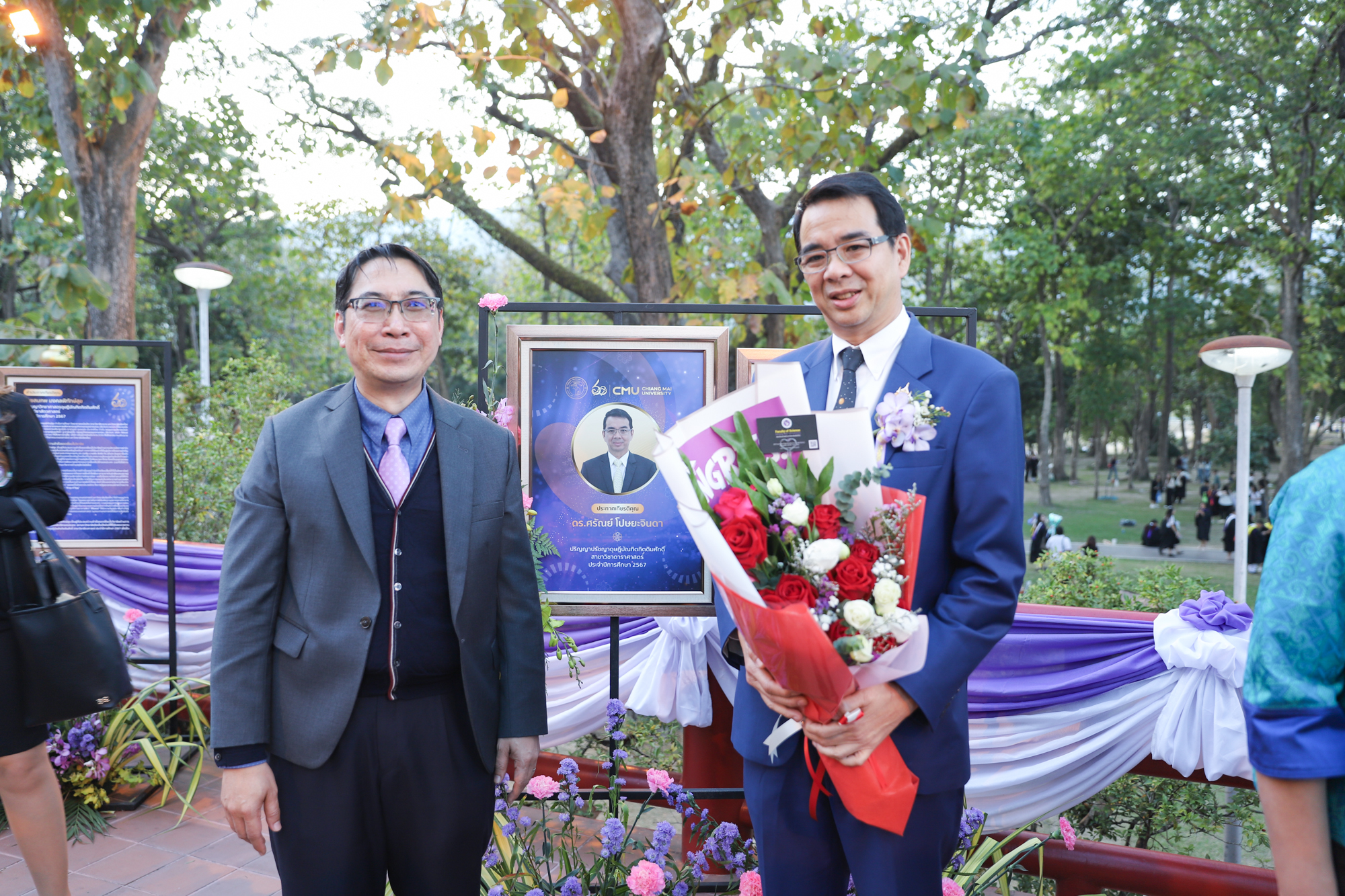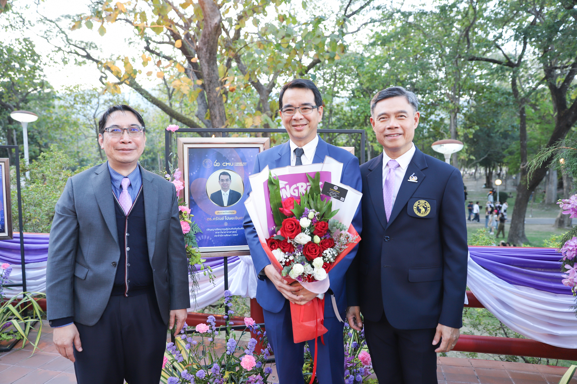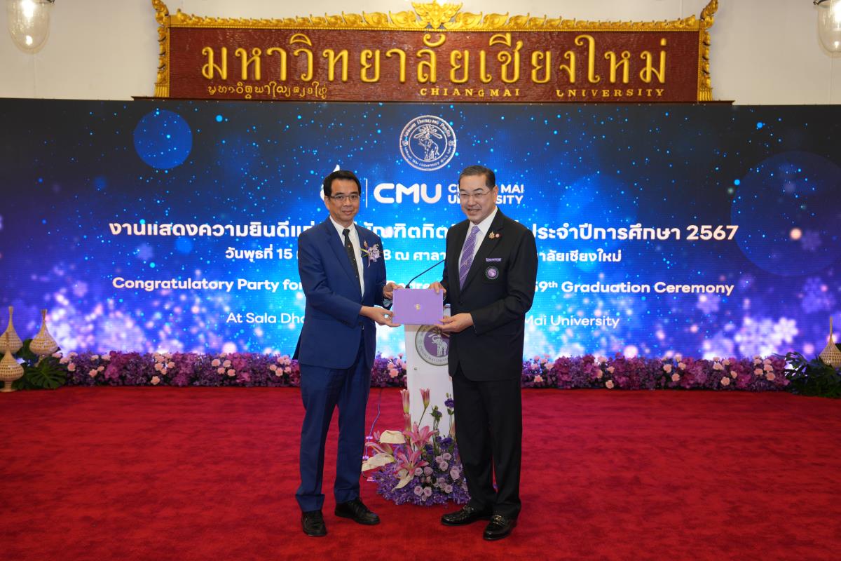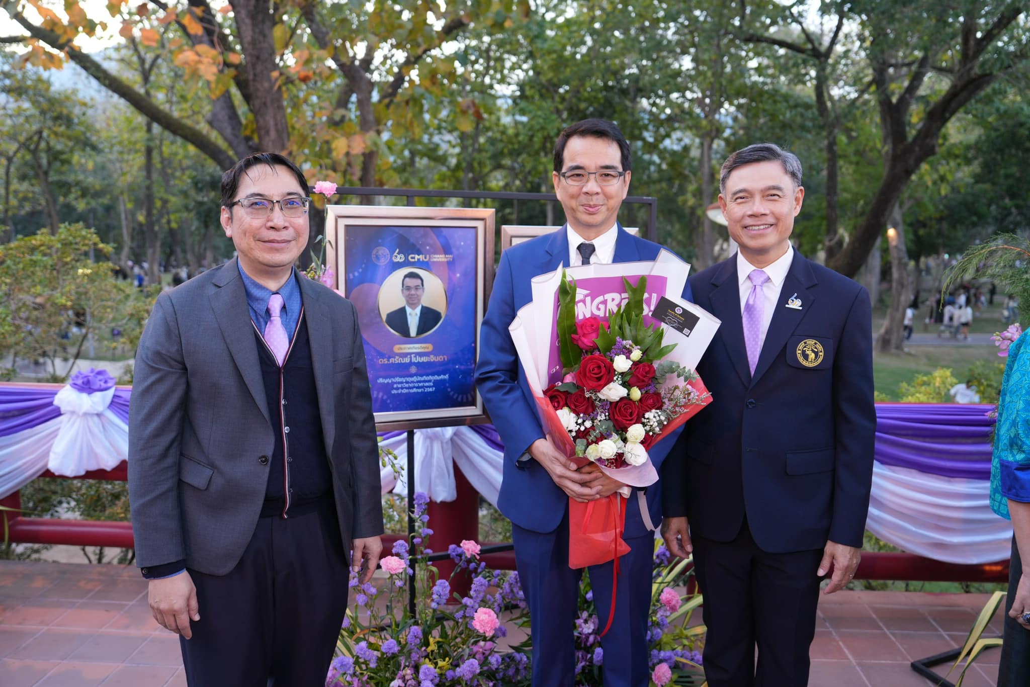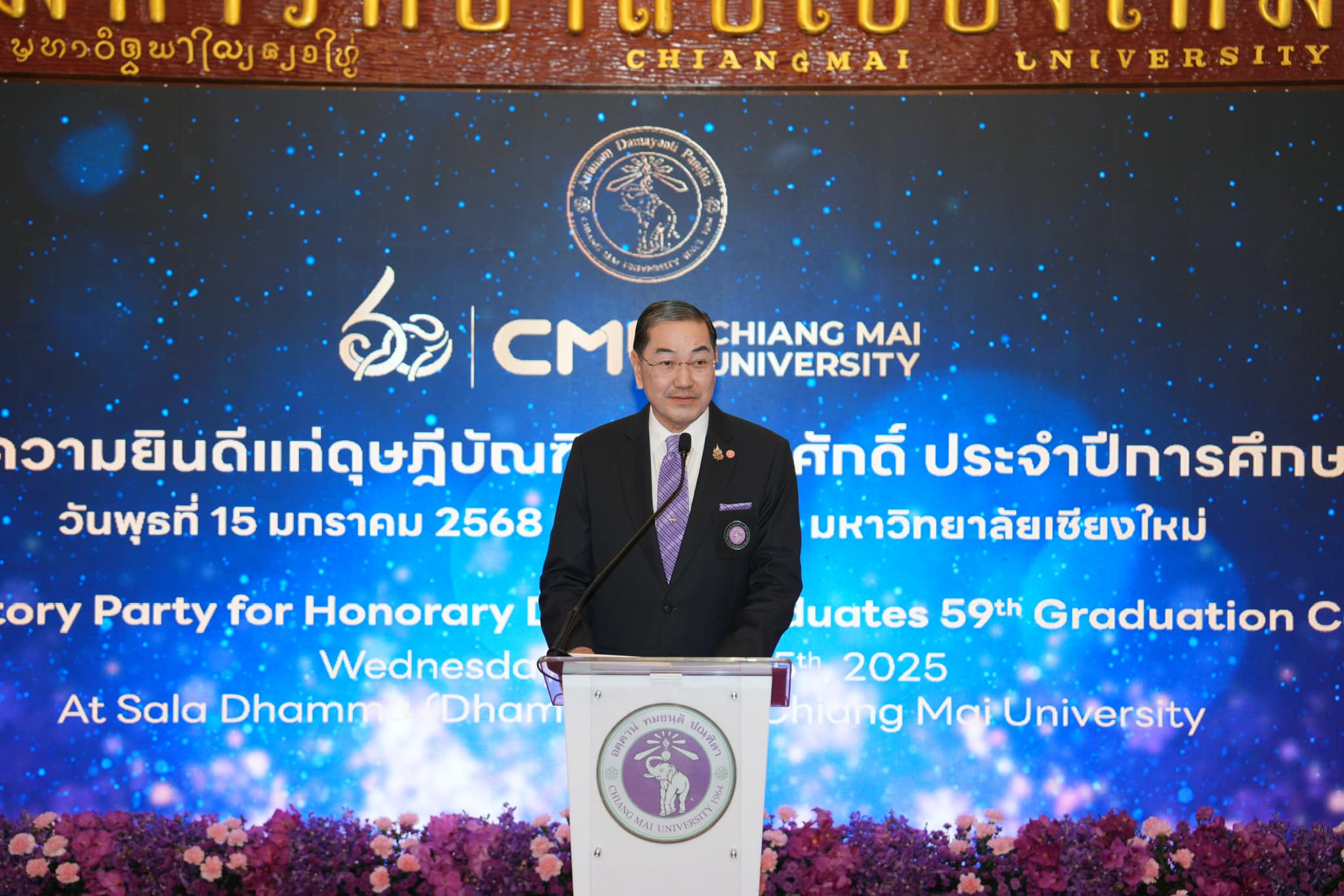 ดร.ศรัณย์ โปษยะจินดา นักศึกษาเก่าคณะวิทยาศาสตร์ มหาวิทยาลัยเชียงใหม่ ซึ่งได้เข้ารับพระราชทานปริญญาปรัชญาดุษฎีบัณฑิตกิตติมศักดิ์ สาขาวิชาดาราศาสตร์ ประจำปีการศึกษา 2567 เข้ารับการเชิดชูเกียรติในงานแสดงความยินดีกับผู้ที่ได้รับพระราชทานปริญญากิตติมศักดิ์ ในงานพิธีพระราชทานปริญญาบัตร ครั้งที่ 59 ประจำปีการศึกษา 2566-2567 ณ ศาลาธรรม มหาวิทยาลัยเชียงใหม่ เมื่อวันพุธที่ 15 มกราคม 2568 โดยมีศาสตราจารย์พิเศษ ดร.สุรเกียรติ์ เสถียรไทย นายกสภามหาวิทยาลัยเชียงใหม่ กล่าวแสดงความยินดี มอบเกียรติบัตร และมอบช่อดอกไม้ ศาสตราจารย์ ดร.นพ.พงษ์รักษ์ ศรีบัณฑิตมงคล อธิการบดีมหาวิทยาลัยเชียงใหม่ มอบภาพถ่ายฯ นายสุมิตร เพชราภิรัชต์ นายกสมาคมนักศึกษาเก่ามหาวิทยาลัยเชียงใหม่ และคุณนารีรัตน์ จันทรมังกร ประธานกรรมการส่งเสริมมหาวิทยาลัยเชียงใหม่ มอบของที่ระลึก แก่ผู้ที่ได้รับพระราชทานปริญญากิตติมศักดิ์ ในโอกาสนี้ ศาสตราจารย์ (เชี่ยวชาญพิเศษ) ดร.ธรณินทร์ ไชยเรืองศรี คณบดีคณะวิทยาศาสตร์ เข้าร่วมแสดงความยินดีด้วย