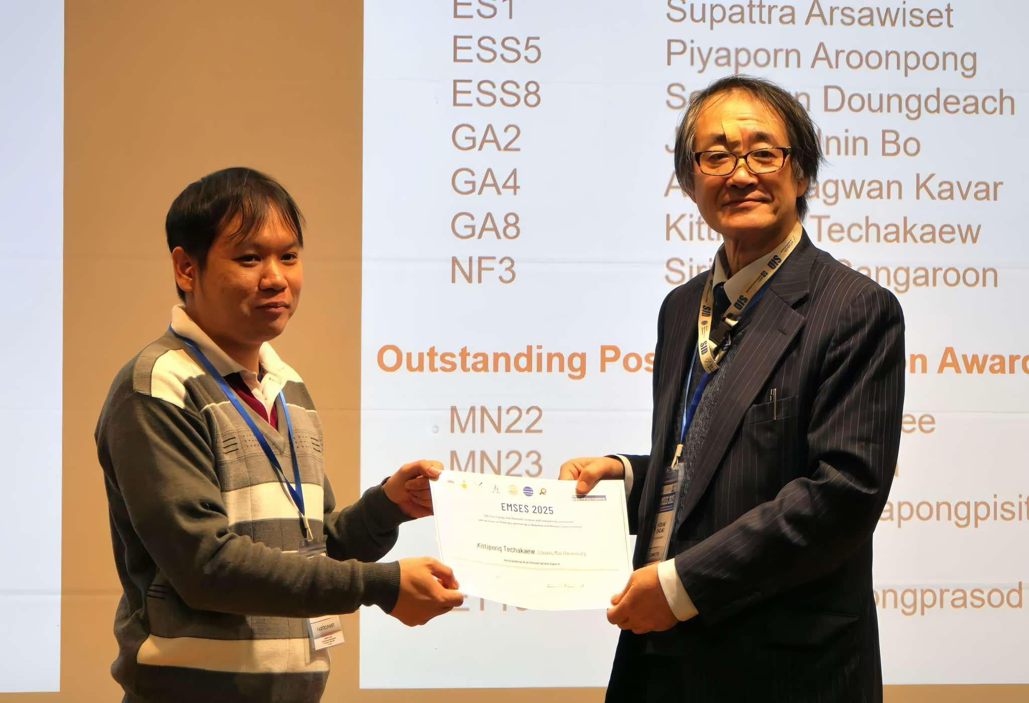 ขอแสดงความยินดีกับนักศึกษาปริญญาเอก ภาควิชาฟิสิกส์และวัสดุศาสตร์ คณะวิทยาศาสตร์ จากห้องปฏิบัติการวิจัยเครื่องเร่งอิเล็กตรอนเชิงเส้น ที่ได้รับรางวัลการนำเสนอผลงาน ในการประชุมวิชาการนานาชาติ The 16th Eco-Energy and Materials Science and Engineering Symposium (EMSES 2025) ณ มหาวิทยาลัยเกียวโต เมืองเกียวโต ประเทศญี่ปุ่น ระหว่างวันที่ 8 – 10 มกราคม 2568 ดังนี้