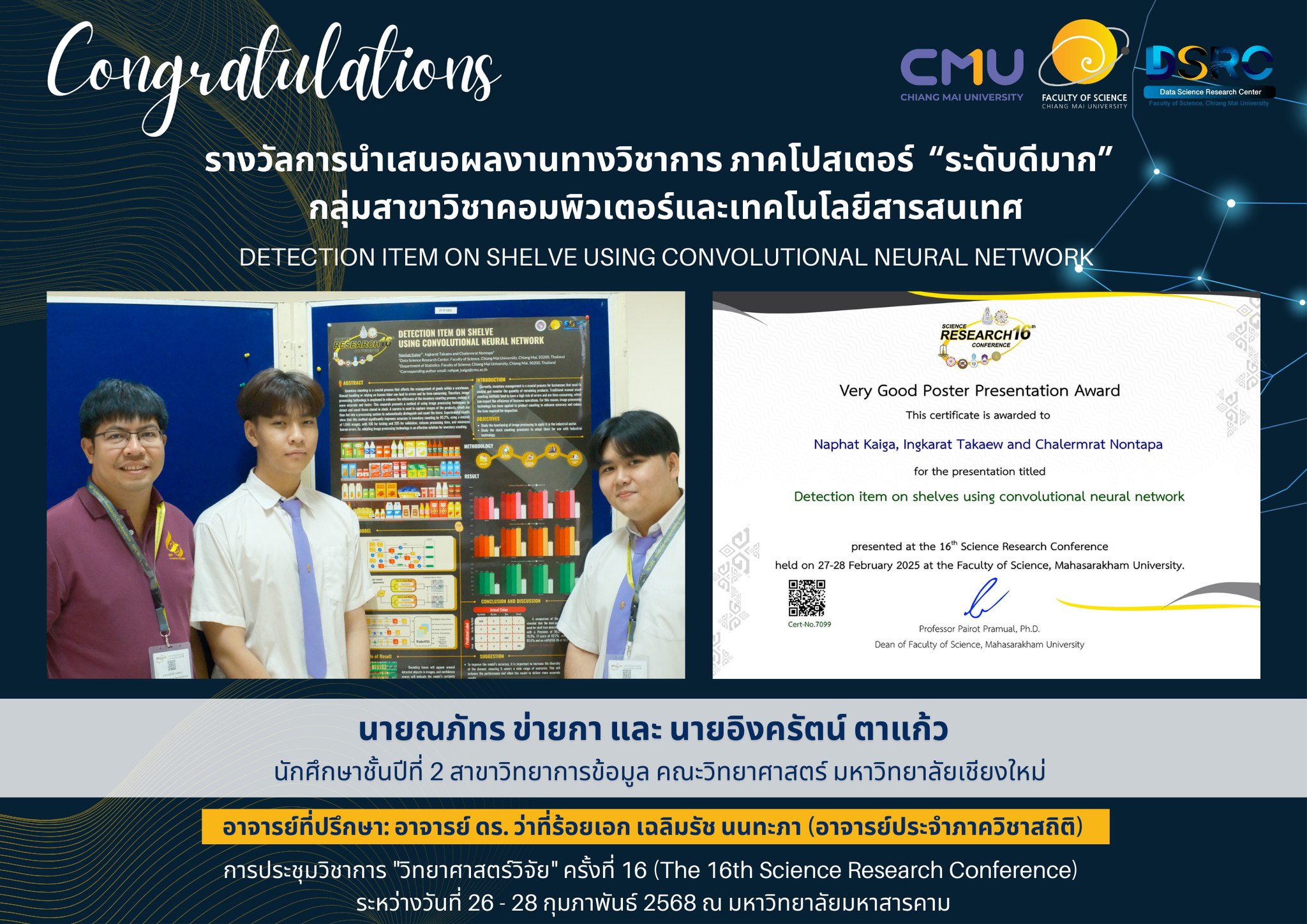 3. รางวัลการประกวดนำเสนอผลงานทางวิชาการ (ภาคโปสเตอร์) "รางวัลระดับดีมาก (Very Good)" กลุ่มคอมพิวเตอร์และเทคโนโลยีสารสนเทศ